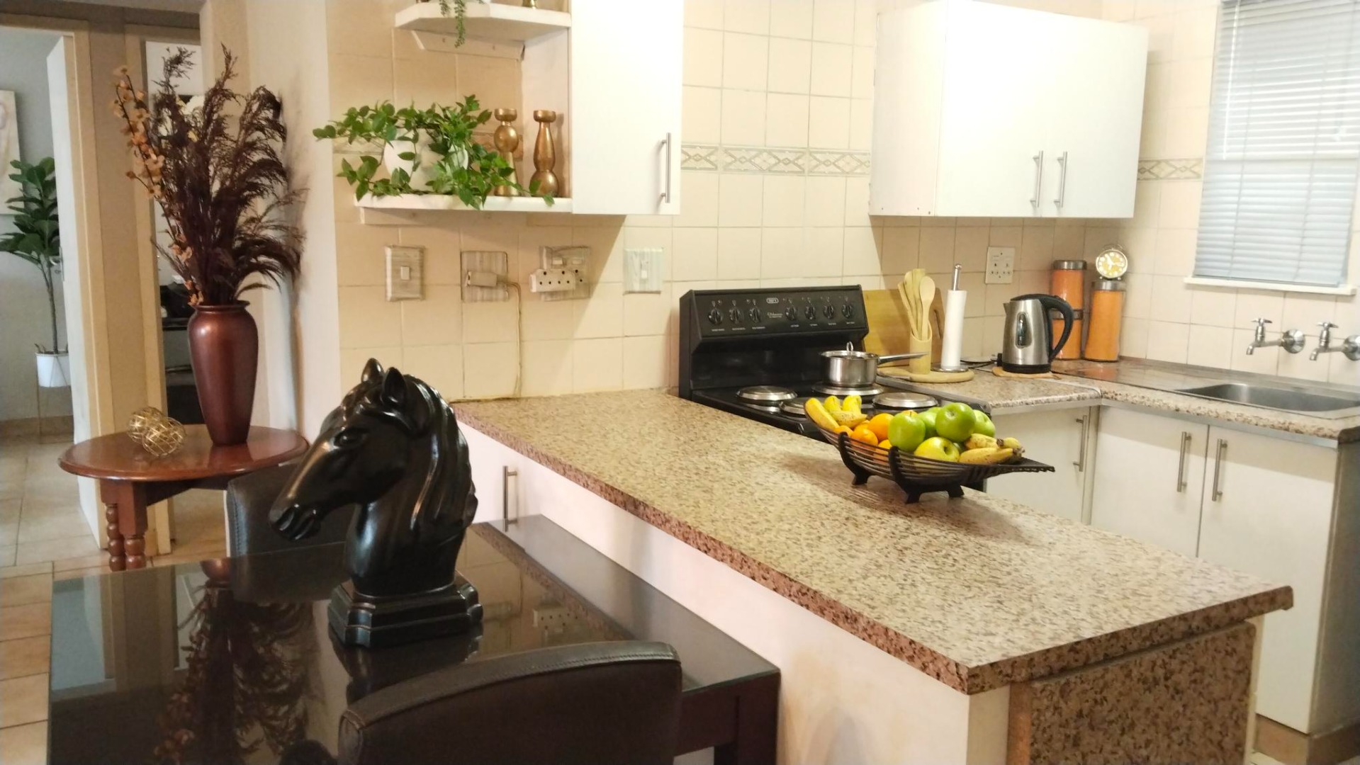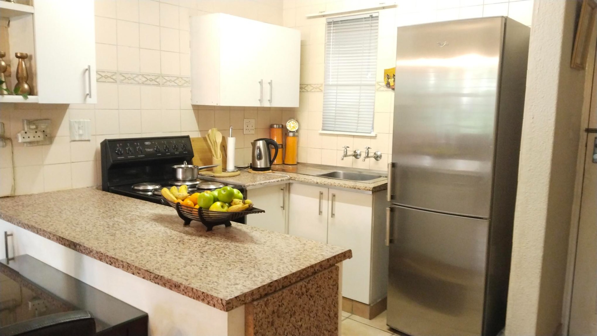 The kitchen, with its granite countertops and tiled walls, is ready for your culinary adventures.