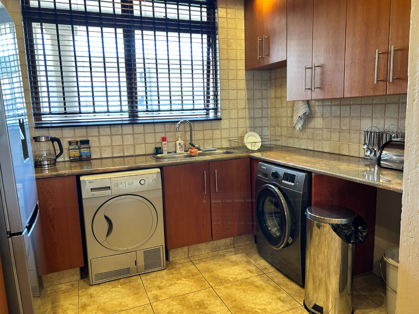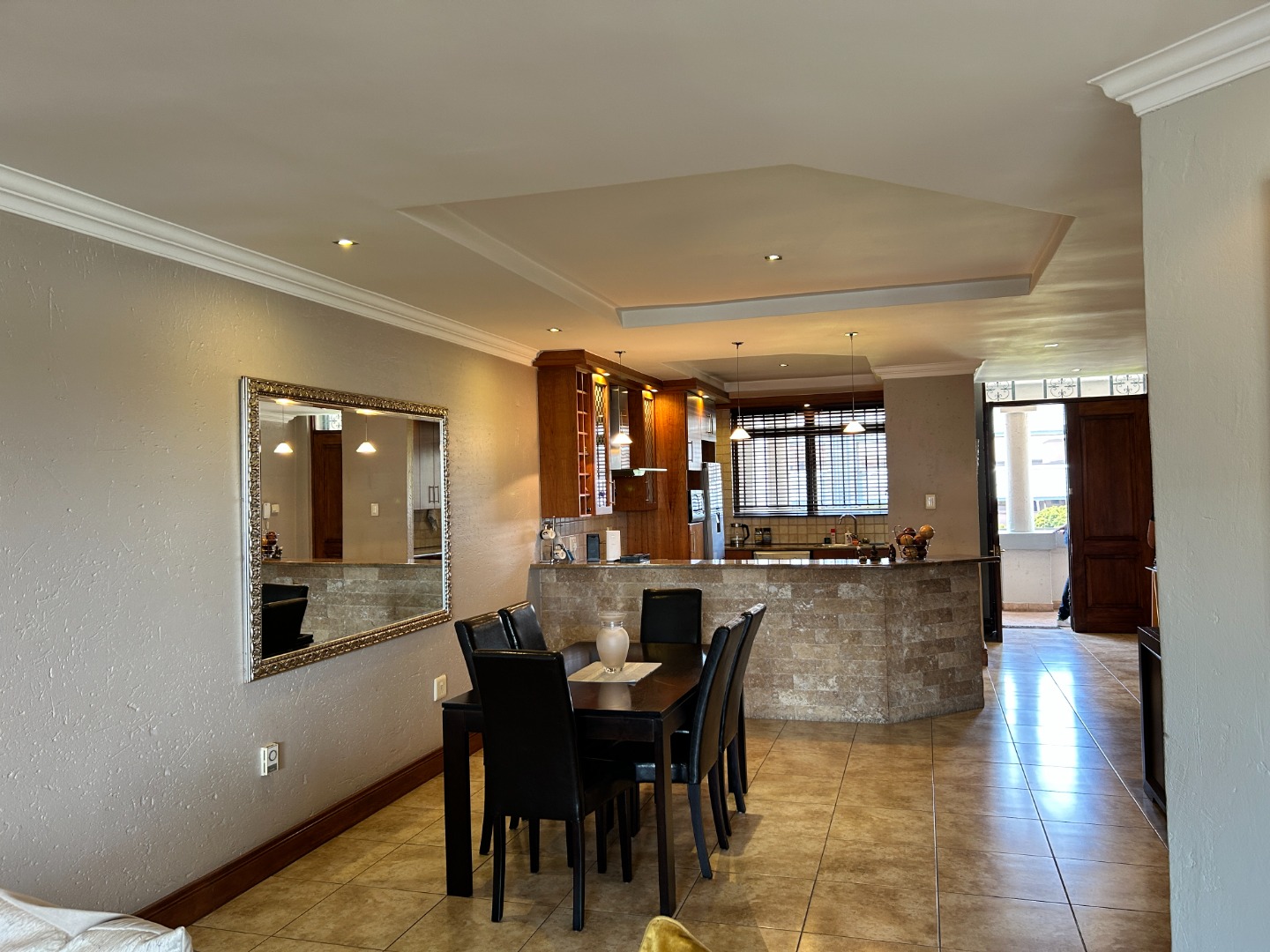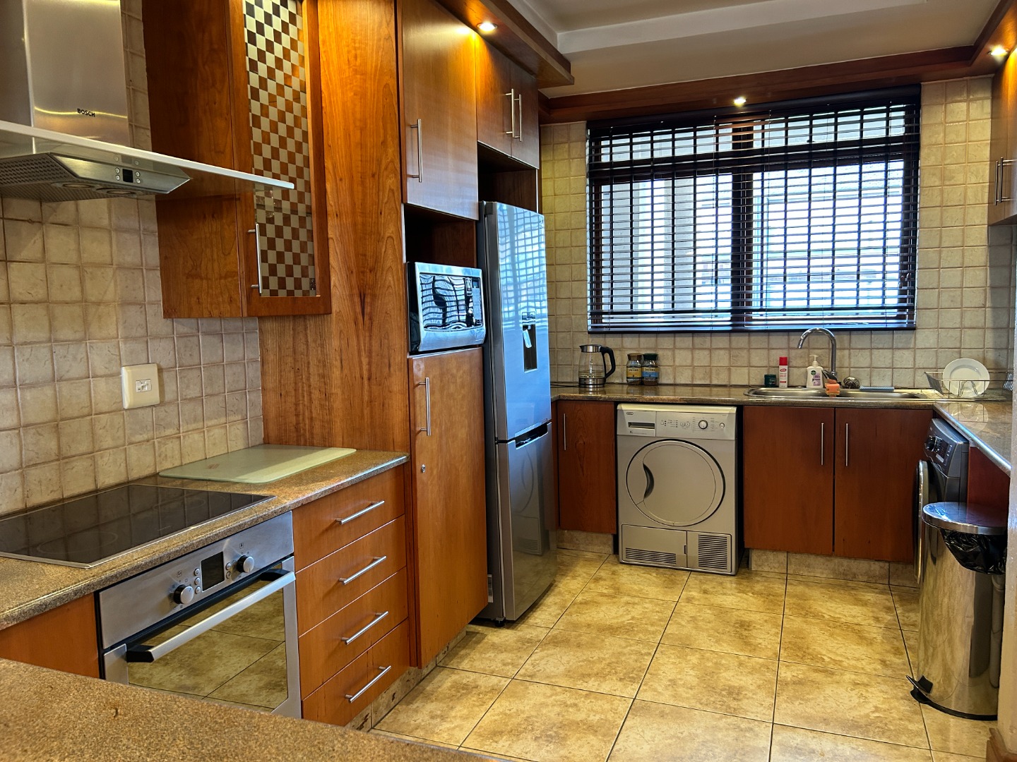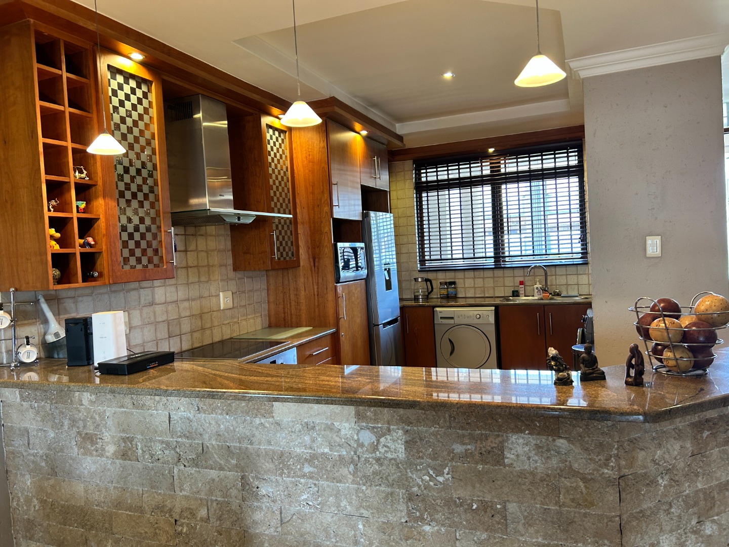 Step through double doors into a bright, tiled entrance hall that leads into a well-planned living space. The open-plan kitchen features granite countertops, a breakfast nook, hob and undercounter oven, extractor fan, and ample cabinetry. With space for three undercounter appliances and a fridge, it’s a kitchen designed for efficiency and flow.
