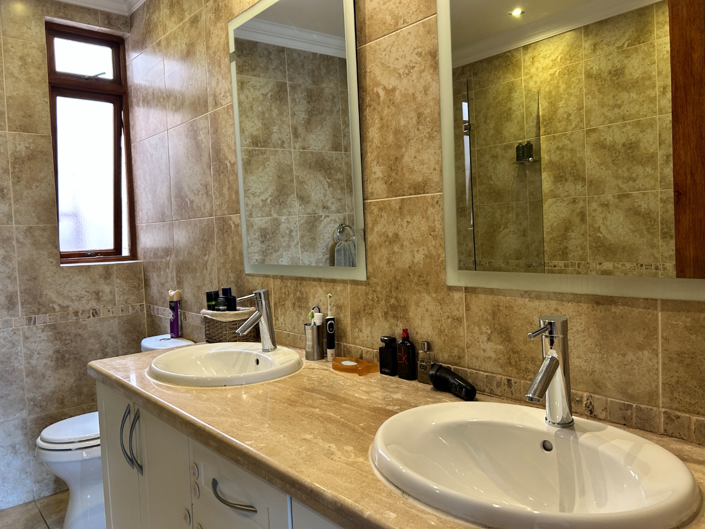 Both bedrooms are spacious and well-appointed with extensive cupboard space. The main suite offers direct access to the patio and a sleek en-suite bathroom with bath, shower, and loo. The second bedroom is equally inviting, complemented by a full second bathroom.