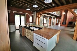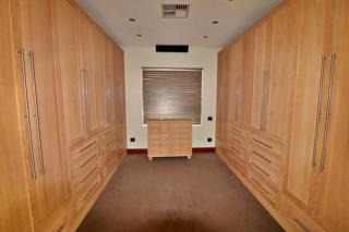 Outdoors, a large wooden deck with an integrated swimming pool and covered patio creates an ideal setting for relaxation and entertaining, complete with a built-in braai, rotating spit and build in coffee machine. The well-maintained garden benefits from an irrigation system, and pets are welcome. A truly unique offering is the expansive garaging for 14 vehicles, providing unparalleled space for car enthusiasts or extensive storage. The property also includes domestic rooms, air conditioning and central heating.