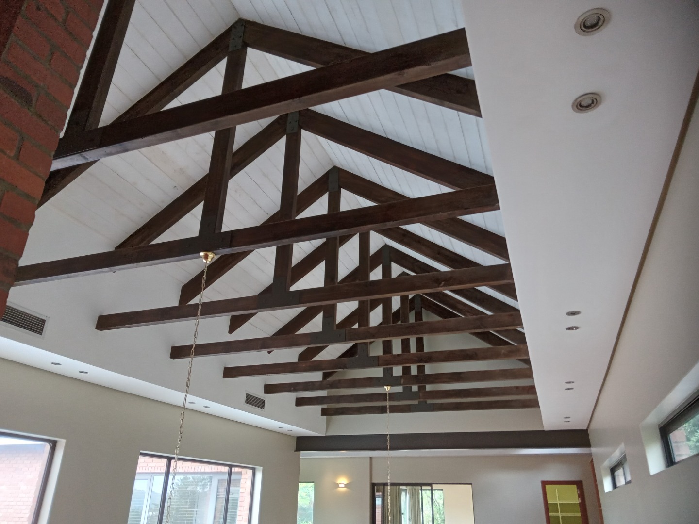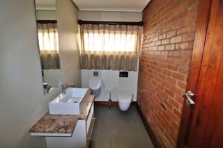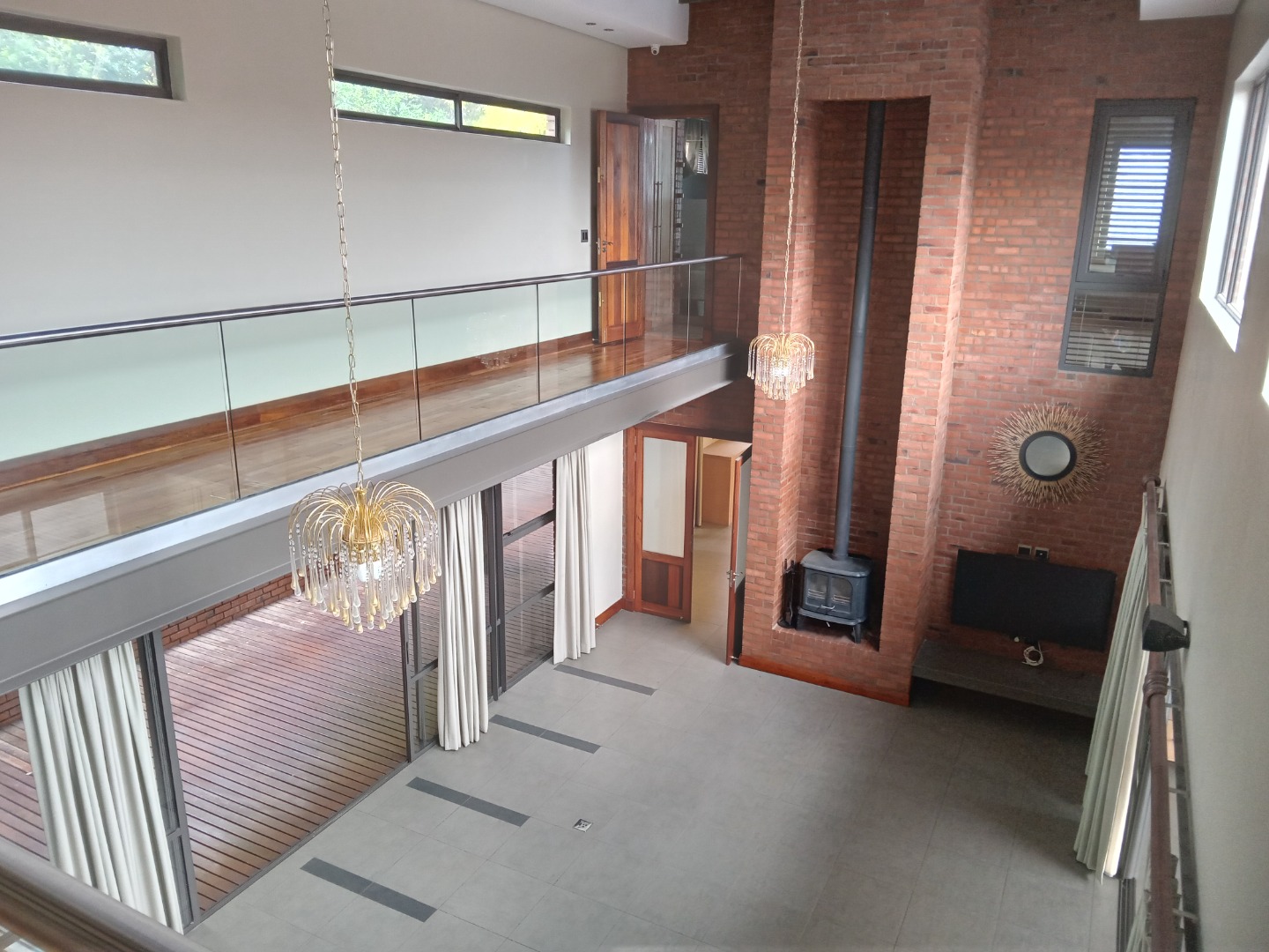 This modern residential property in Bedfordview showcases a striking architectural design, blending red brick and natural stone with expansive windows that invite abundant natural light. The multi-story home features a spacious, open-concept interior with two lounges, a dining room, and a dedicated family TV room, all designed for seamless living and entertaining. High ceilings, exposed timber beams, and an accent brick wall with a wood-burning stove add character. The contemporary kitchen includes a pantry, while a stylish glass and metal lift connects the levels. Accommodation comprises three comfortable bedrooms, three en-suite bathrooms, a guest toilet, and a dedicated study.