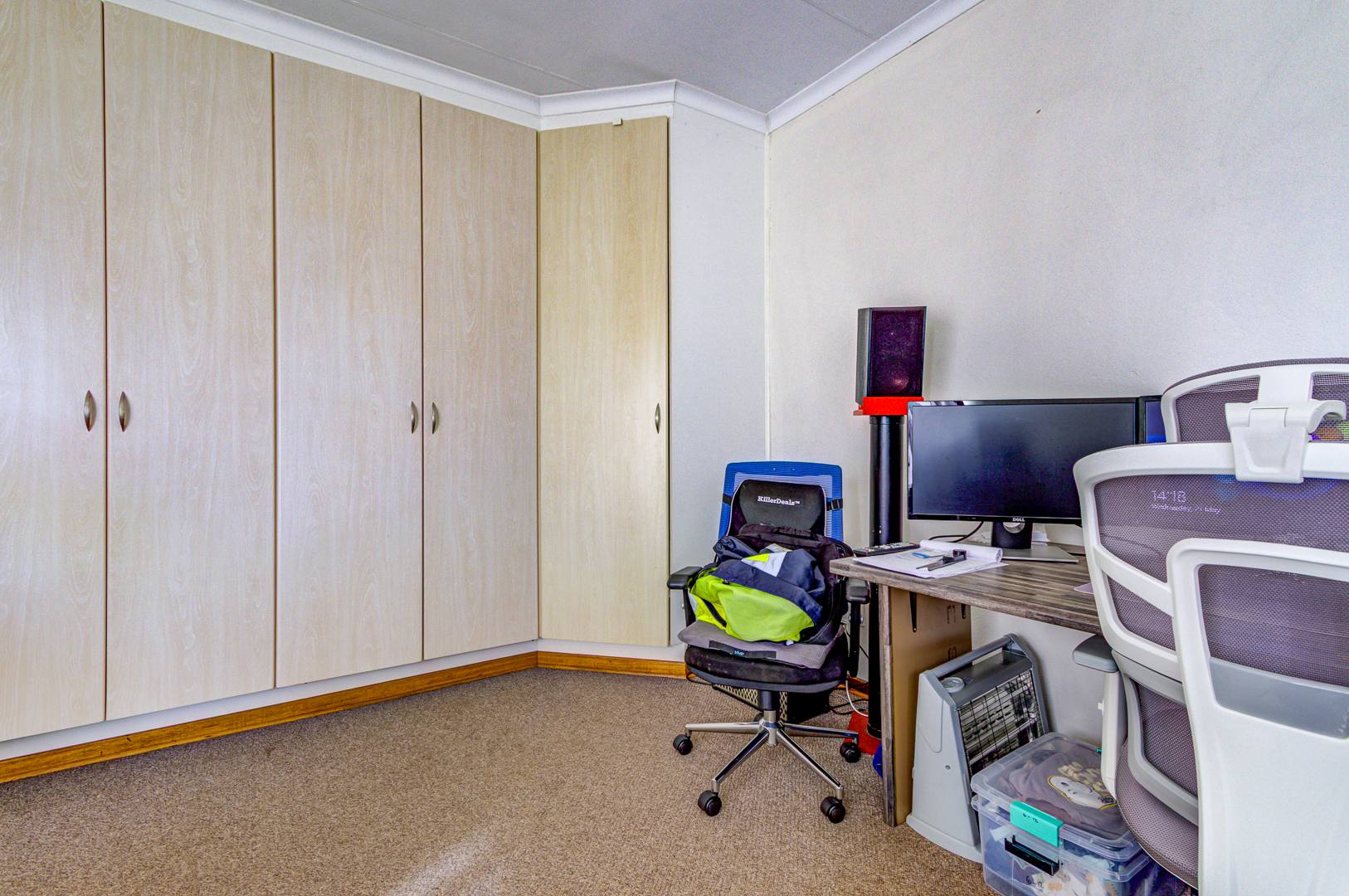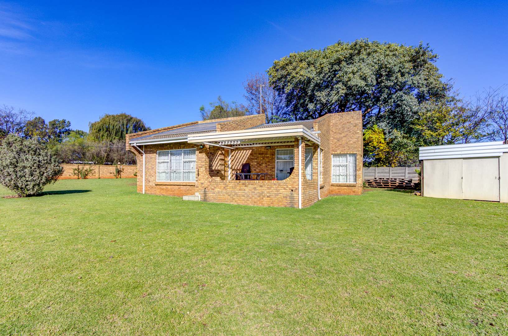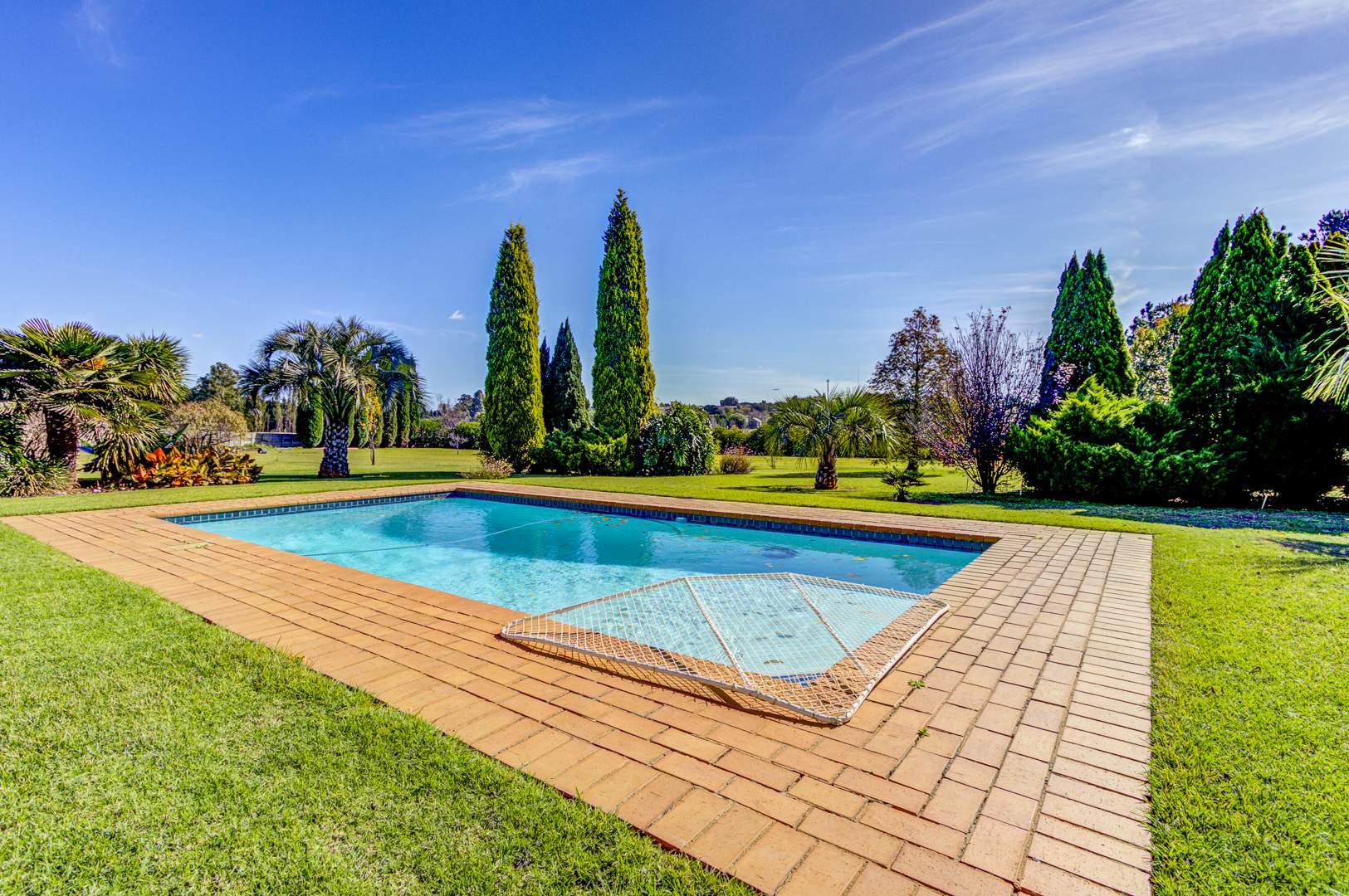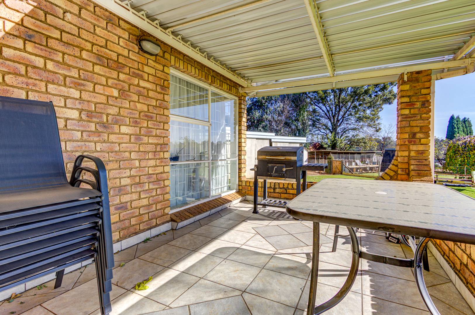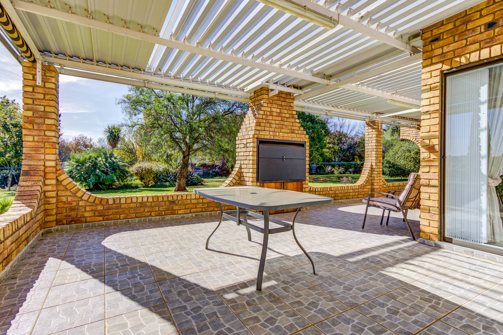 Flowing seamlessly from the kitchen is a generous open-plan living and dining area, which opens onto a large patio via dual aluminium sliding doors. Here, you’ll find a built-in braai and a sparkling, heated swimming pool surrounded by lush, rolling lawns—ideal for outdoor gatherings or peaceful relaxation.
