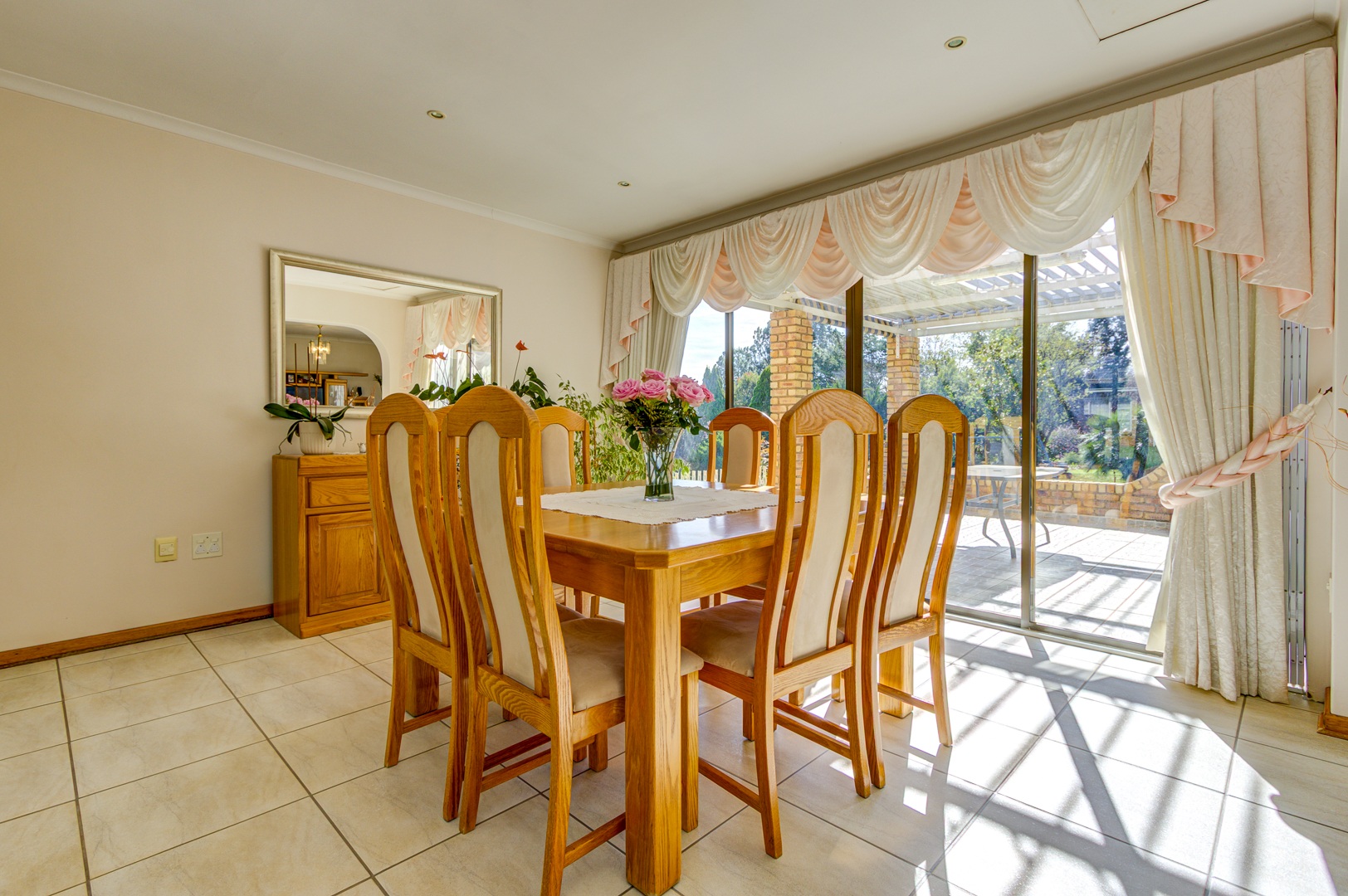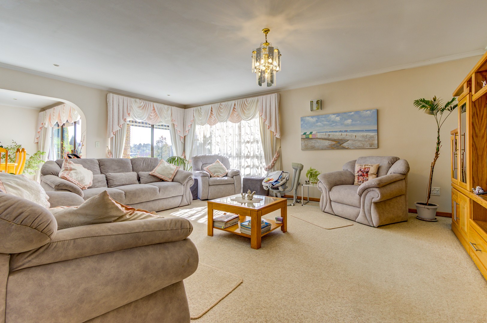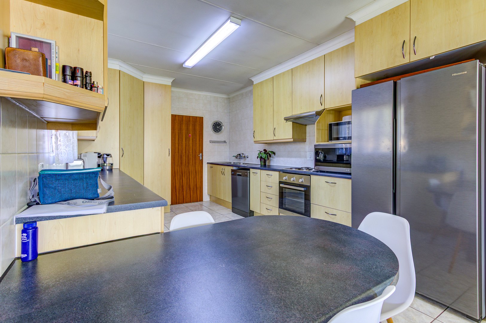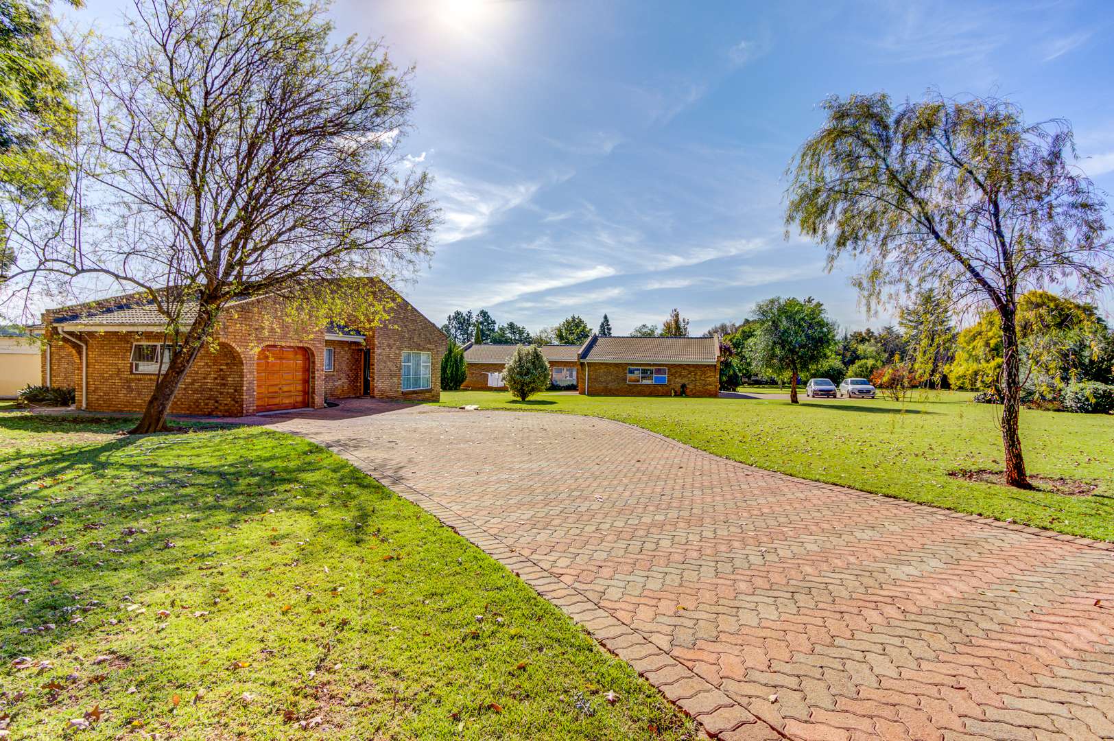 Flowing seamlessly from the kitchen is a generous open-plan living and dining area, which opens onto a large patio via dual aluminium sliding doors. Here, you’ll find a built-in braai and a sparkling, heated swimming pool surrounded by lush, rolling lawns—ideal for outdoor gatherings or peaceful relaxation.