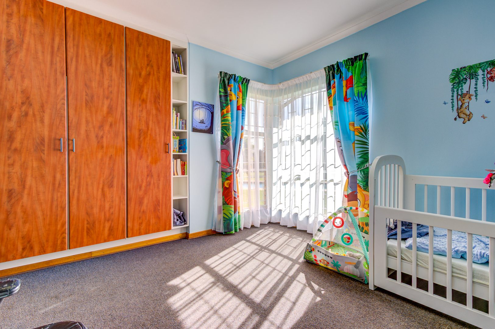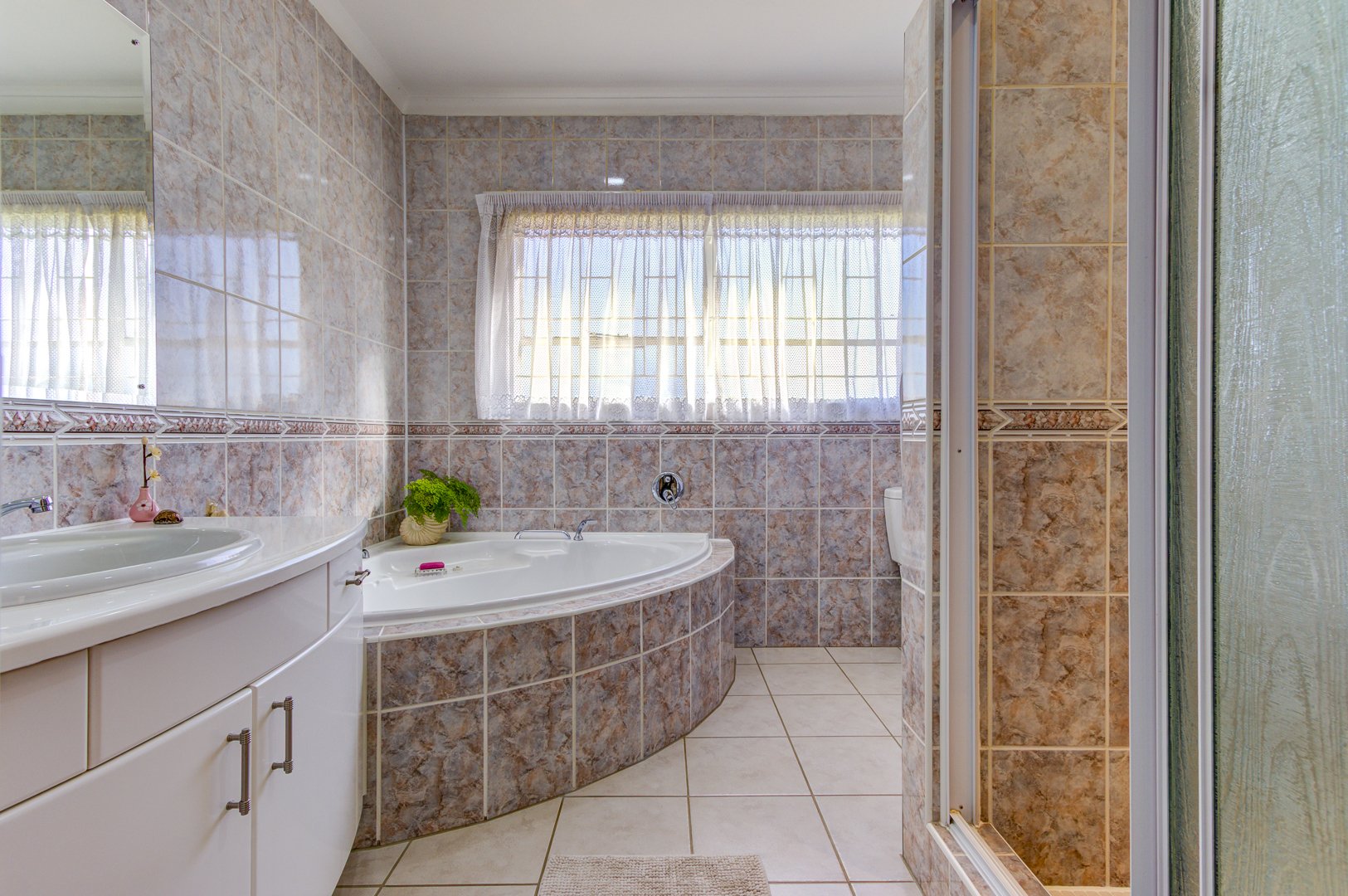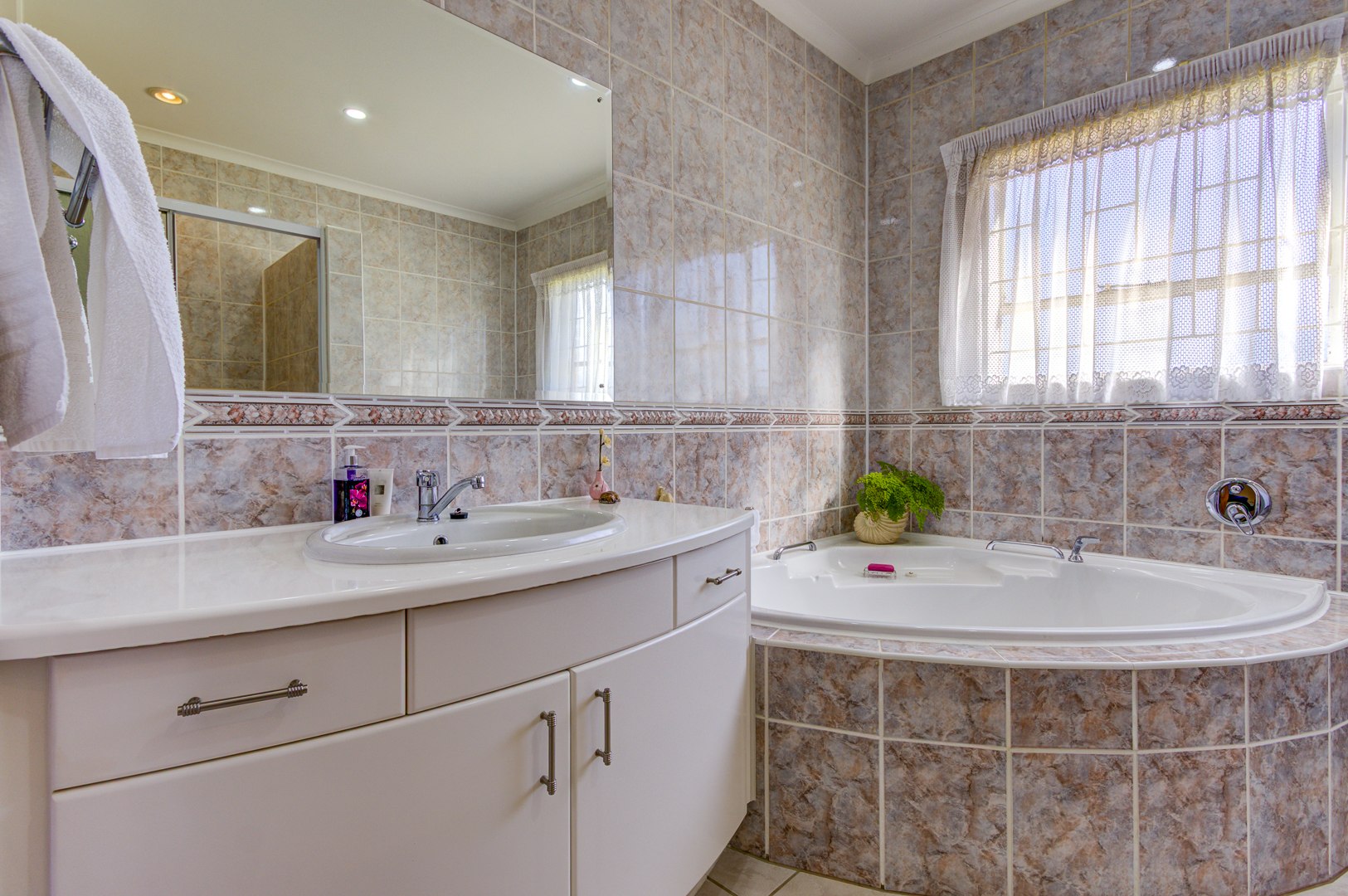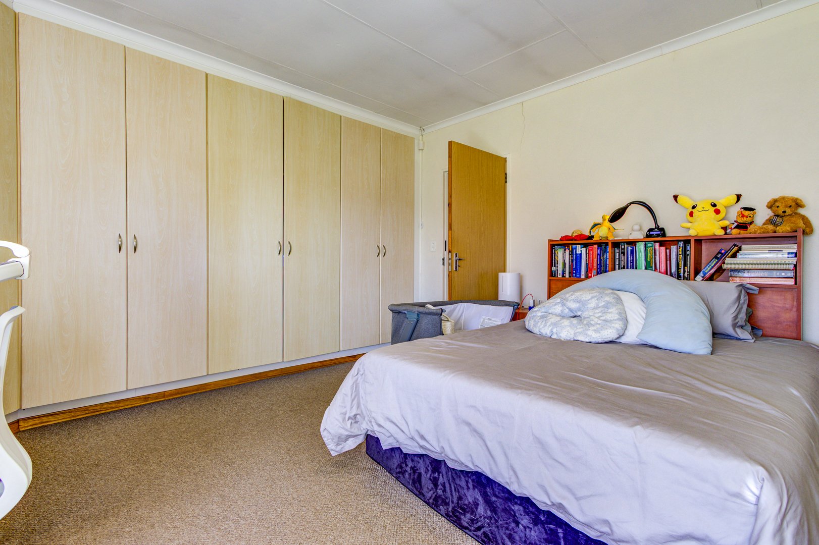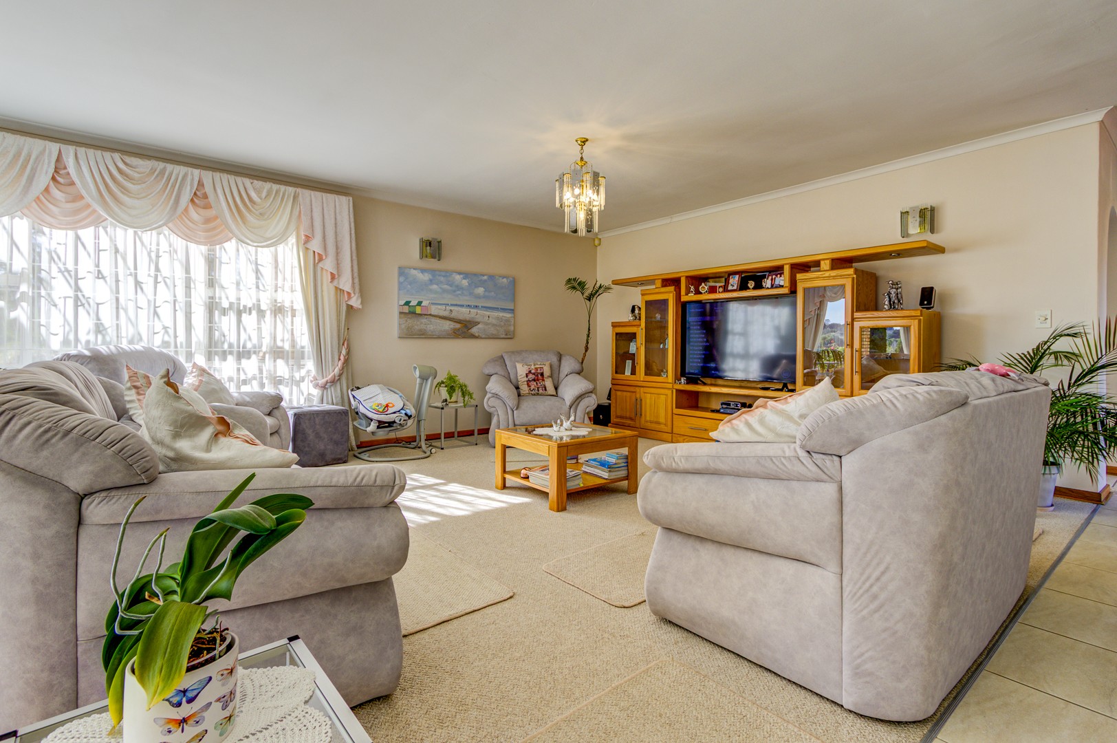Flowing seamlessly from the kitchen is a generous open-plan living and dining area, which opens onto a large patio via dual aluminium sliding doors. Here, you’ll find a built-in braai and a sparkling, heated swimming pool surrounded by lush, rolling lawns—ideal for outdoor gatherings or peaceful relaxation.