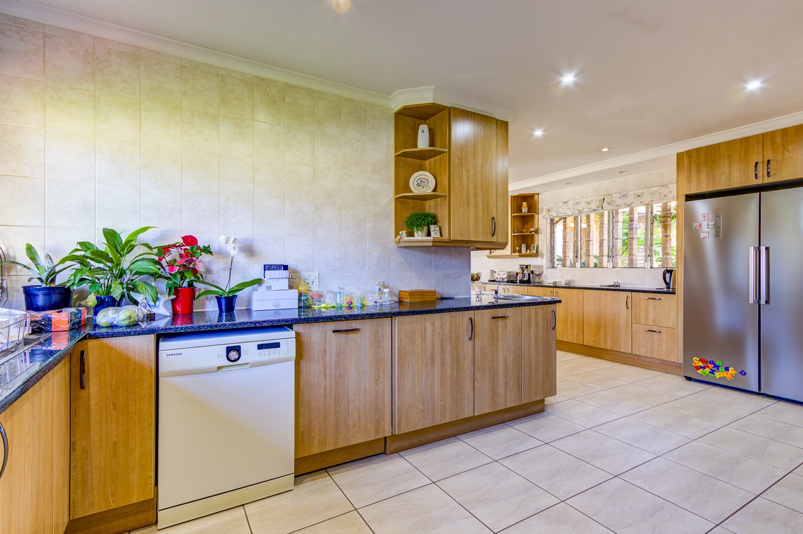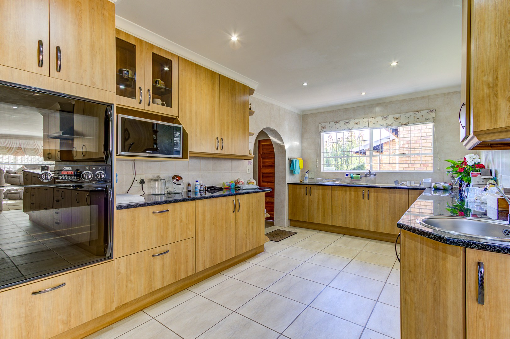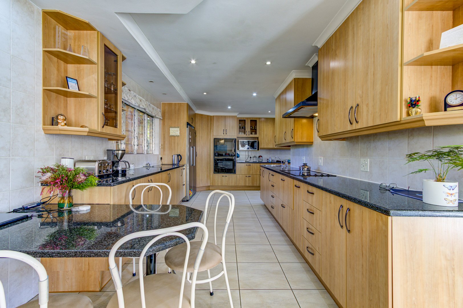From the moment you enter through the spacious foyer, you're greeted by an elegant sunken lounge to your right and a chef’s dream kitchen to your left. The well-appointed kitchen features granite countertops, an eye-level oven, ample cabinetry, a breakfast counter, separate scullery, and a laundry room—perfect for both everyday living and entertaining.