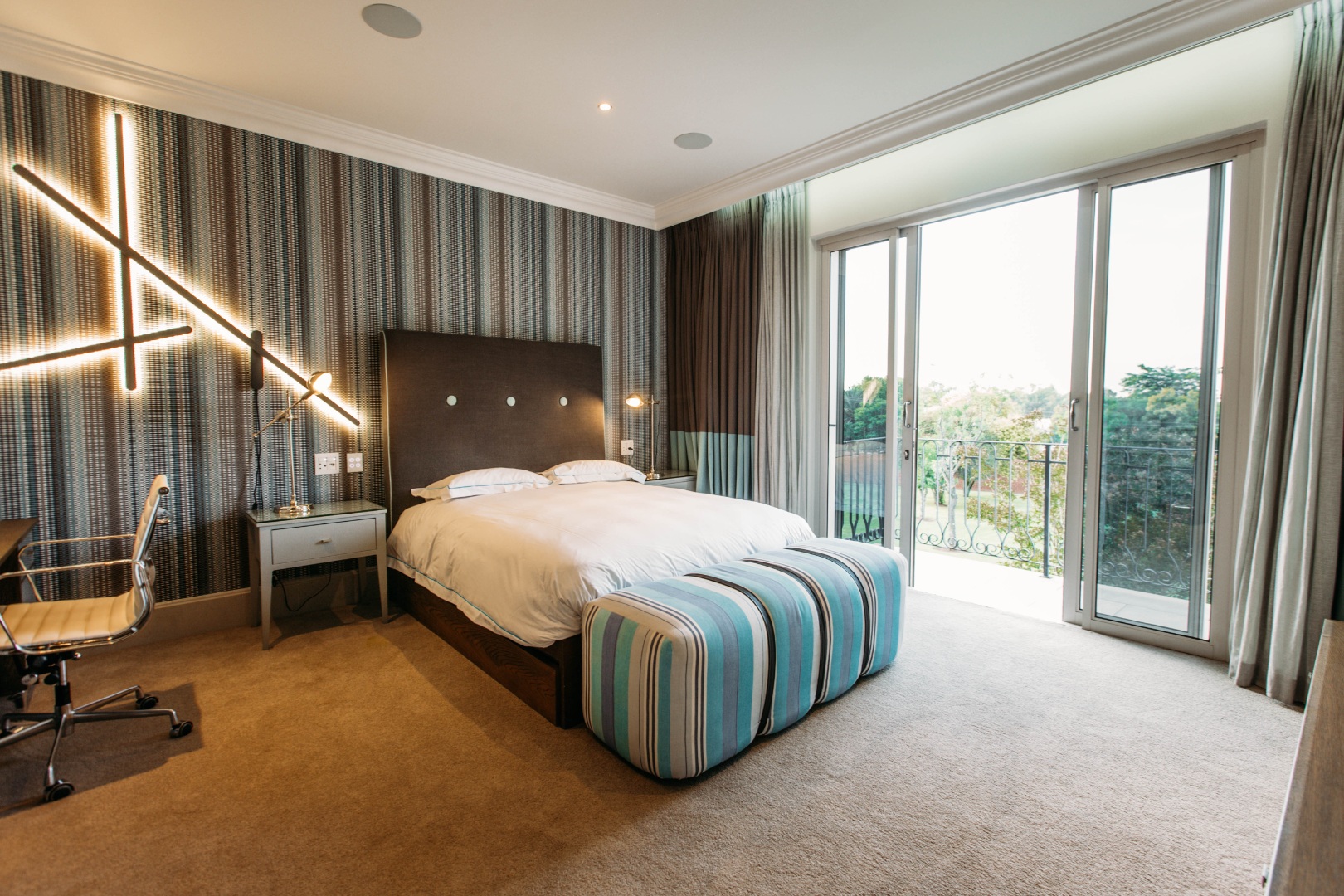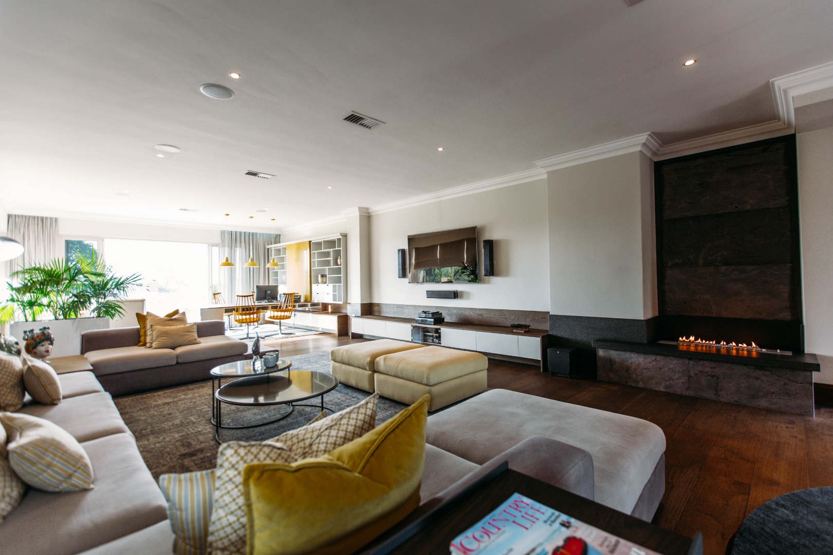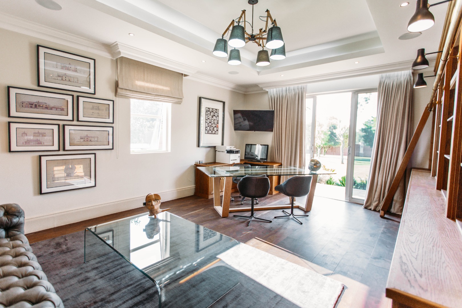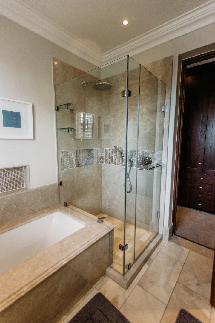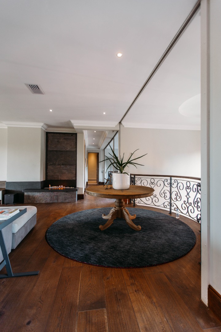 The upper level opens onto an extremely large family TV lounge with fireplace, various seating areas, study area and coffee station, opening onto a large balcony overlooking the sparkling pool and well-maintained lawns. A wonderful space for family to relax and unwind. From there you enter 3 bedrooms, all with balconies and en-suite bathrooms. The main bedroom has a well-fitted dressing room with loads of space for all the seasonal changes and a stunning bathroom.