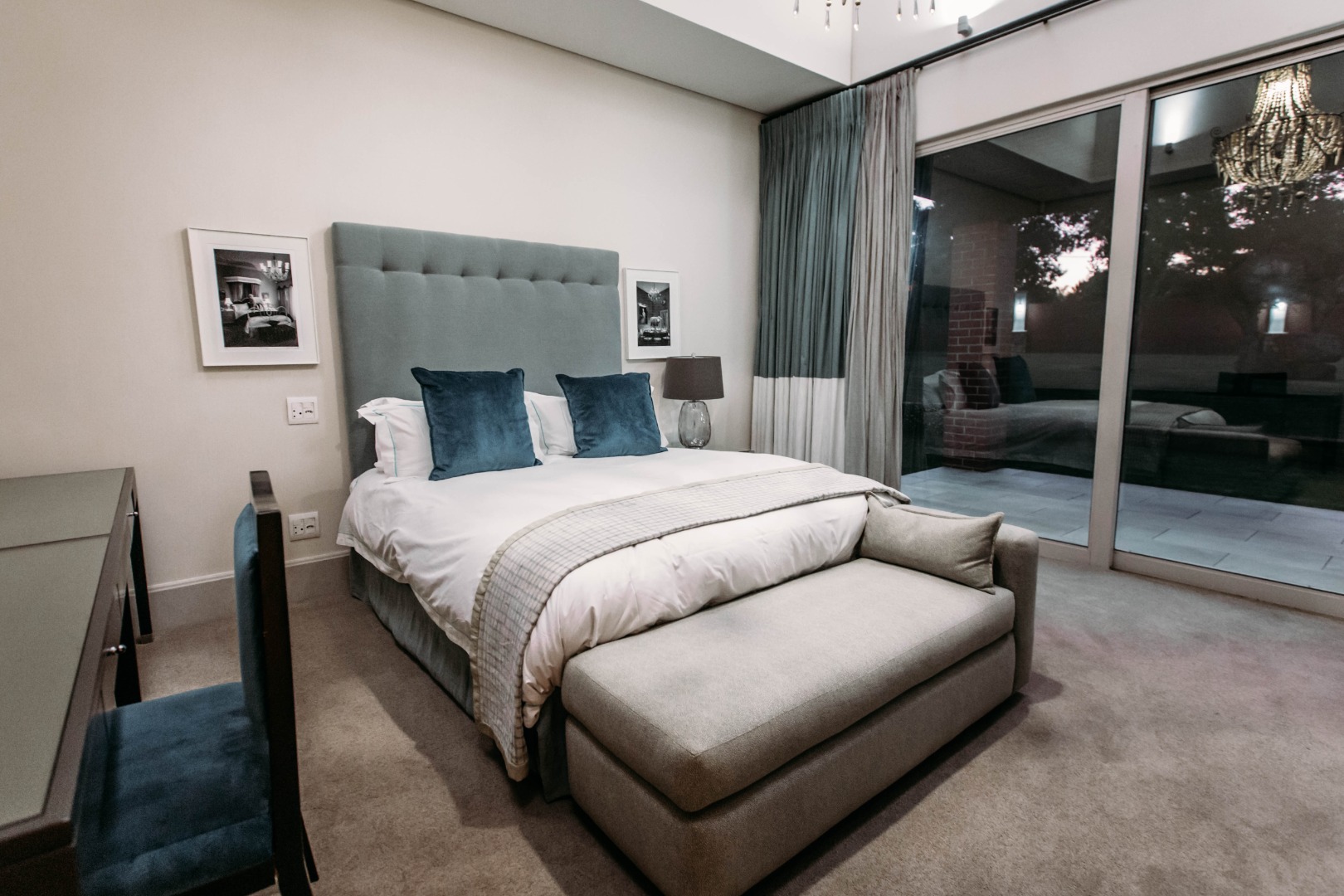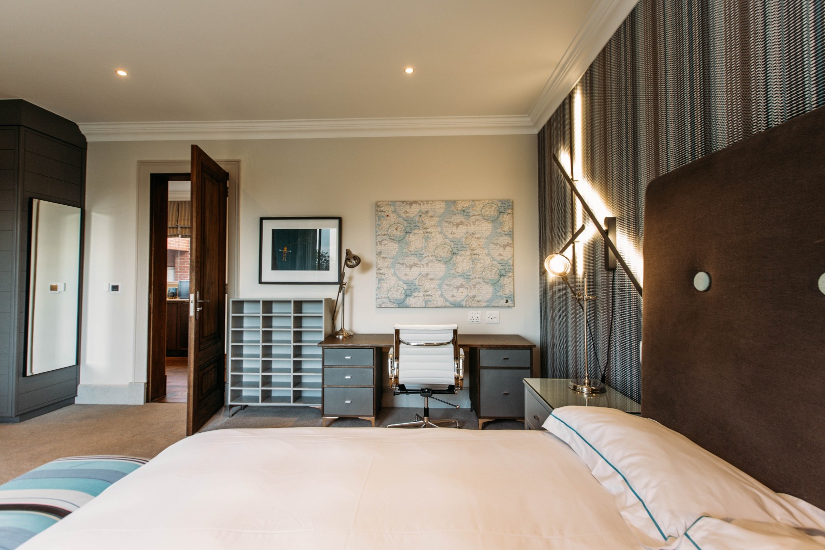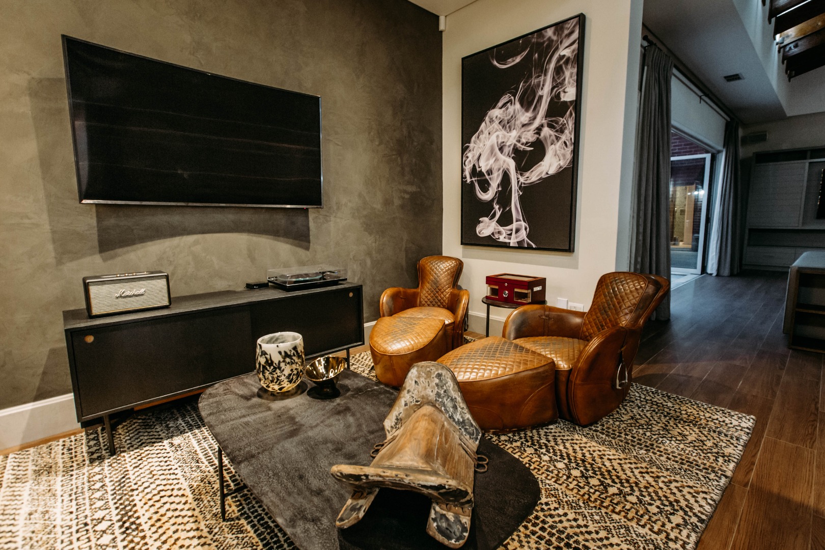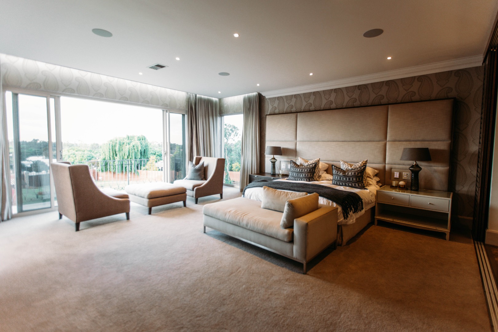 The upper level opens onto an extremely large family TV lounge with fireplace, various seating areas, study area and coffee station, opening onto a large balcony overlooking the sparkling pool and well-maintained lawns. A wonderful space for family to relax and unwind. From there you enter 3 bedrooms, all with balconies and en-suite bathrooms. The main bedroom has a well-fitted dressing room with loads of space for all the seasonal changes and a stunning bathroom.