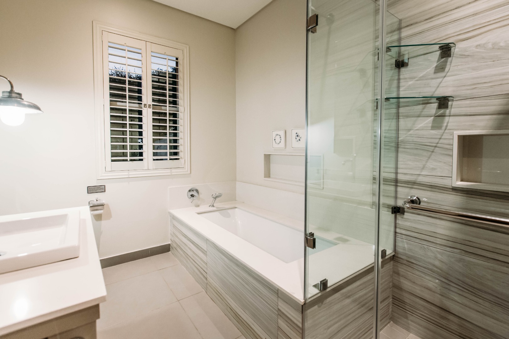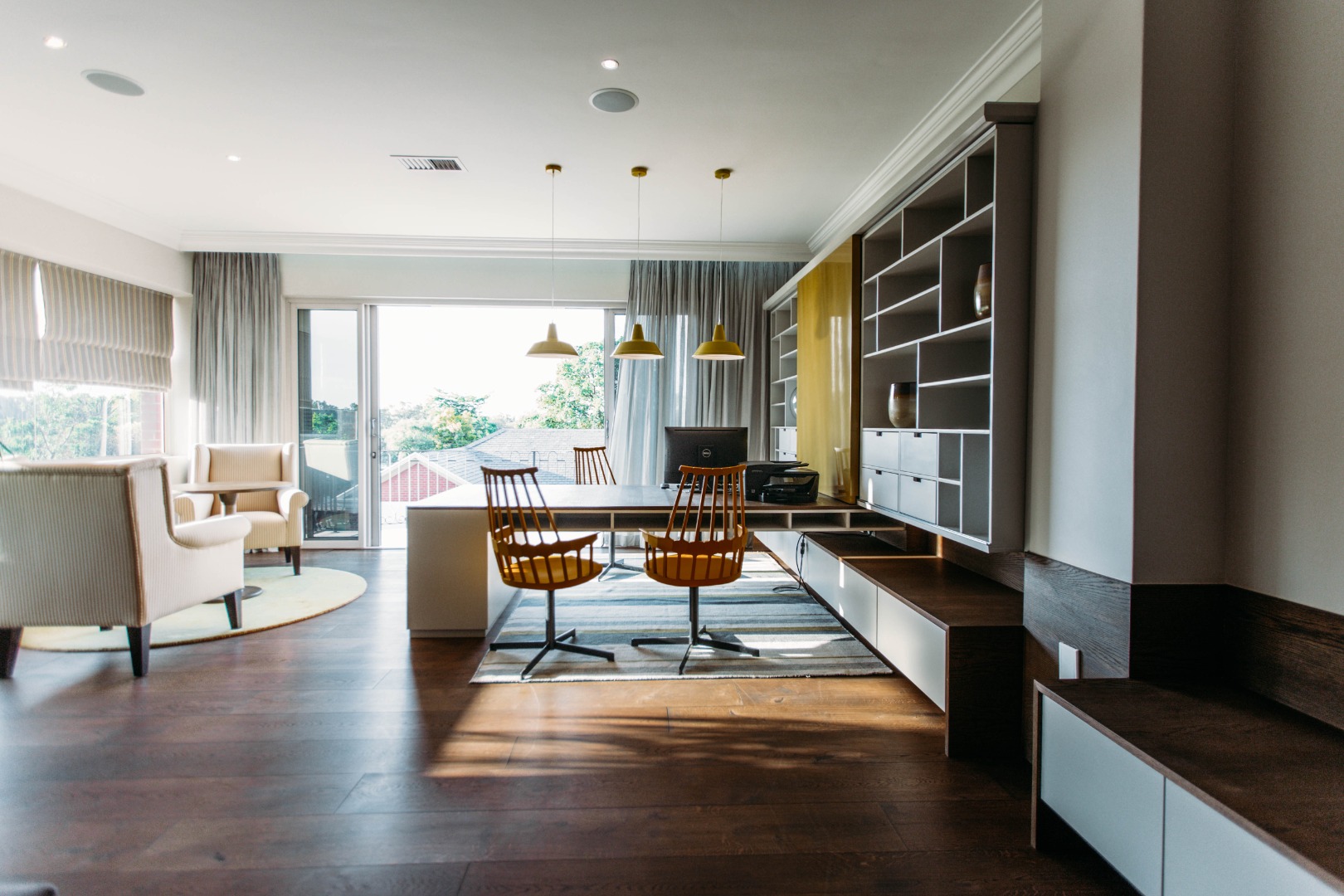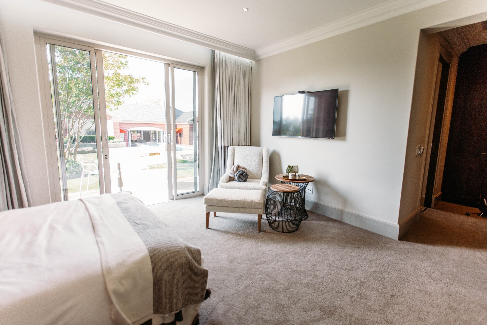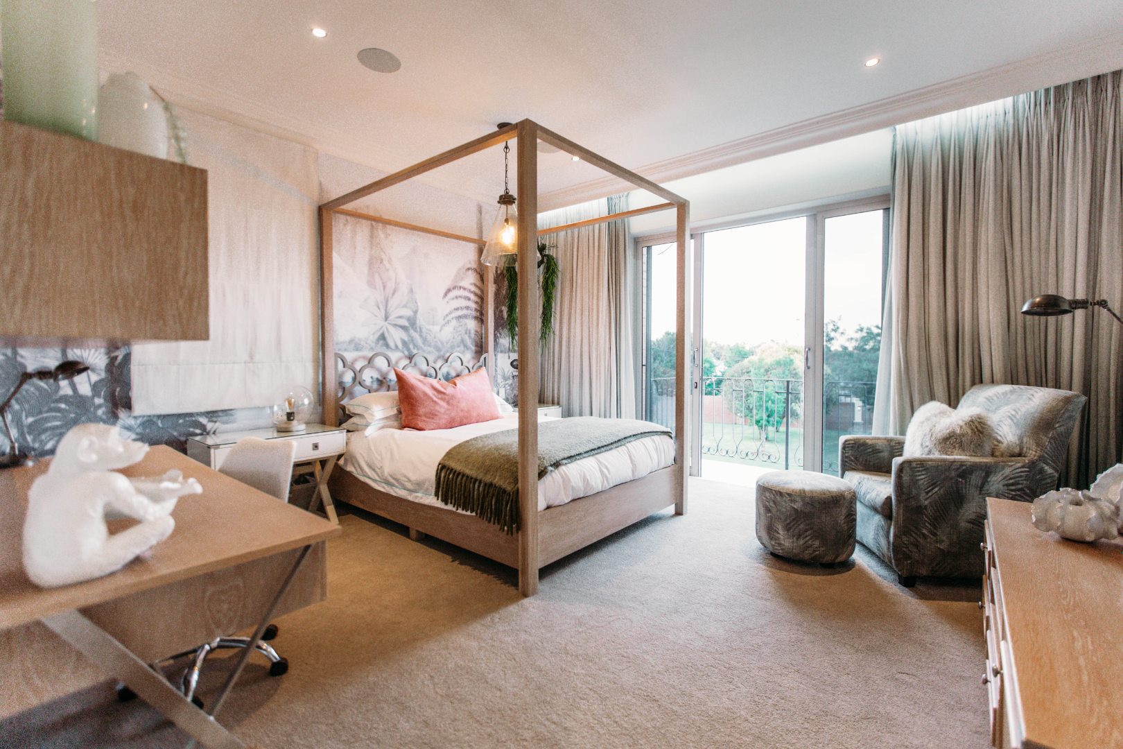 The upper level opens onto an extremely large family TV lounge with fireplace, various seating areas, study area and coffee station, opening onto a large balcony overlooking the sparkling pool and well-maintained lawns. A wonderful space for family to relax and unwind. From there you enter 3 bedrooms, all with balconies and en-suite bathrooms. The main bedroom has a well-fitted dressing room with loads of space for all the seasonal changes and a stunning bathroom.