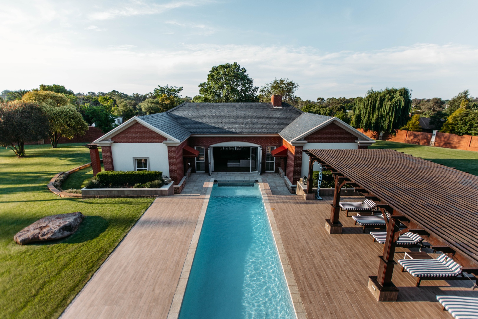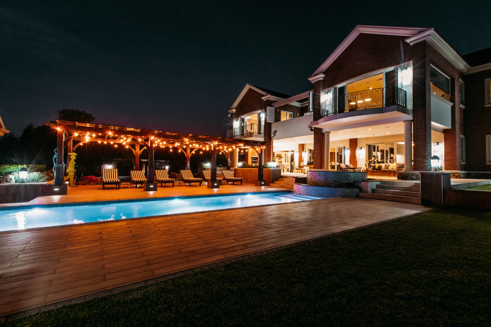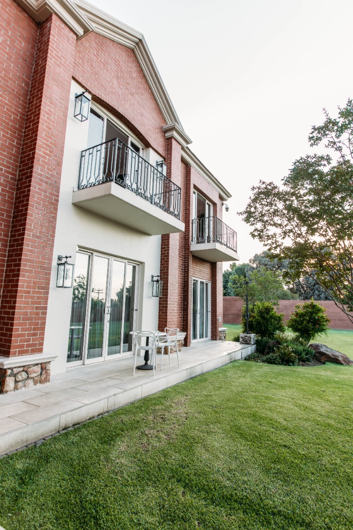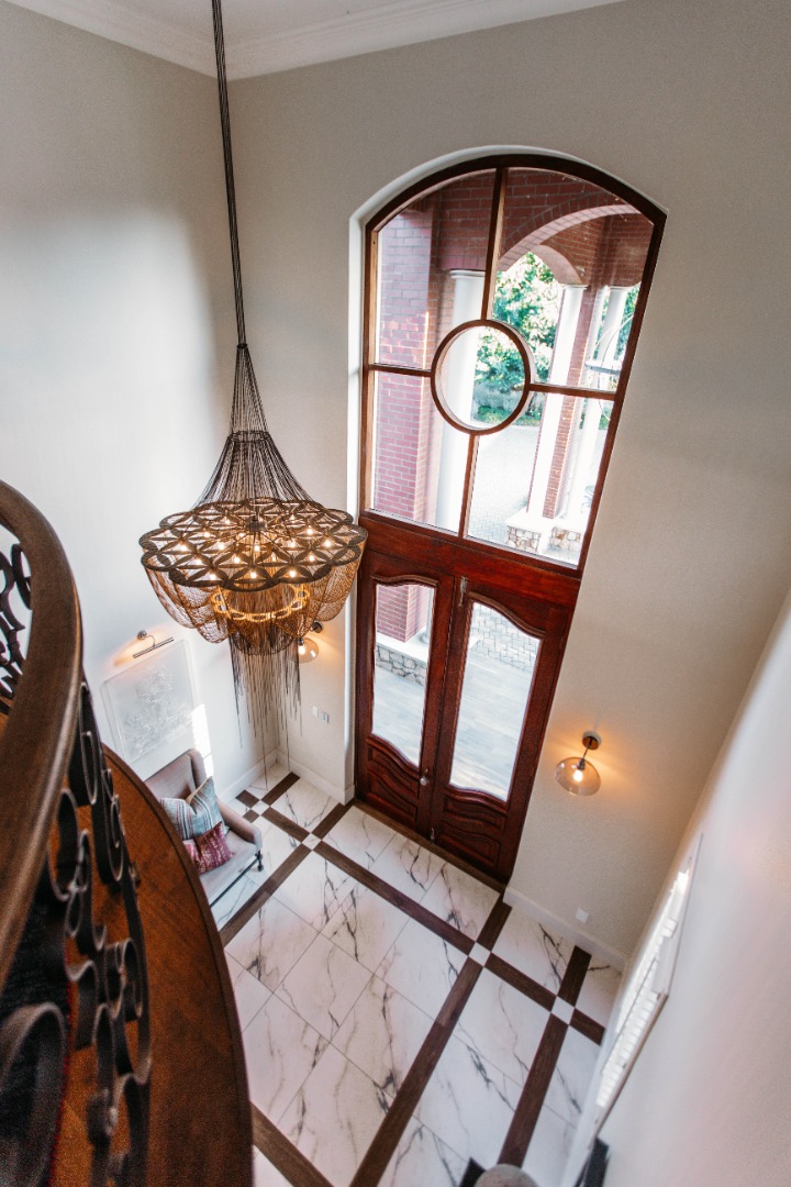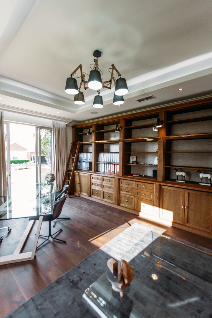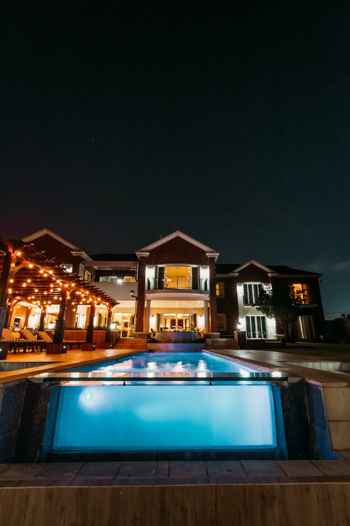 On entering the double volume entrance you are met with elegant patterned marble flooring of excellent craftmanship and works of art, flowing into the 3 lounges with fireplaces and airconditioned comfort. These all flow onto the expansive covered patio or into the large open plan dining area with fitted cabinetry and the custom designed gourmet kitchen with many integrated appliances to create the perfect meals for family and guests.