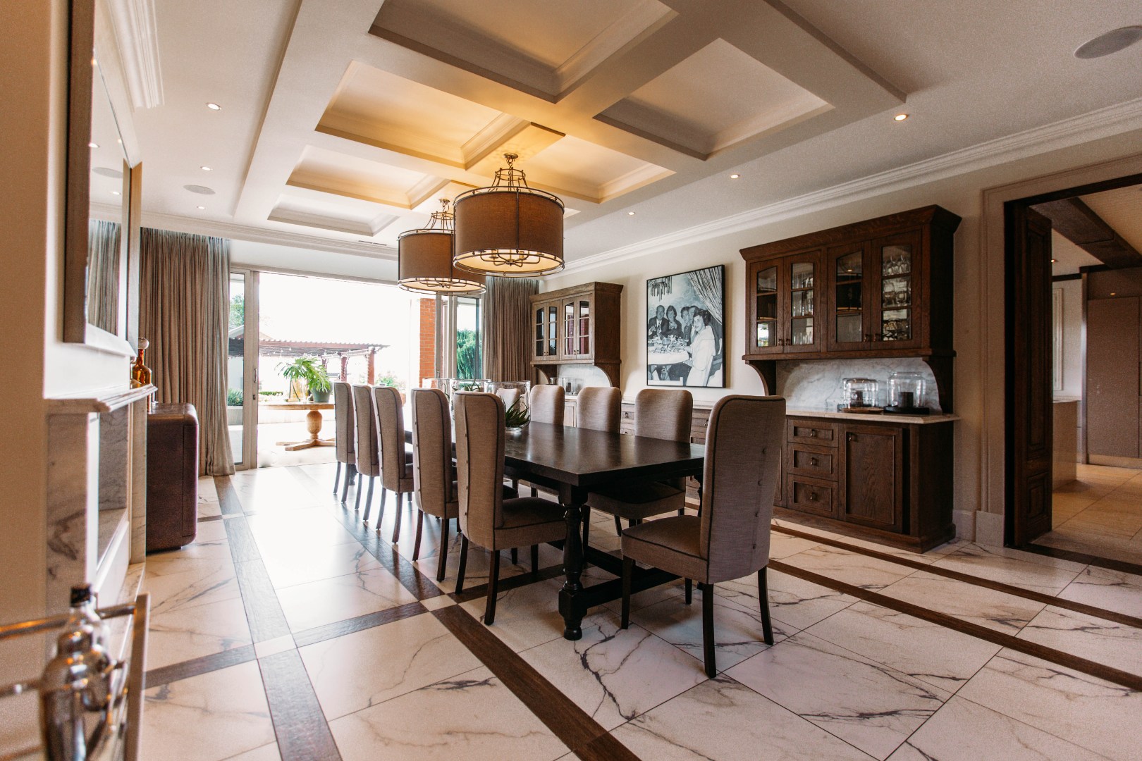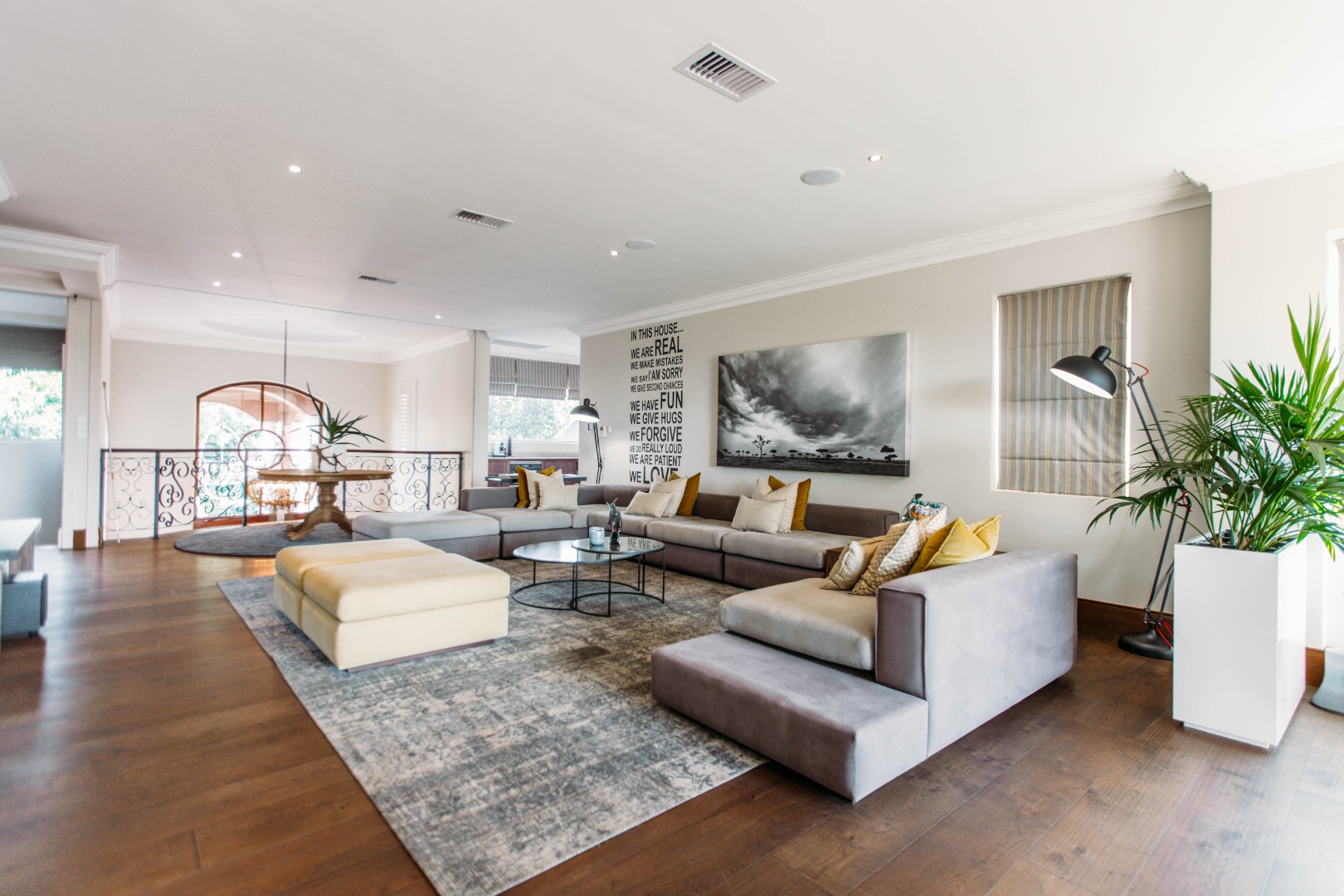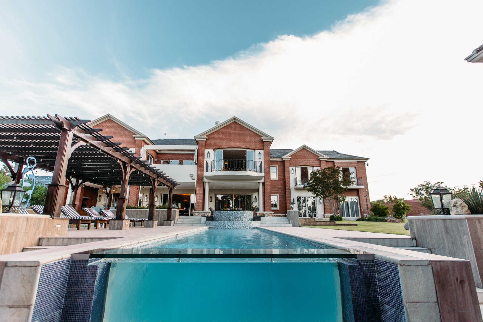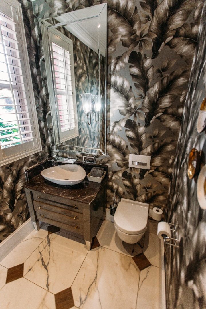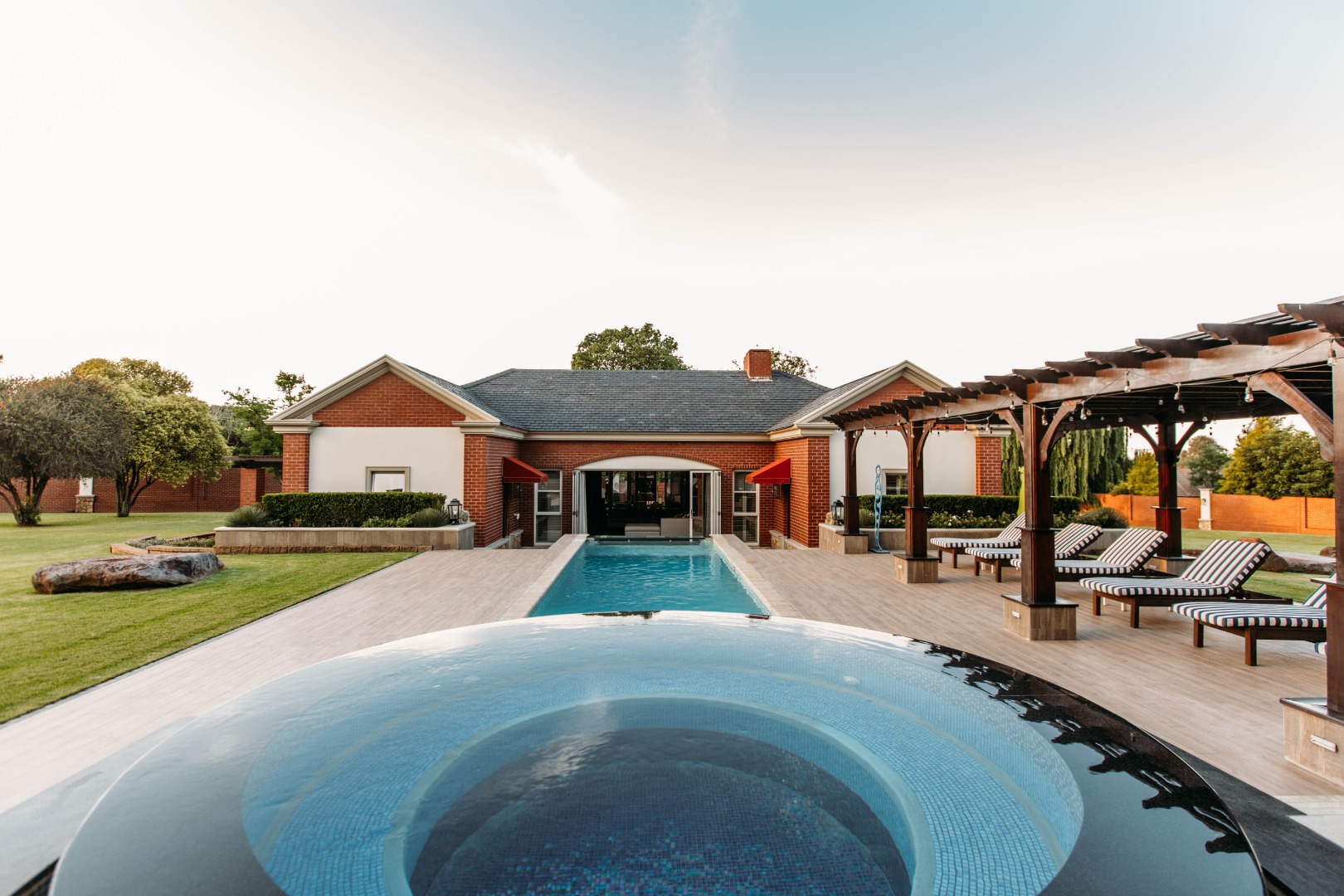 On entering the double volume entrance you are met with elegant patterned marble flooring of excellent craftmanship and works of art, flowing into the 3 lounges with fireplaces and airconditioned comfort. These all flow onto the expansive covered patio or into the large open plan dining area with fitted cabinetry and the custom designed gourmet kitchen with many integrated appliances to create the perfect meals for family and guests.