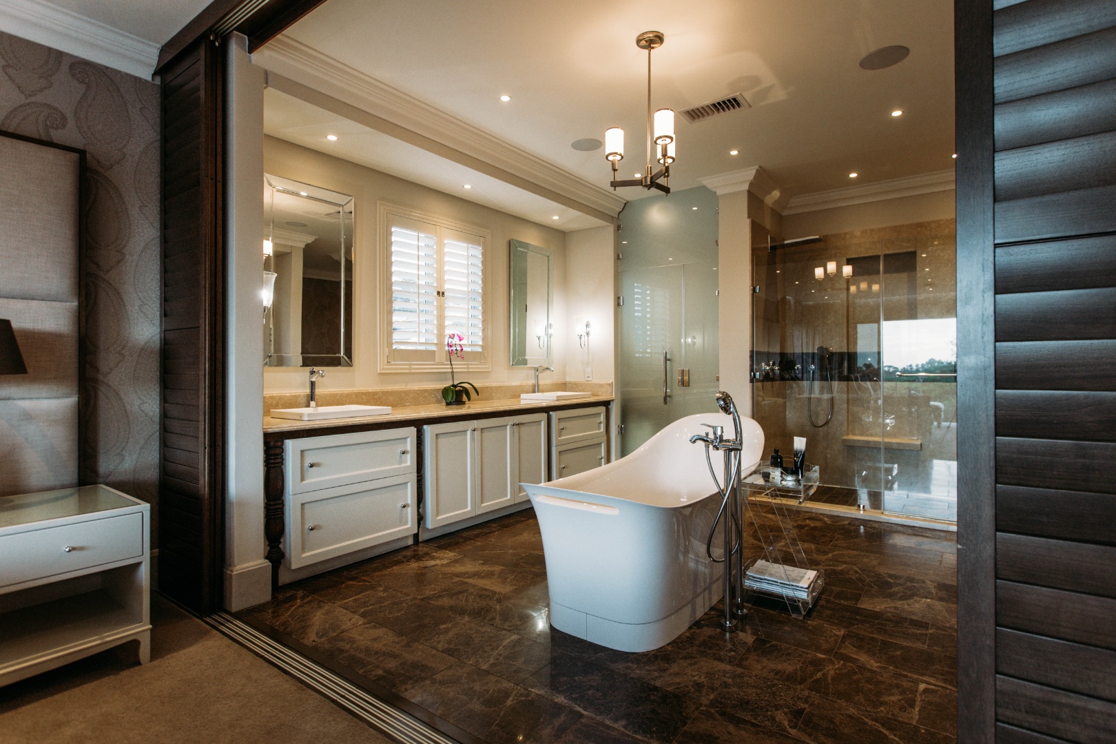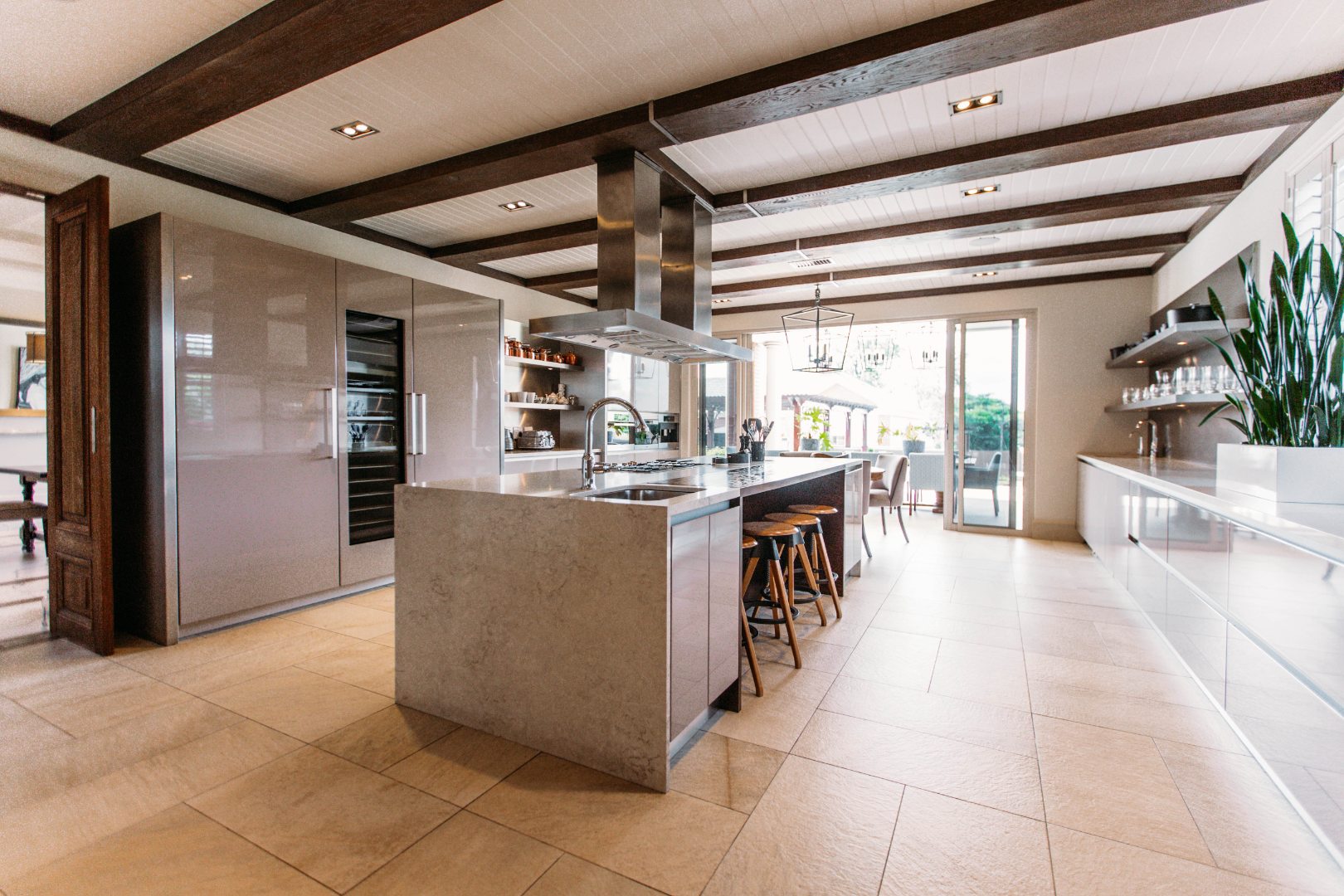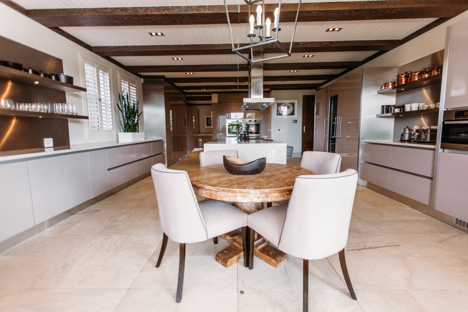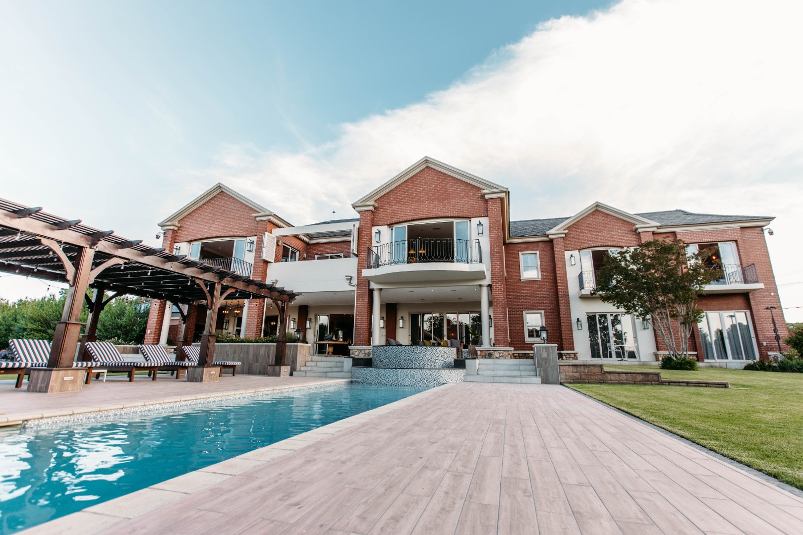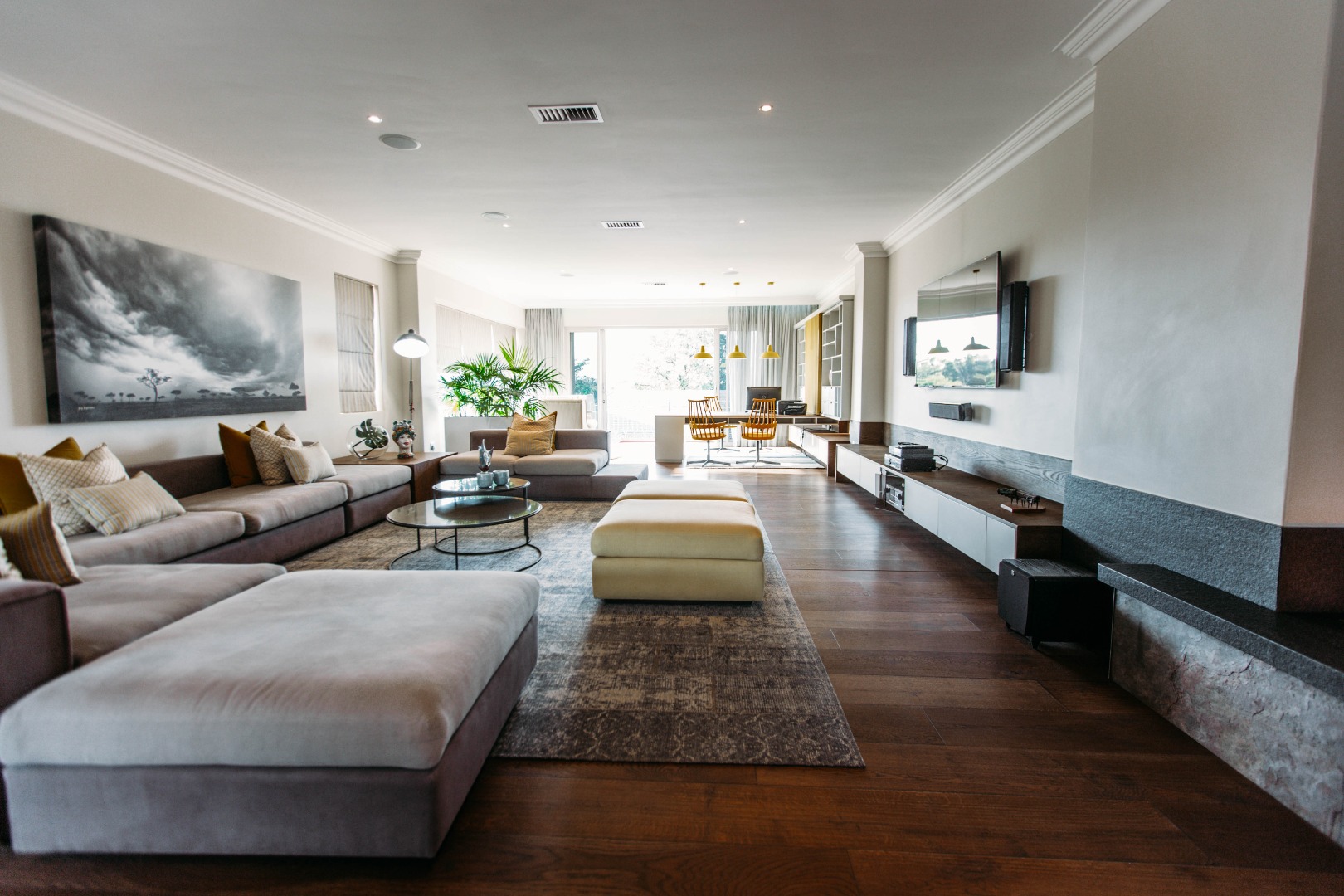 On entering the double volume entrance you are met with elegant patterned marble flooring of excellent craftmanship and works of art, flowing into the 3 lounges with fireplaces and airconditioned comfort. These all flow onto the expansive covered patio or into the large open plan dining area with fitted cabinetry and the custom designed gourmet kitchen with many integrated appliances to create the perfect meals for family and guests.