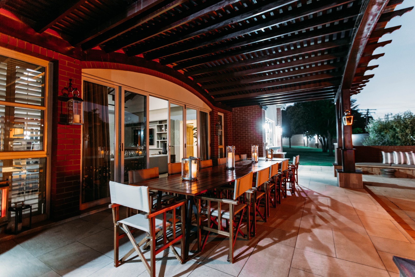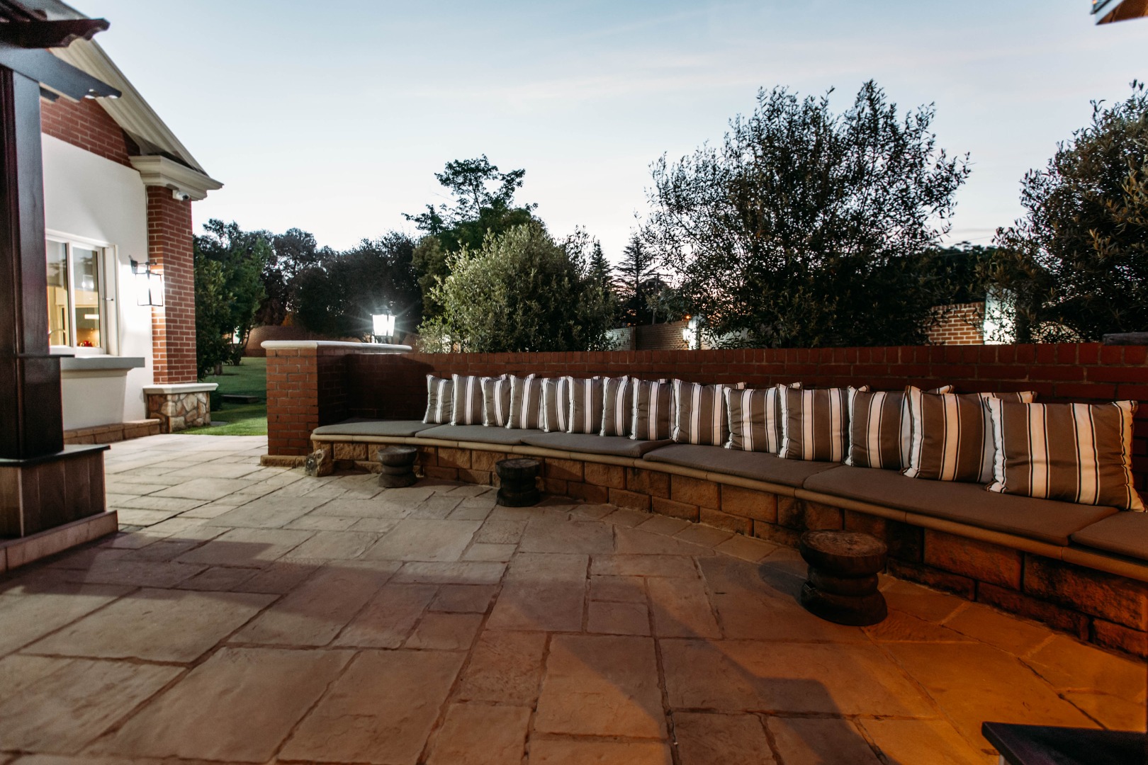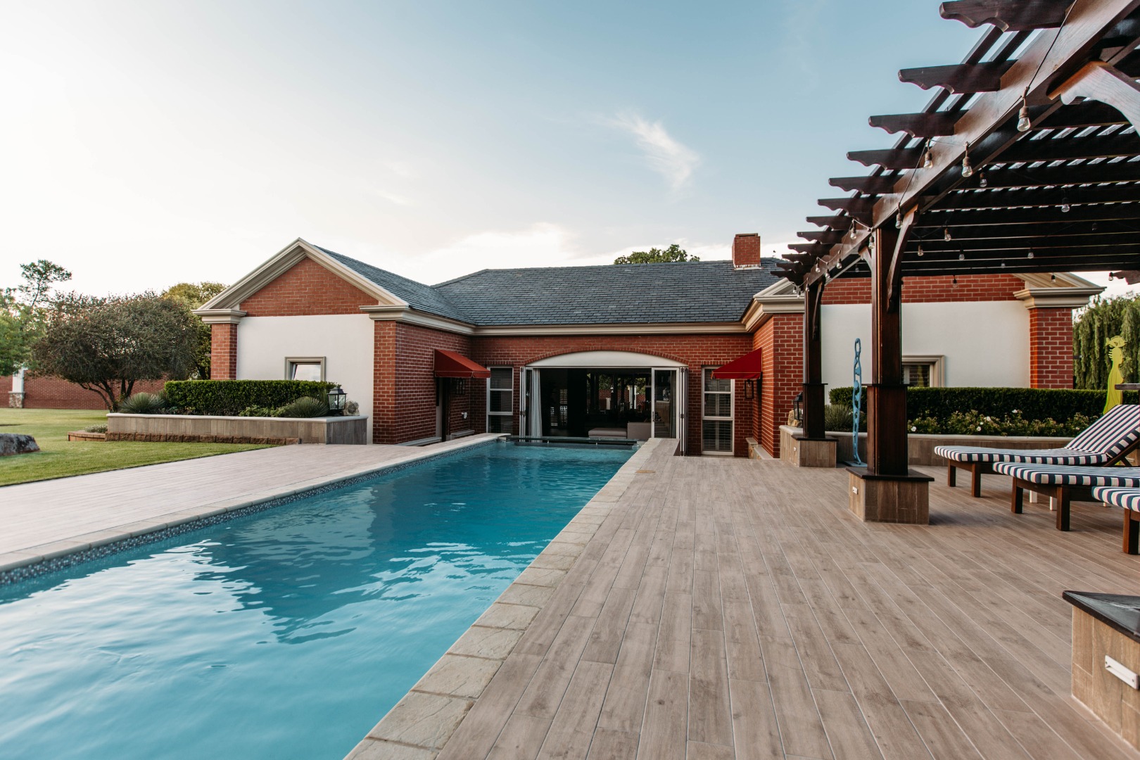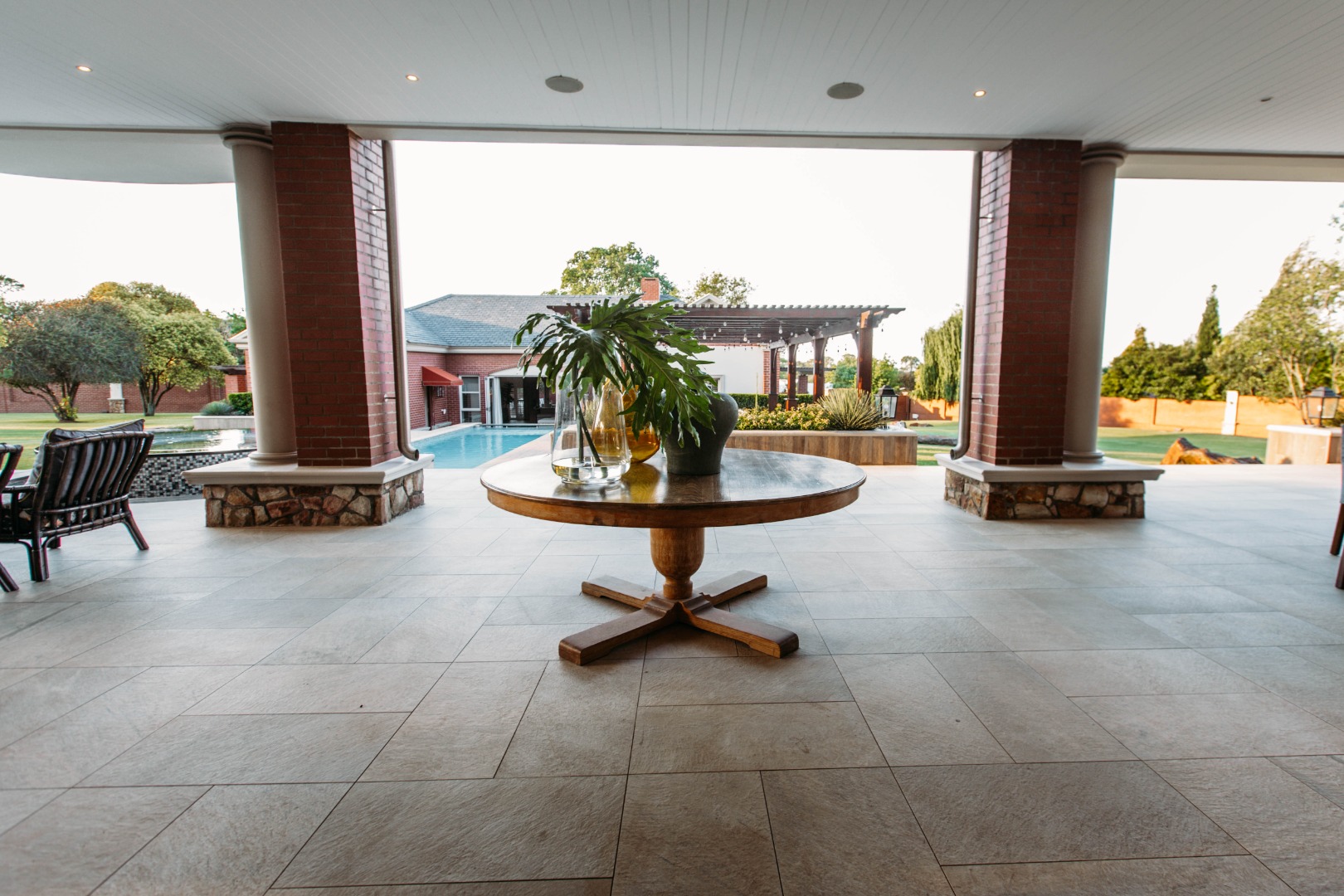 Returning to the living areas, and stepping outside onto the expansive patio which spans almost the length of the home, there is a double BBQ pit with an extractor fan, a pizza oven and much more. This is a perfect space for entertaining guests, relaxing and having alfresco meals. There is a fire pit and long seating around it for those balmy cool evenings. This all looks over the jacuzzi and long sparkling pool , covered pool seating and a "Pool House".