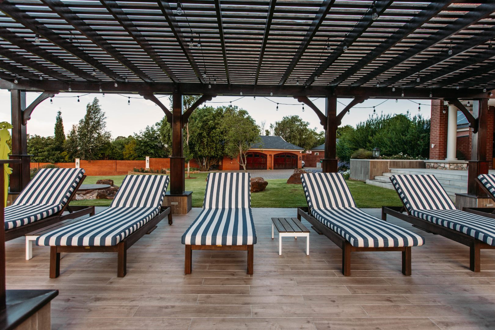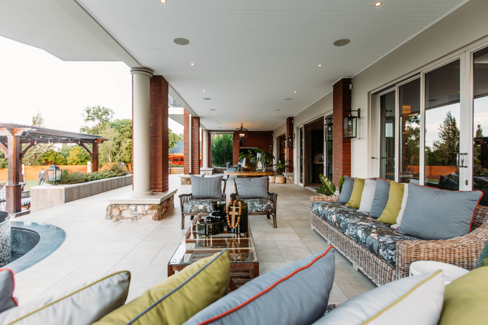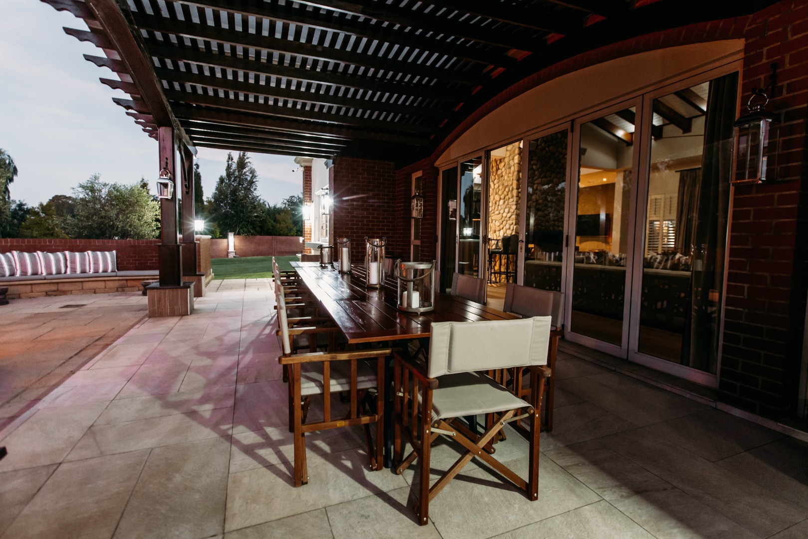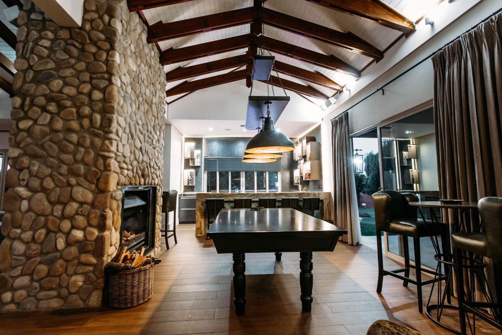 Returning to the living areas, and stepping outside onto the expansive patio which spans almost the length of the home, there is a double BBQ pit with an extractor fan, a pizza oven and much more. This is a perfect space for entertaining guests, relaxing and having alfresco meals. There is a fire pit and long seating around it for those balmy cool evenings. This all looks over the jacuzzi and long sparkling pool , covered pool seating and a "Pool House".