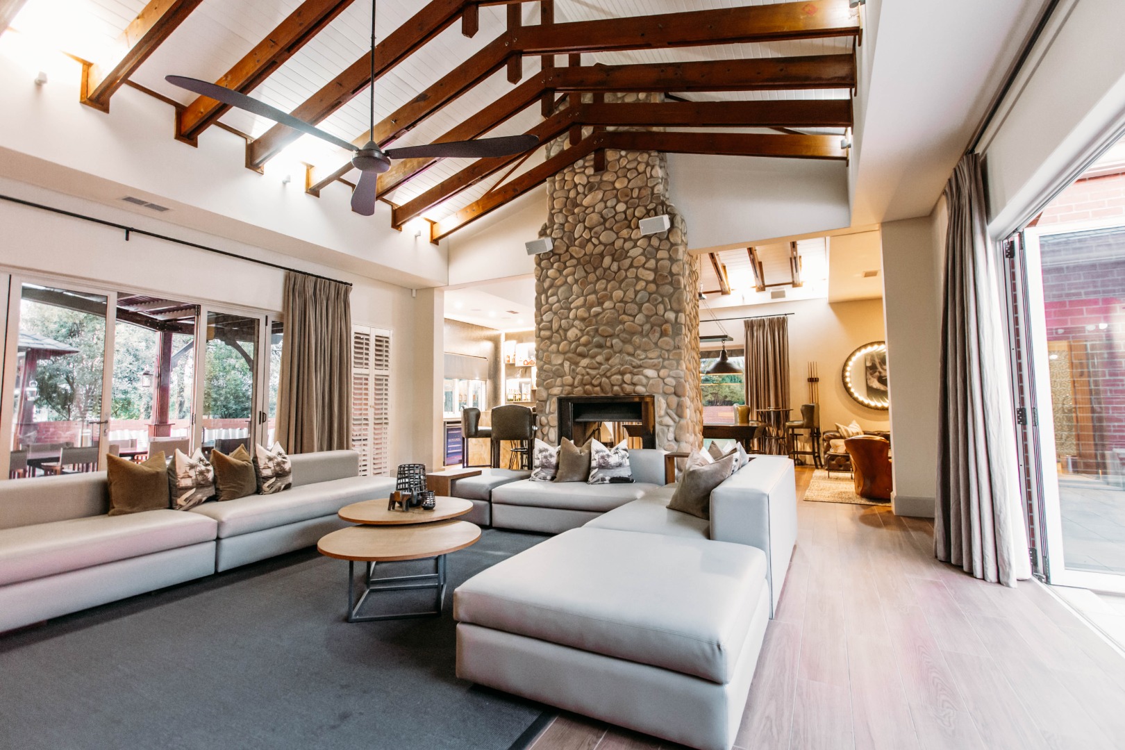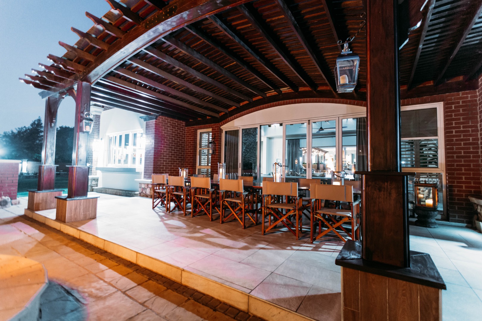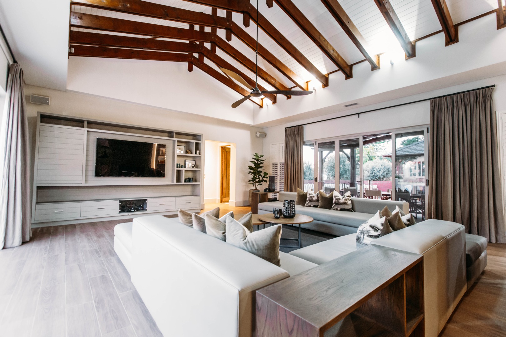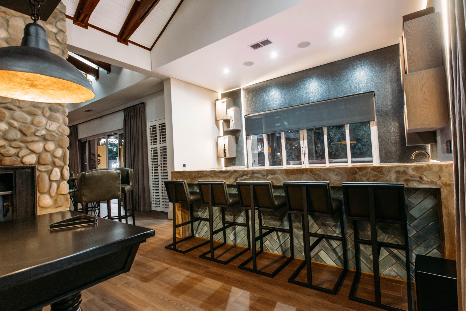 Returning to the living areas, and stepping outside onto the expansive patio which spans almost the length of the home, there is a double BBQ pit with an extractor fan, a pizza oven and much more. This is a perfect space for entertaining guests, relaxing and having alfresco meals. There is a fire pit and long seating around it for those balmy cool evenings. This all looks over the jacuzzi and long sparkling pool , covered pool seating and a "Pool House".