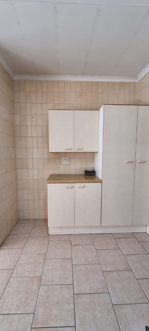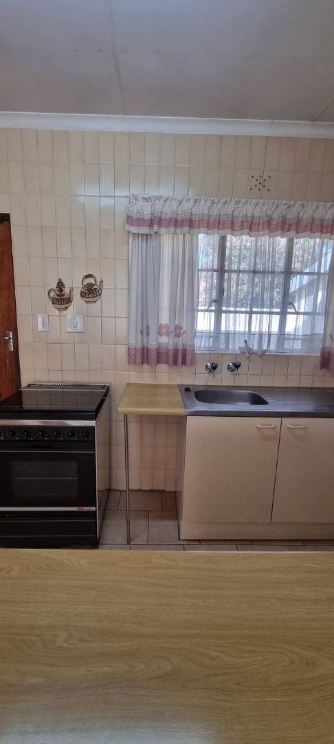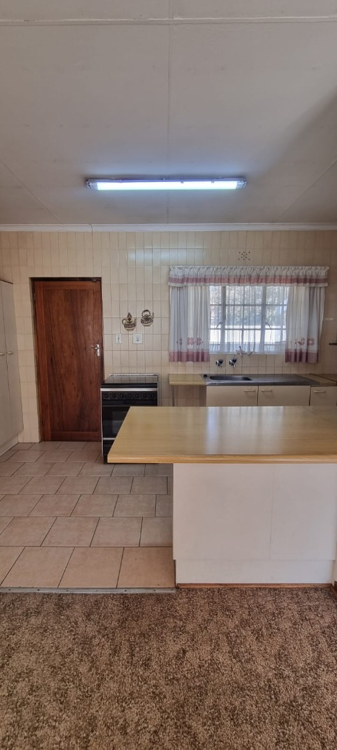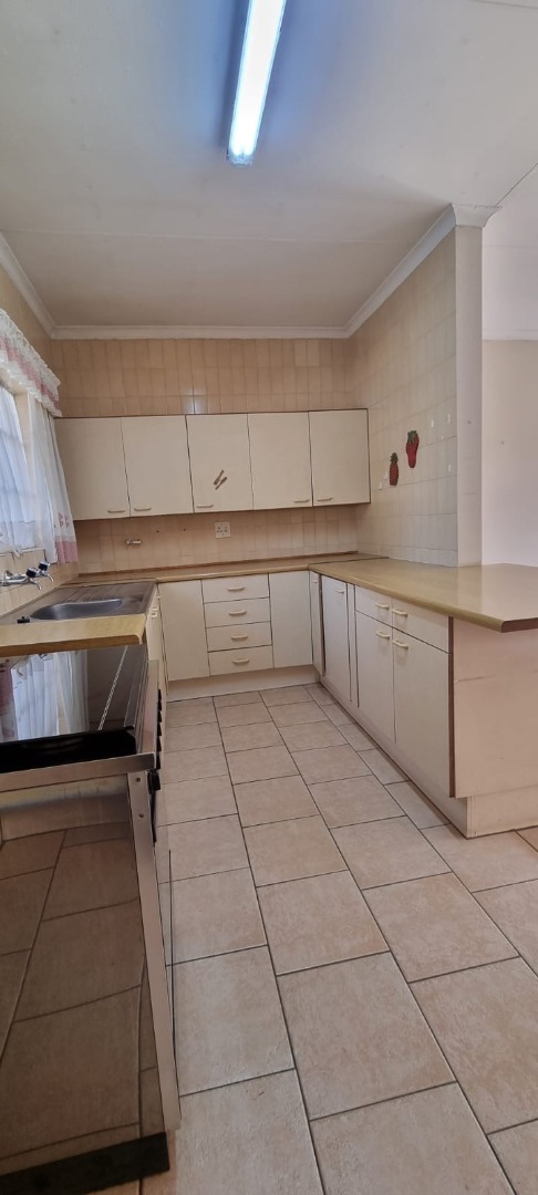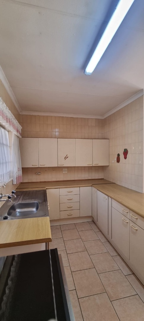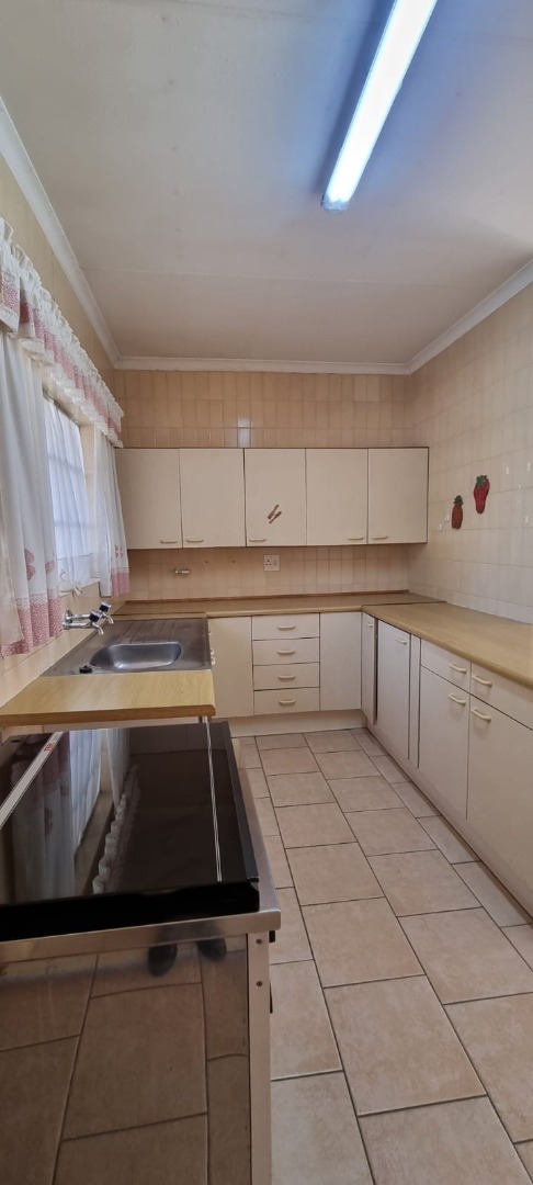 The home boasts a large open-plan living area that overlooks a practical, well-appointed kitchen featuring a 4-plate stove, undercounter oven, a basin, tiled floors, and ample built-in cupboards. Ideal for those who value functionality and space.