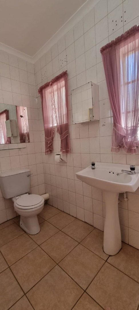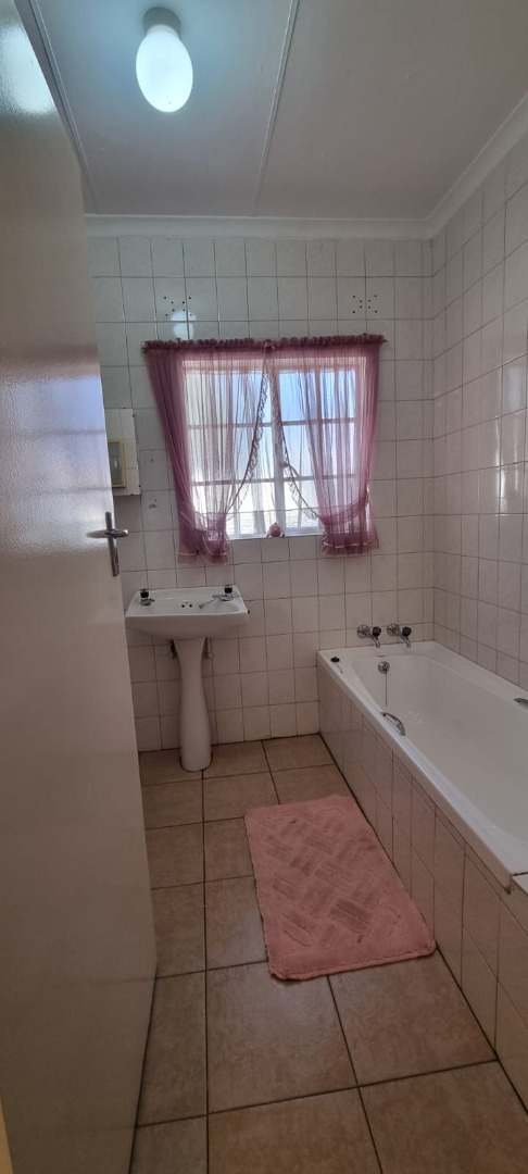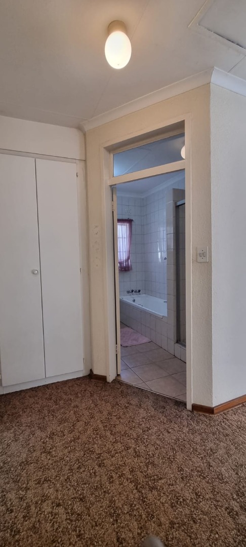There are two carpeted bedrooms, both with built-in cupboards. The main bedroom is generously sized, offering plenty of room to relax. The full bathroom is neatly tiled to the ceiling and includes a bath, shower, basin, and toilet.