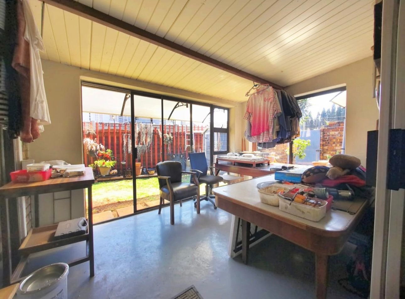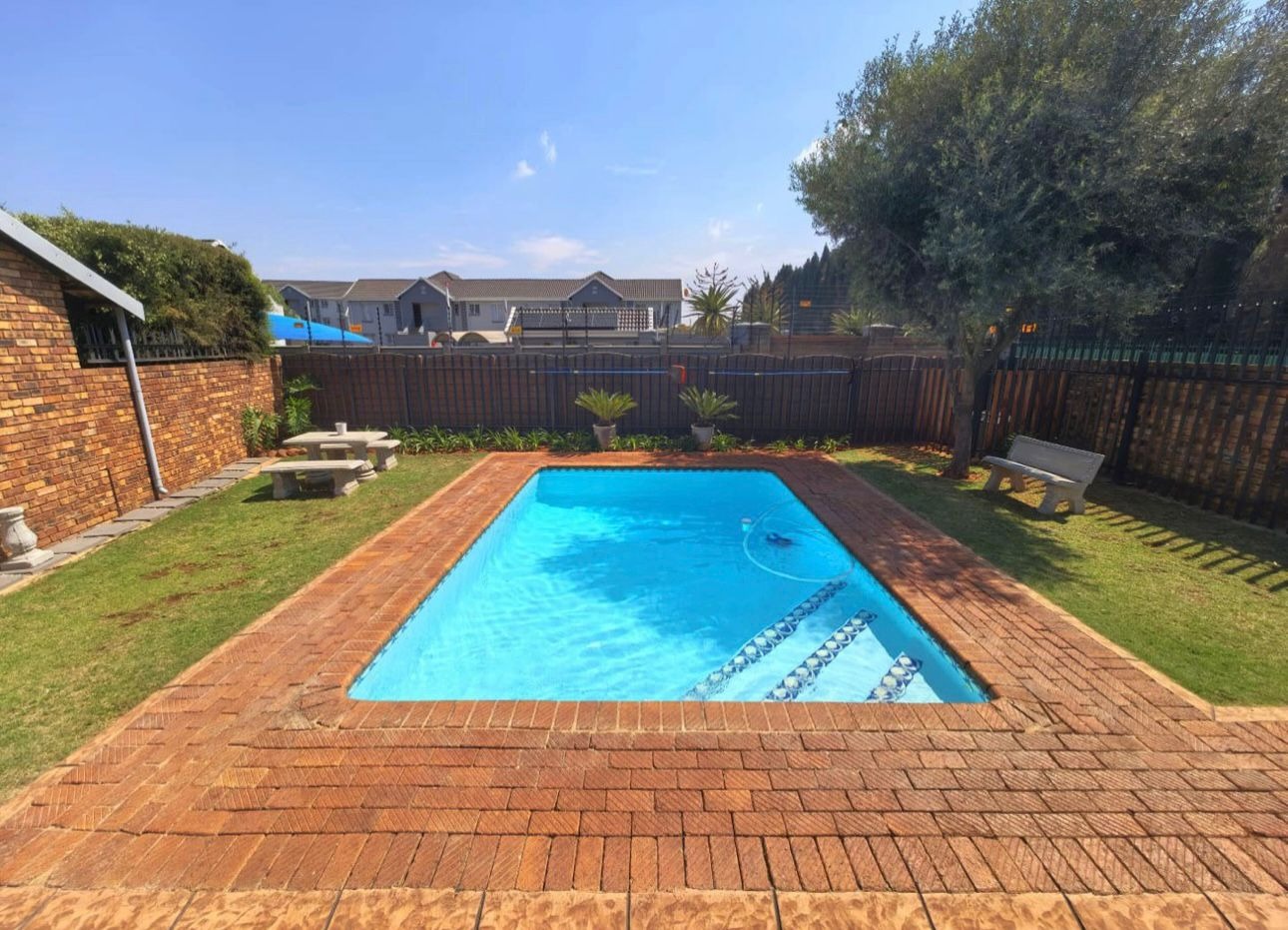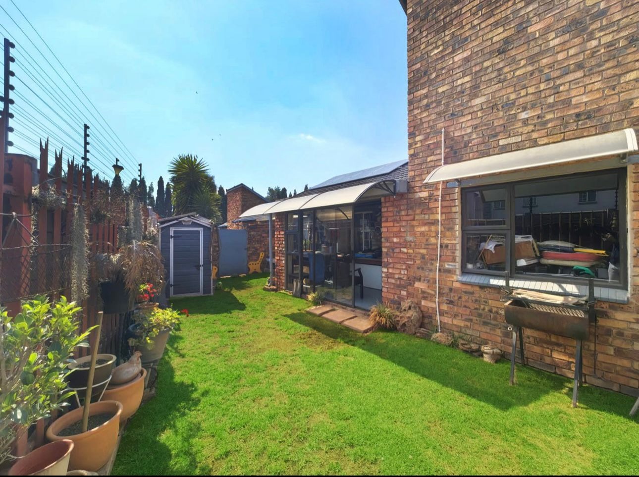 Step outside to a private oasis featuring a well-maintained garden and a clear blue swimming pool, perfect for relaxation and entertaining. The property also includes a paved patio and a versatile enclosed sunroom, offering an additional indoor-outdoor living experience. Practical outdoor amenities include a garden shed and dedicated carports, alongside a single garage. The complex benefits from 24-hour security, electric fencing, and visible security gates, ensuring a safe environment. Energy efficiency is enhanced by solar panels on the roof.