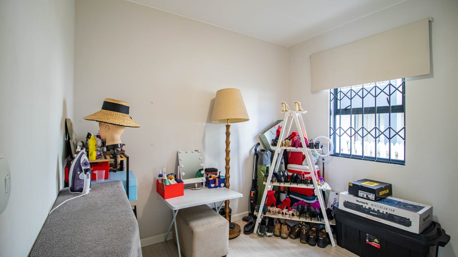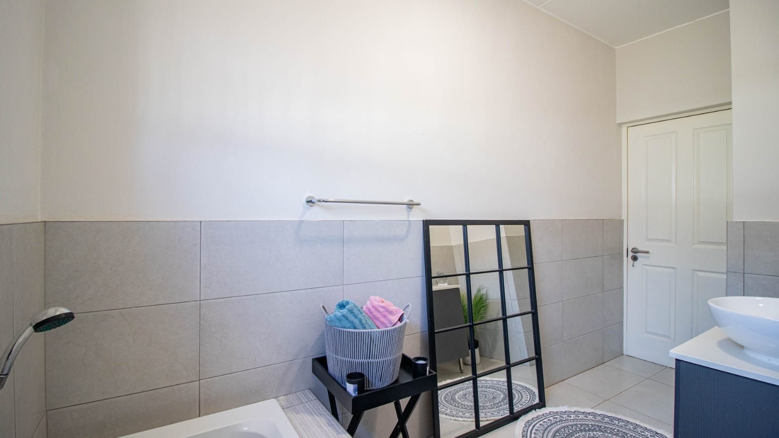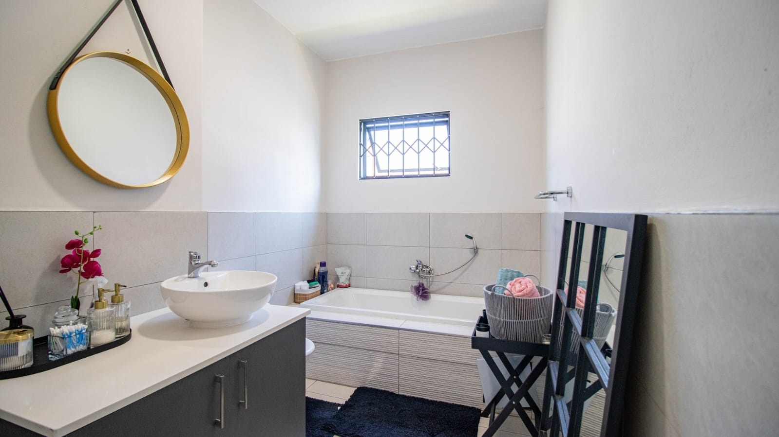 This unit comprises three comfortable bedrooms, providing versatile living options. The well-appointed bathroom features a modern vessel sink set on a white-topped vanity, a full-sized bathtub, and a stylish circular wall mirror, all surrounded by clean, light-colored tiling. Natural light filters through the window, which is also fitted with security bars for added safety. The rooms offer a neutral palette, ready for personal customisation.