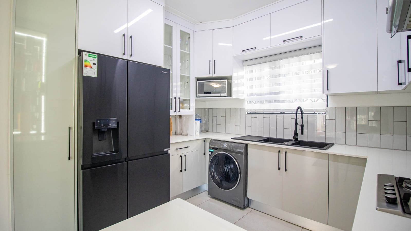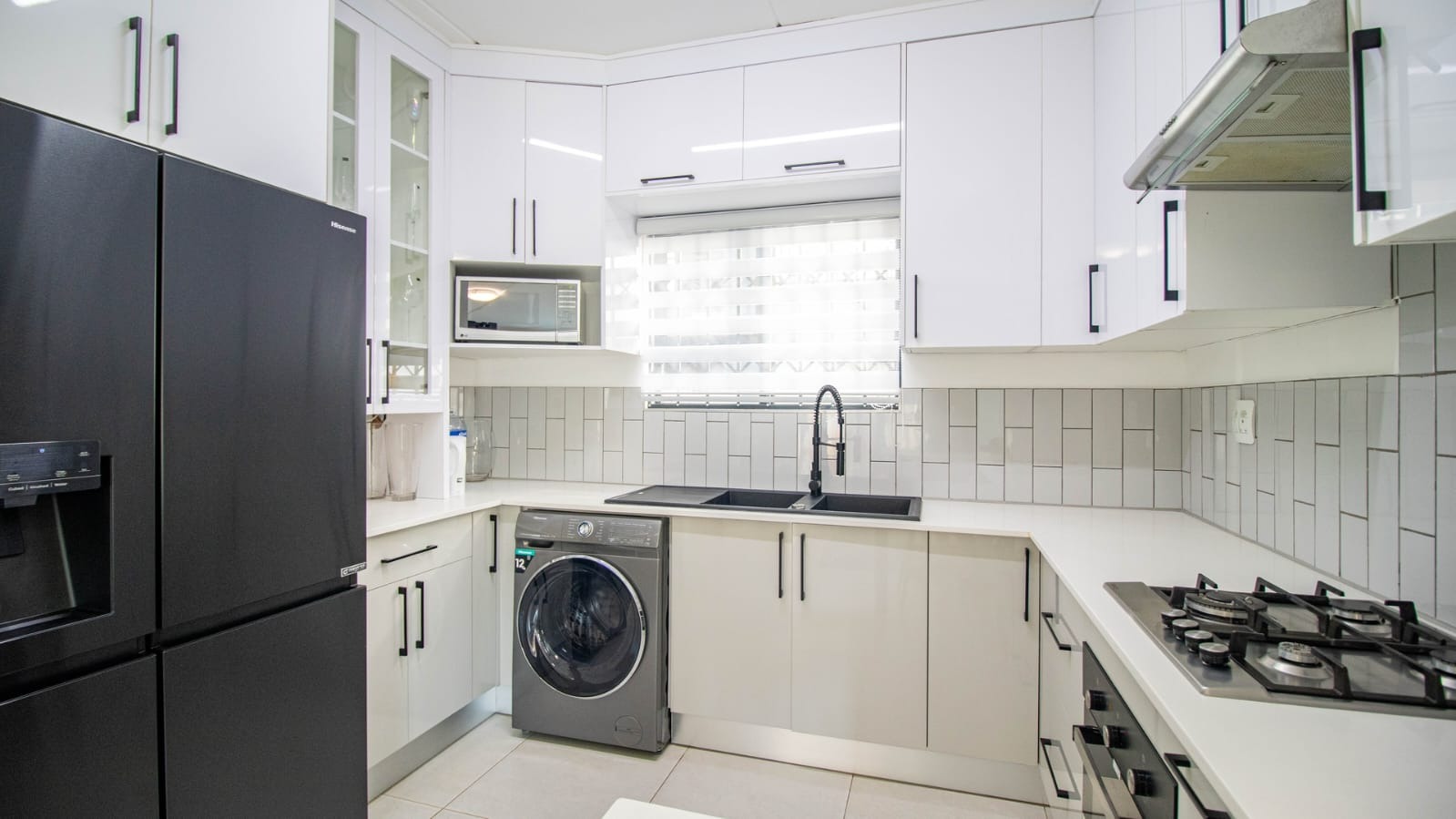 Step inside to an open-plan living area, bathed in natural light and featuring contemporary tiled floors. The heart of this home is its modern kitchen, showcasing sleek white high-gloss cabinetry complemented by black handles and pristine white quartz countertops. A stylish white subway tile backsplash and modern black fixtures, including a double sink with a pull-down faucet, elevate the aesthetic. Equipped with a large black refrigerator, integrated oven, gas hob, and a built-in washing machine, this kitchen also offers ample storage and a functional breakfast bar.