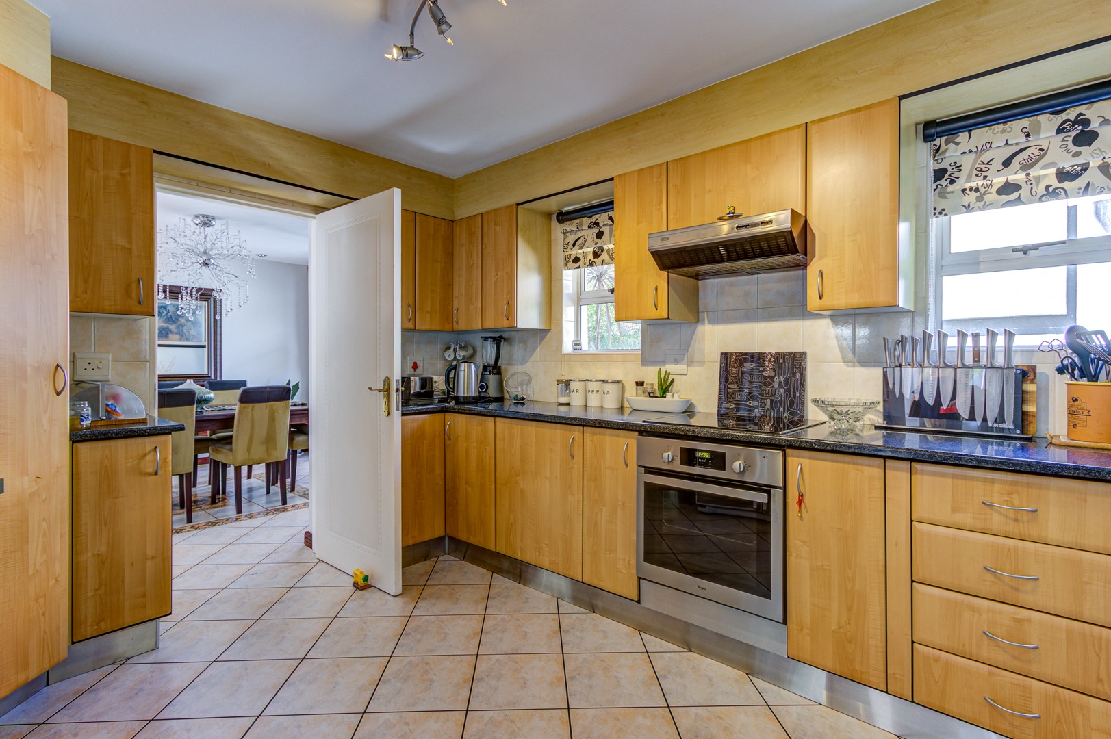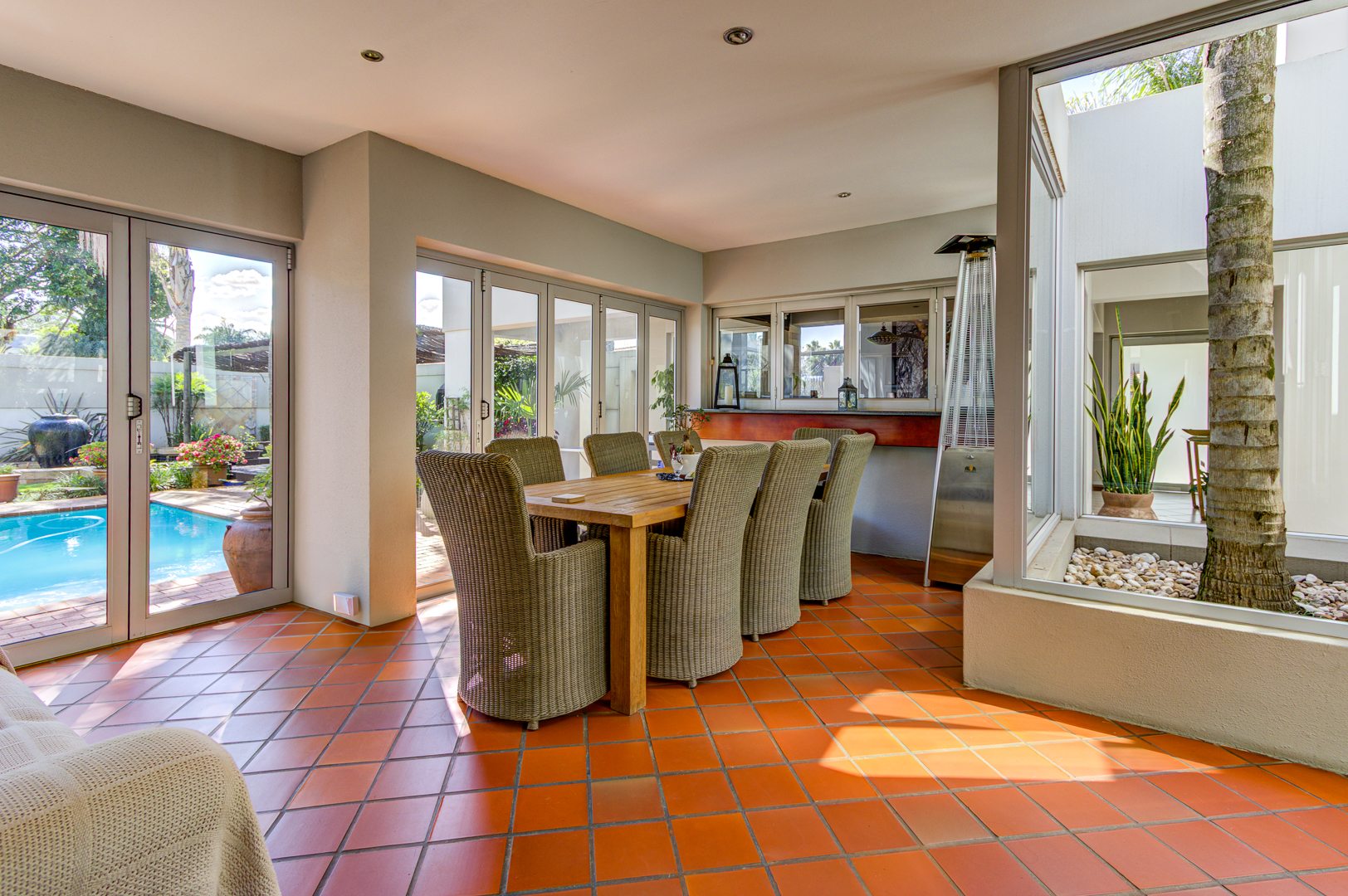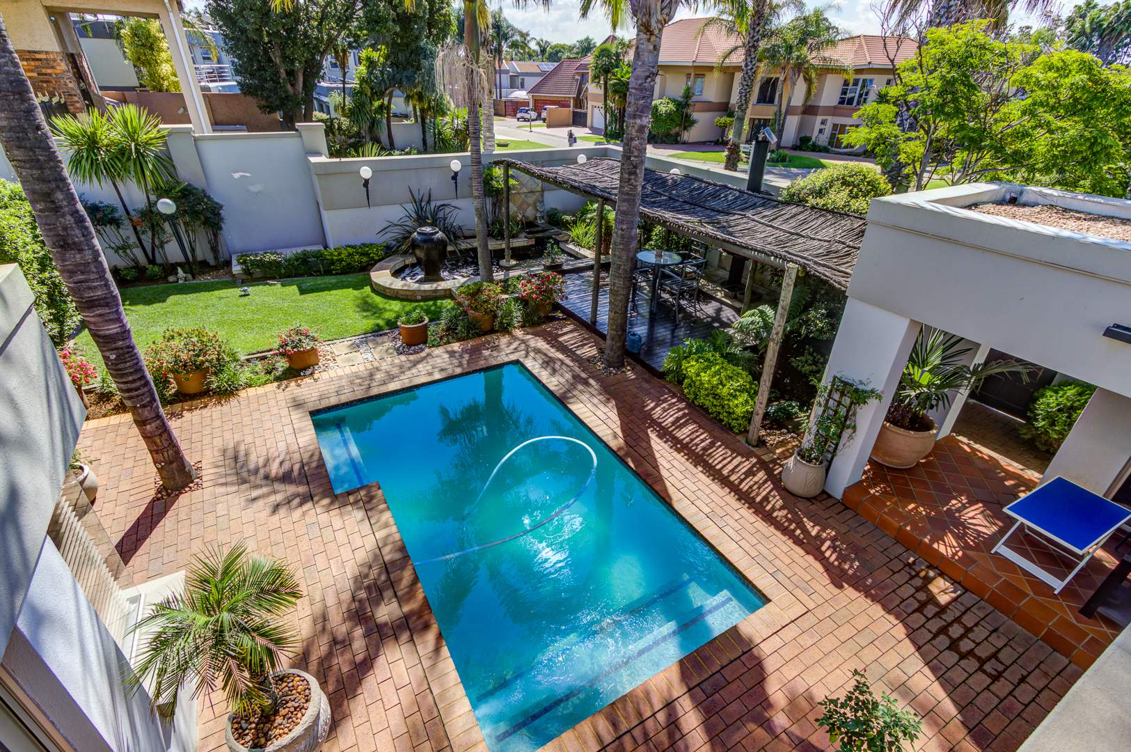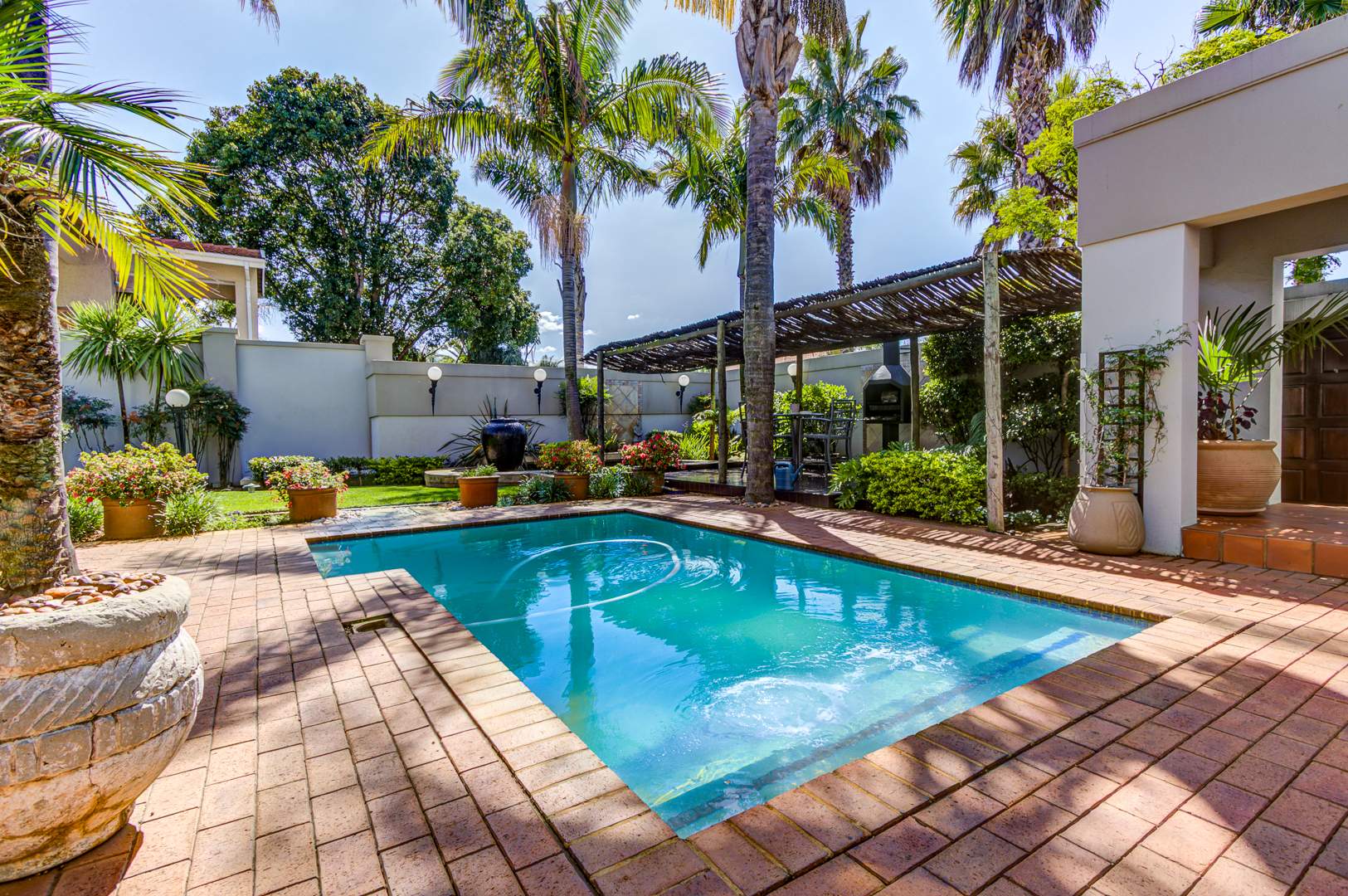 The open-plan Kitchen is a chef’s dream, complete with granite countertops, a breakfast nook, ample cupboard space, and generous work surfaces, making it ideal for cooking up a storm. Flowing seamlessly into the Dining, Living and Entertainment areas, the home boasts tiled floors and aluminum folding doors, creating a seamless indoor-outdoor experience. The entertainment space includes a Bar, a covered patio, a sparkling Pool, and a tranquil Koi pond, all set within a beautifully landscaped private garden.