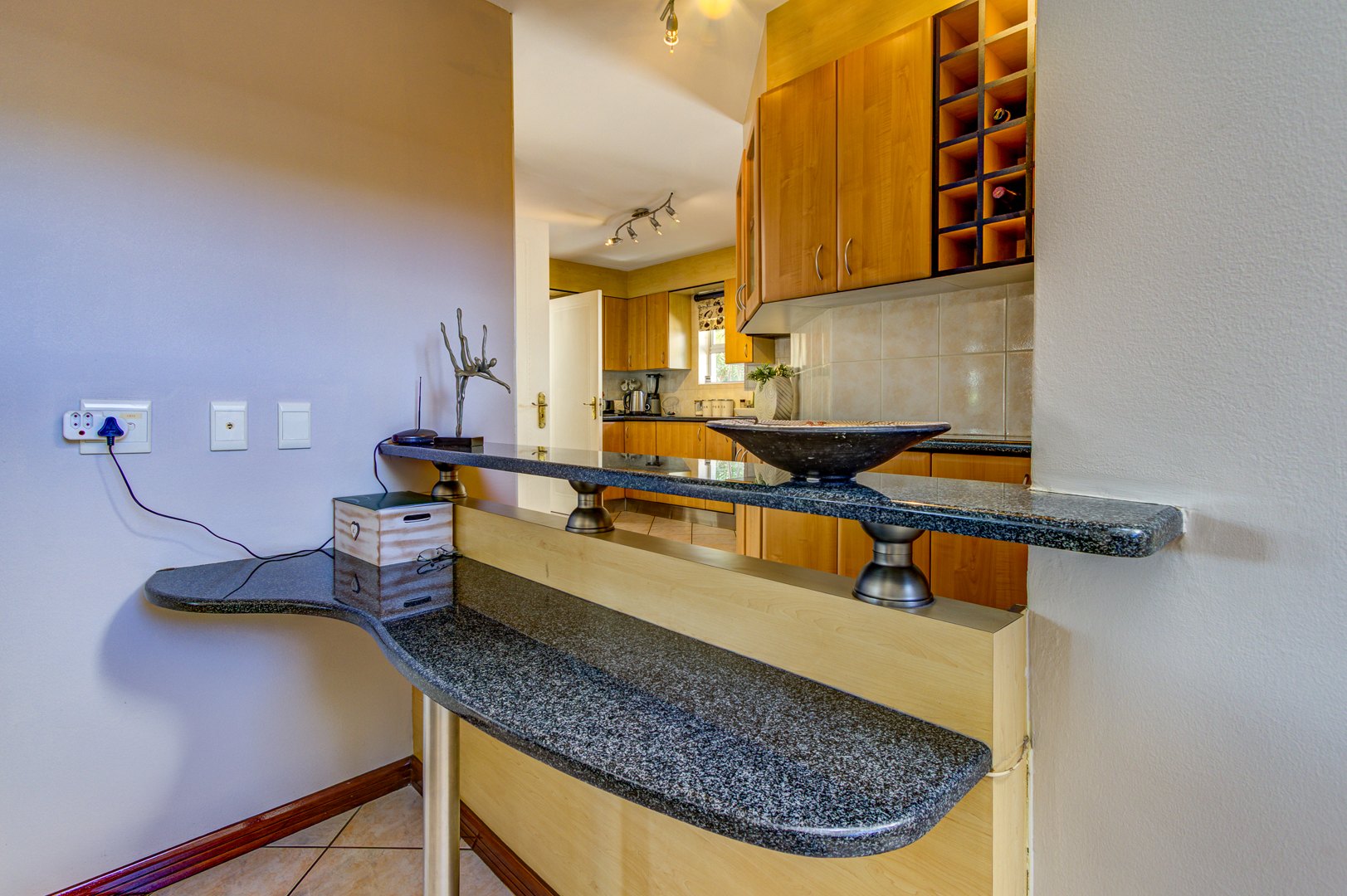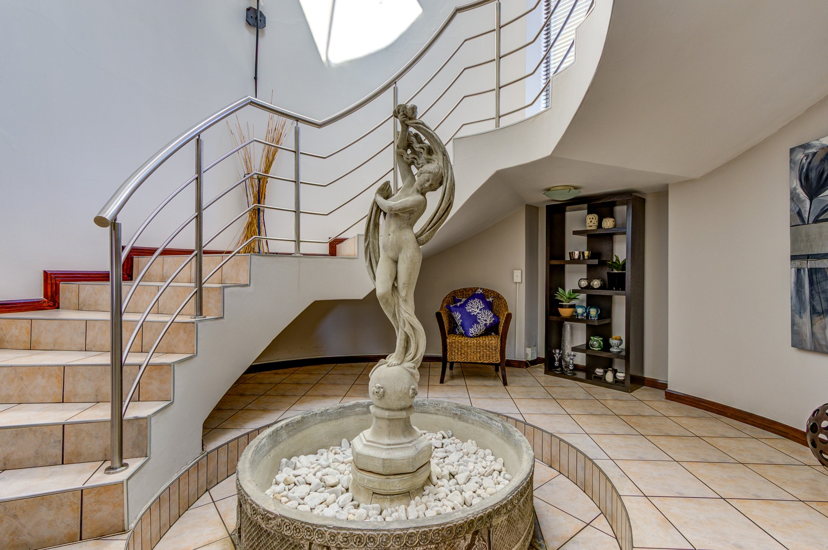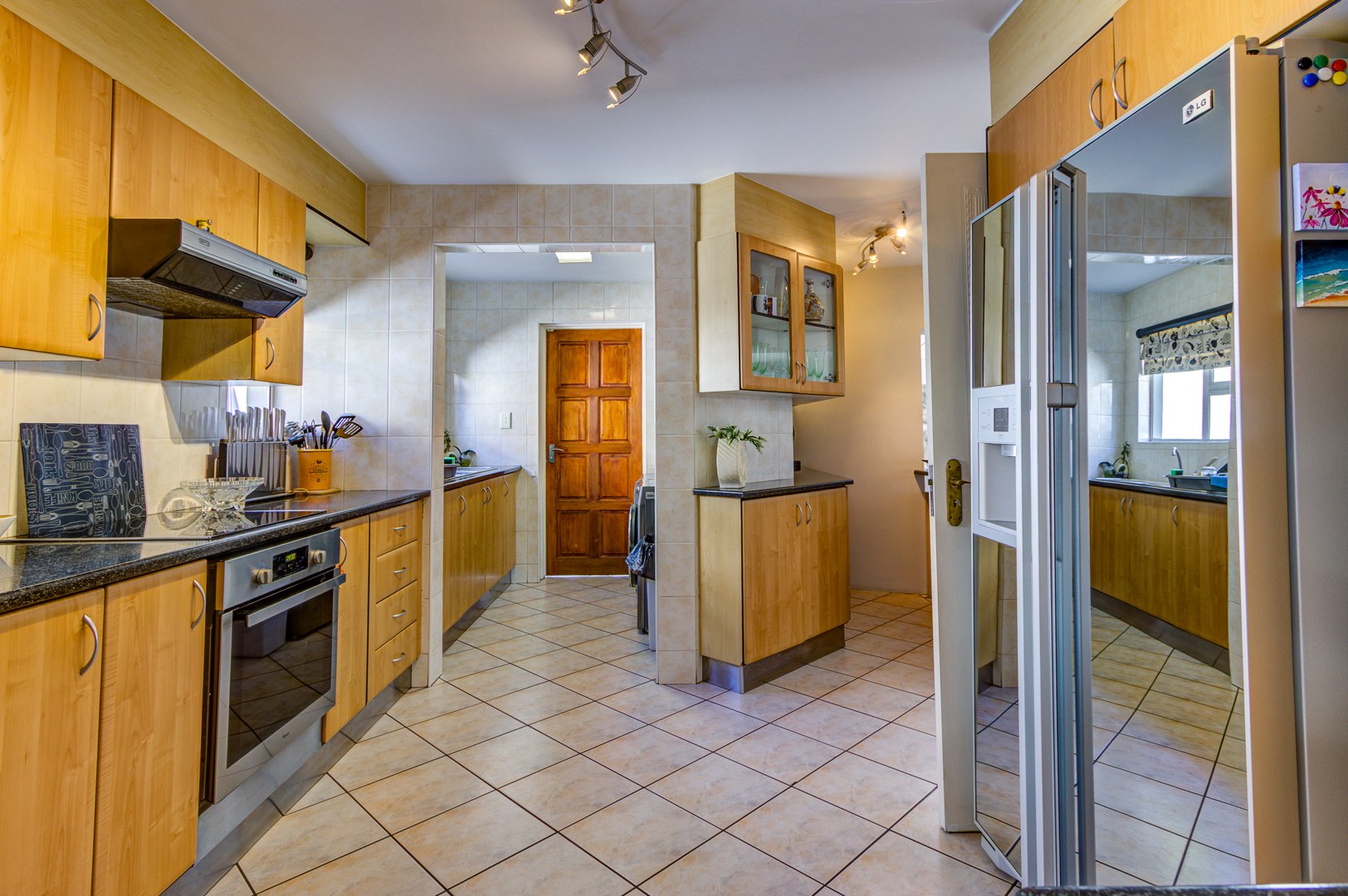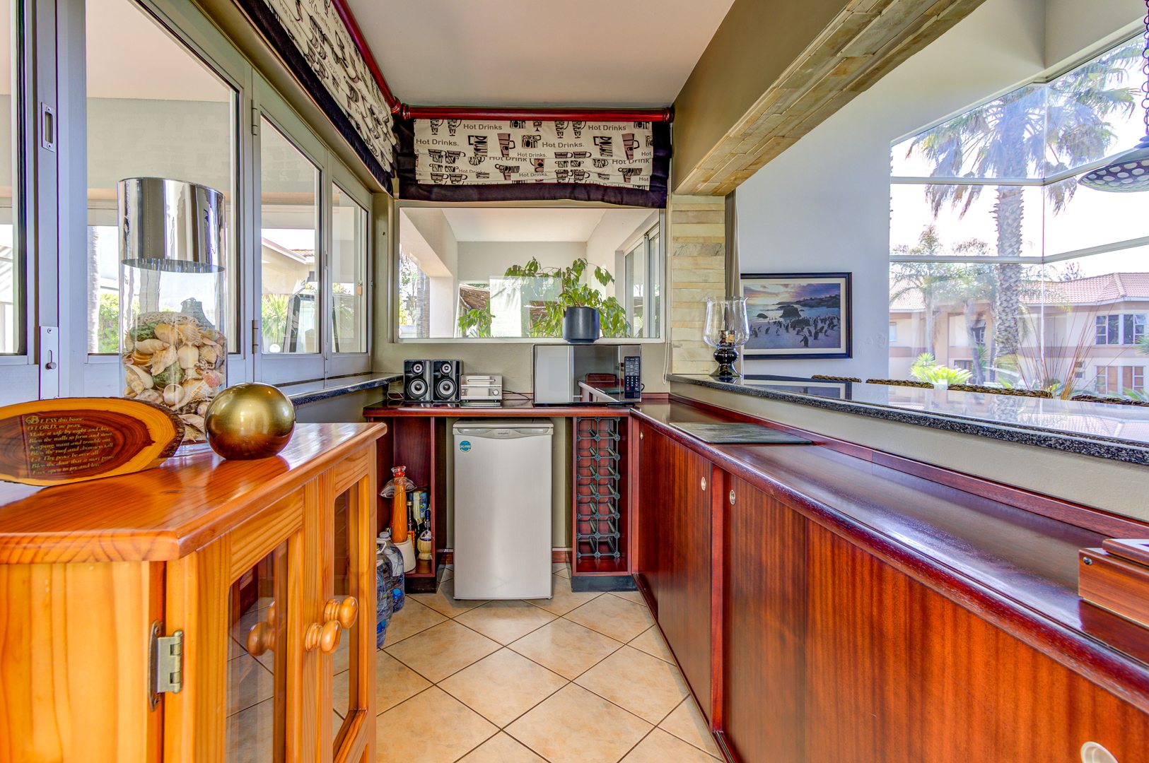 The open-plan Kitchen is a chef’s dream, complete with granite countertops, a breakfast nook, ample cupboard space, and generous work surfaces, making it ideal for cooking up a storm. Flowing seamlessly into the Dining, Living and Entertainment areas, the home boasts tiled floors and aluminum folding doors, creating a seamless indoor-outdoor experience. The entertainment space includes a Bar, a covered patio, a sparkling Pool, and a tranquil Koi pond, all set within a beautifully landscaped private garden.