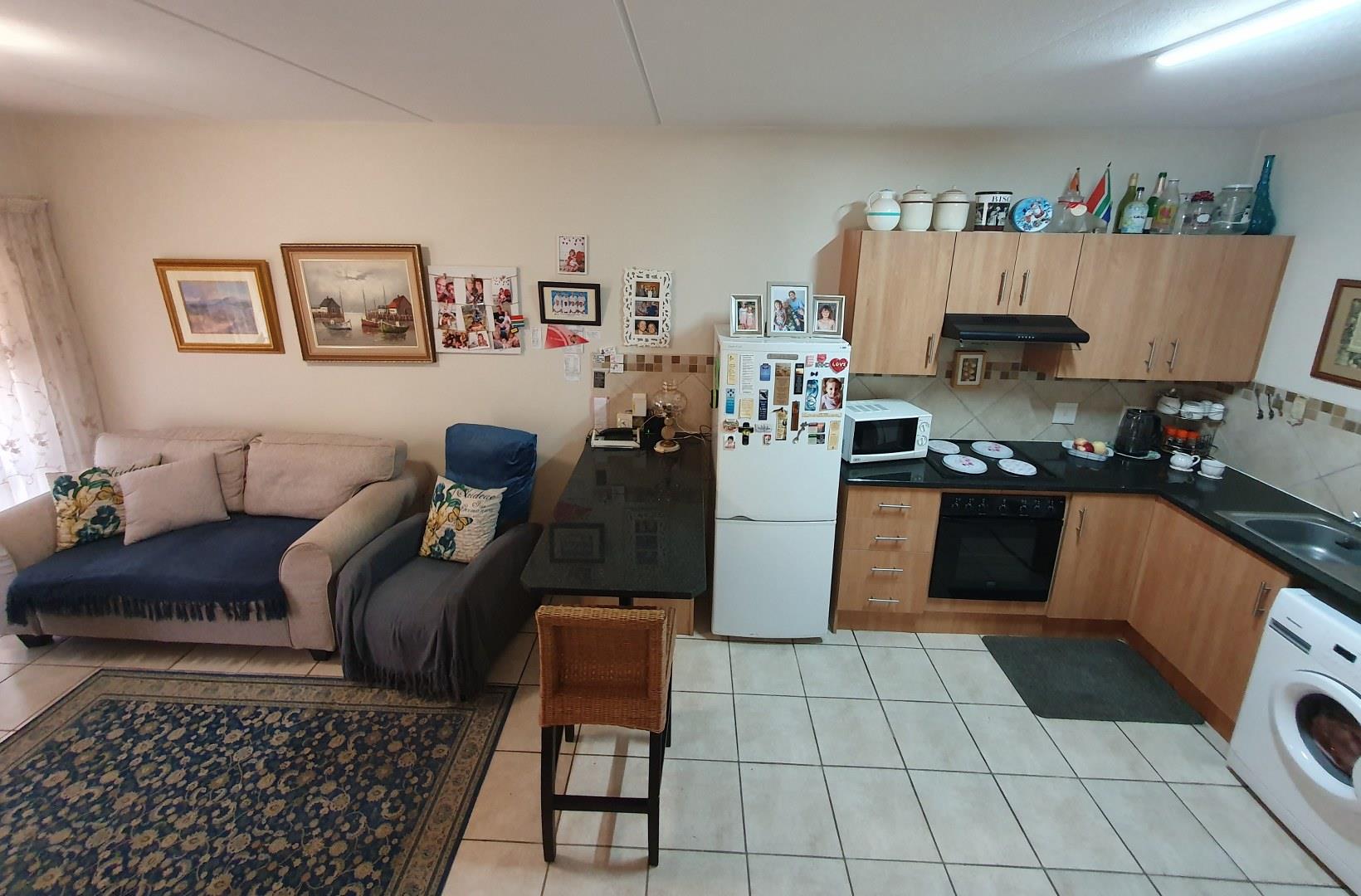 Open-plan kitchen and lounge leading to a private balcony overlooking a luscious garden