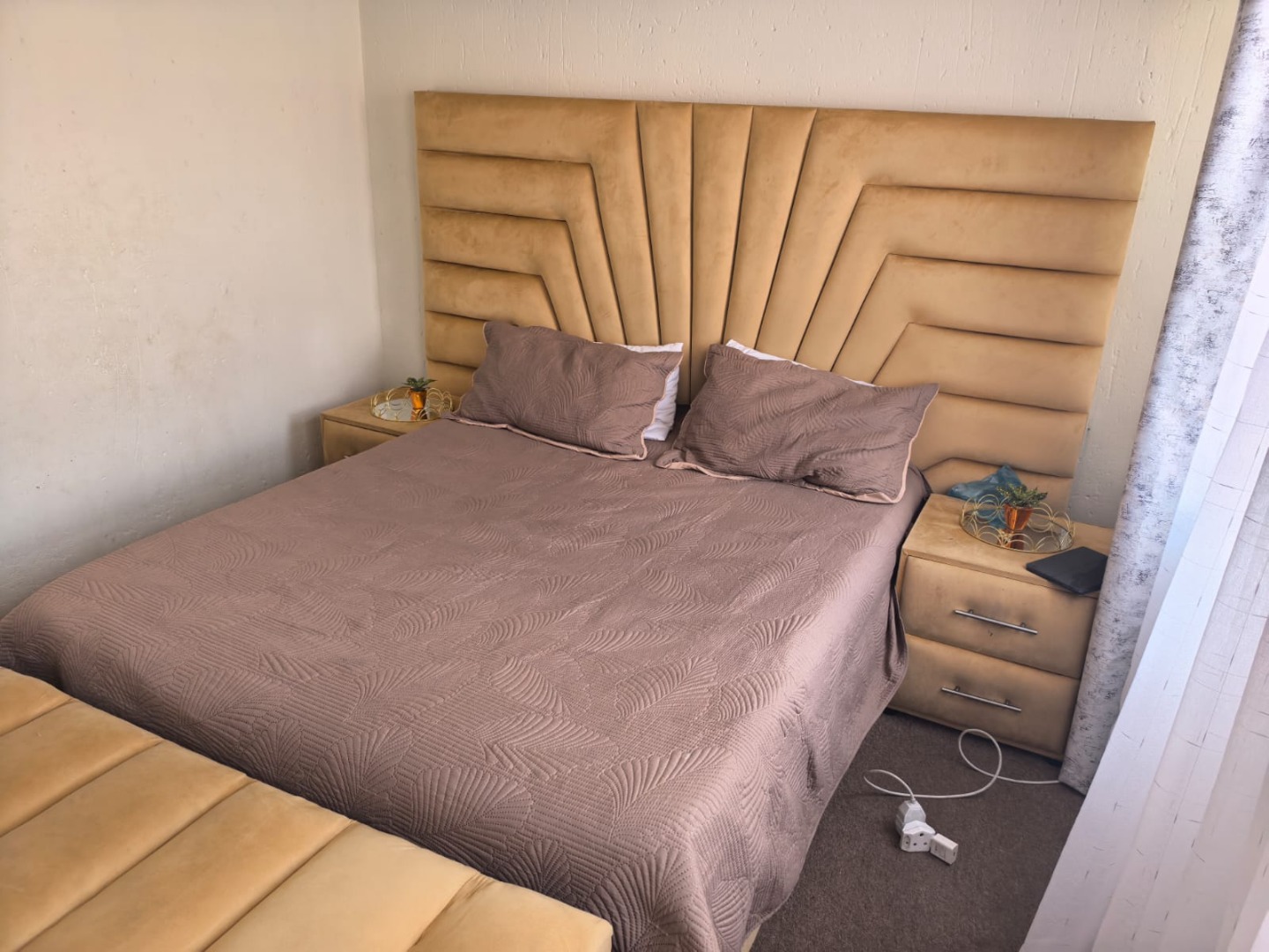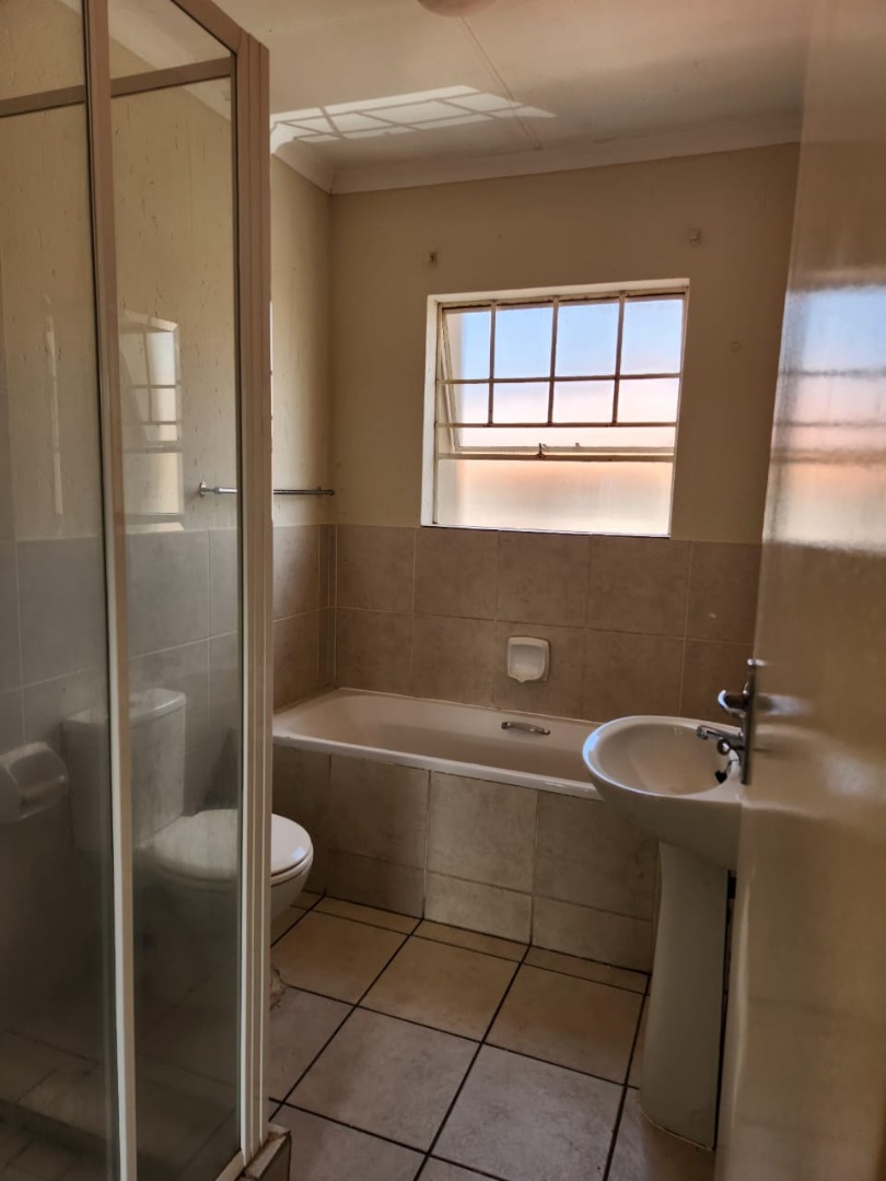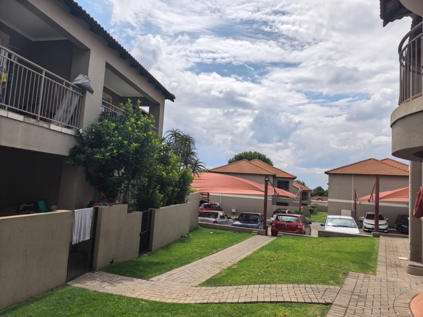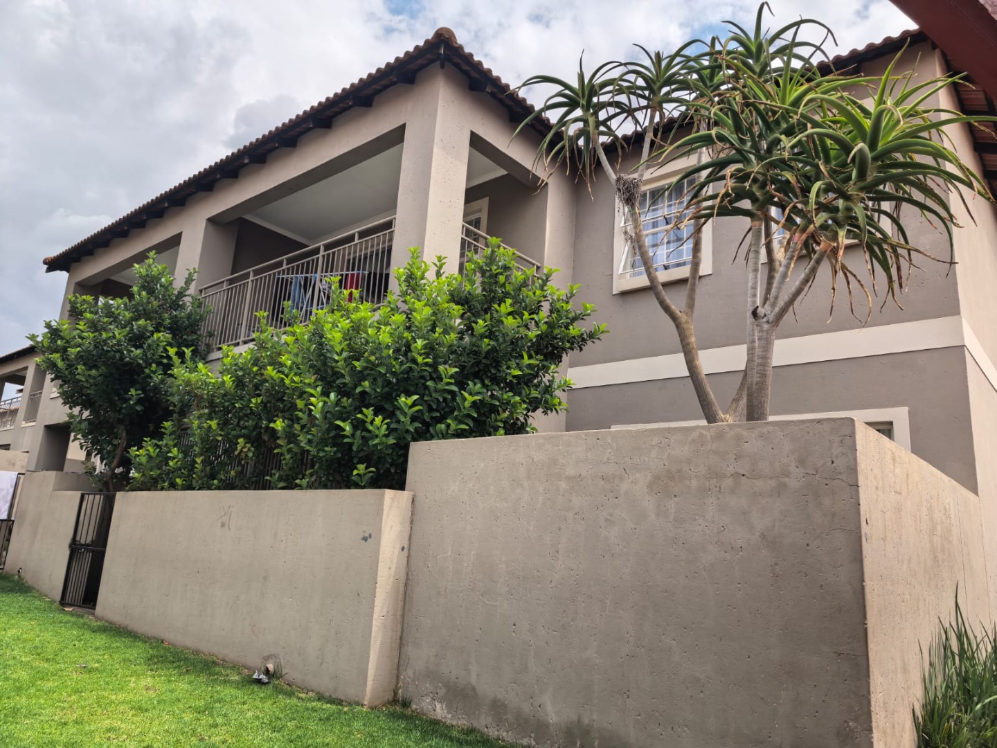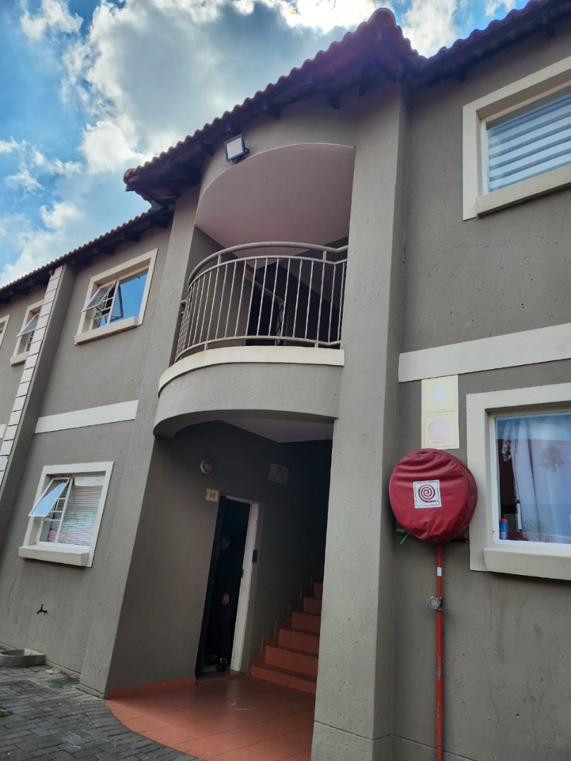 The property presents a modern architectural style with a warm grey exterior and balconies, set within a well-maintained complex. Lush landscaping, including a distinctive mature aloe tree, enhances the welcoming first impression, offering a pleasant suburban environment. Step inside to discover a thoughtfully designed 73 sqm floor plan featuring an open-plan living and dining area, perfect for contemporary lifestyles. Tiled flooring throughout ensures practicality and ease of maintenance. The spacious lounge area benefits from ample natural light, with a sliding glass door providing access to an outdoor space. The kitchen is efficiently laid out with light wood-look cabinets, black countertops, a double sink, and an integrated electric hob/stove. A functional island with bar seating creates a versatile space for casual dining or entertaining. This apartment offers two comfortable bedrooms, each designed to provide a private retreat. The main bedroom boasts a large, stylish upholstered bed with an impressive headboard, complemented by coordinated furniture and excellent natural light from large windows. The single well-appointed bathroom serves both bedrooms. Enjoy the fresh air and residential views from your private tiled balcony, an ideal spot for relaxation. The property includes two dedicated parking spaces, adding convenience for residents. Located within a security complex, this home offers peace of mind and a secure living environment. Situated in the suburban area of Cloverdene, Benoni, this property offers a convenient location within South Africa's Gauteng province. Residents benefit from easy access to local amenities and a community-focused atmosphere. Key Features: * 2 Bedrooms, 1 Bathroom * 73 sqm Floor Size * Open-Plan Living & Dining * Modern Kitchen with Island * Private Balcony * 2 Parking Spaces * Secure Complex Living * Tiled Flooring Throughout