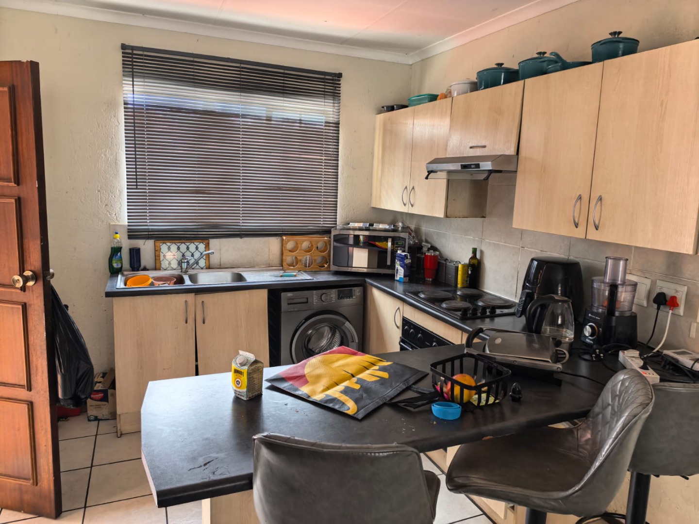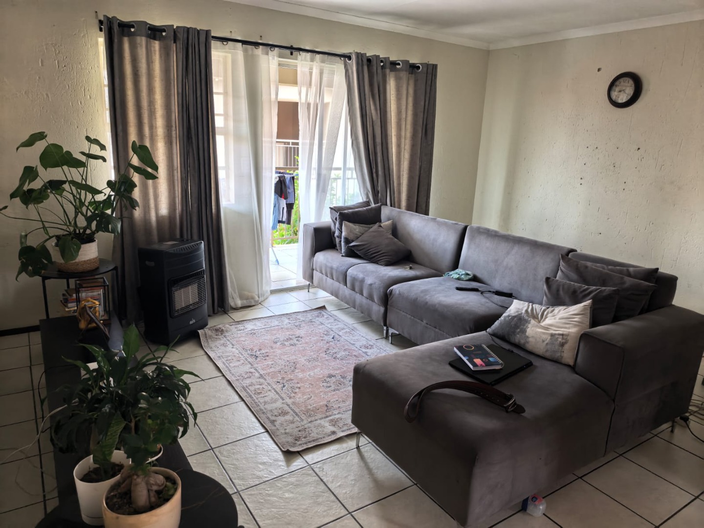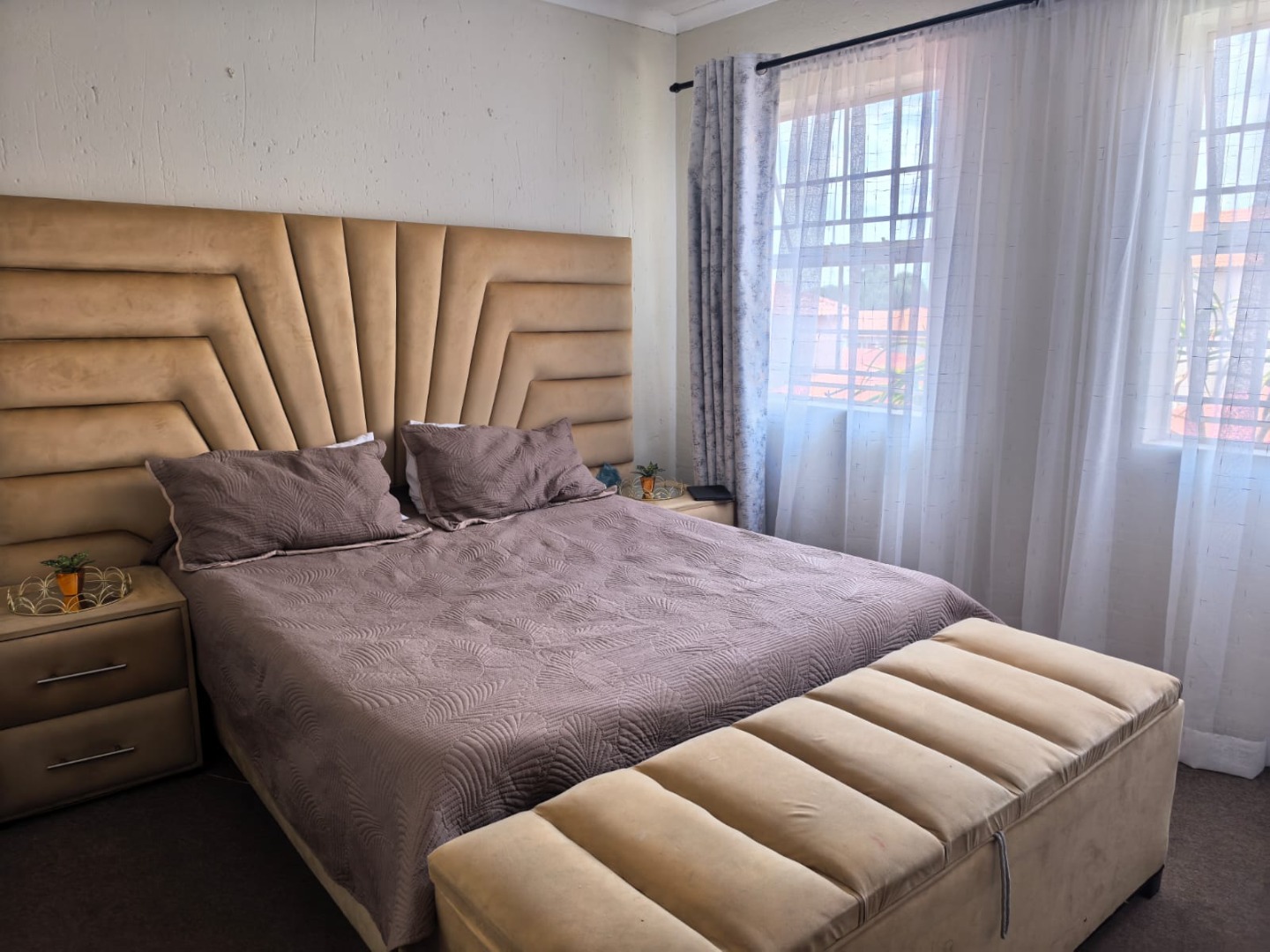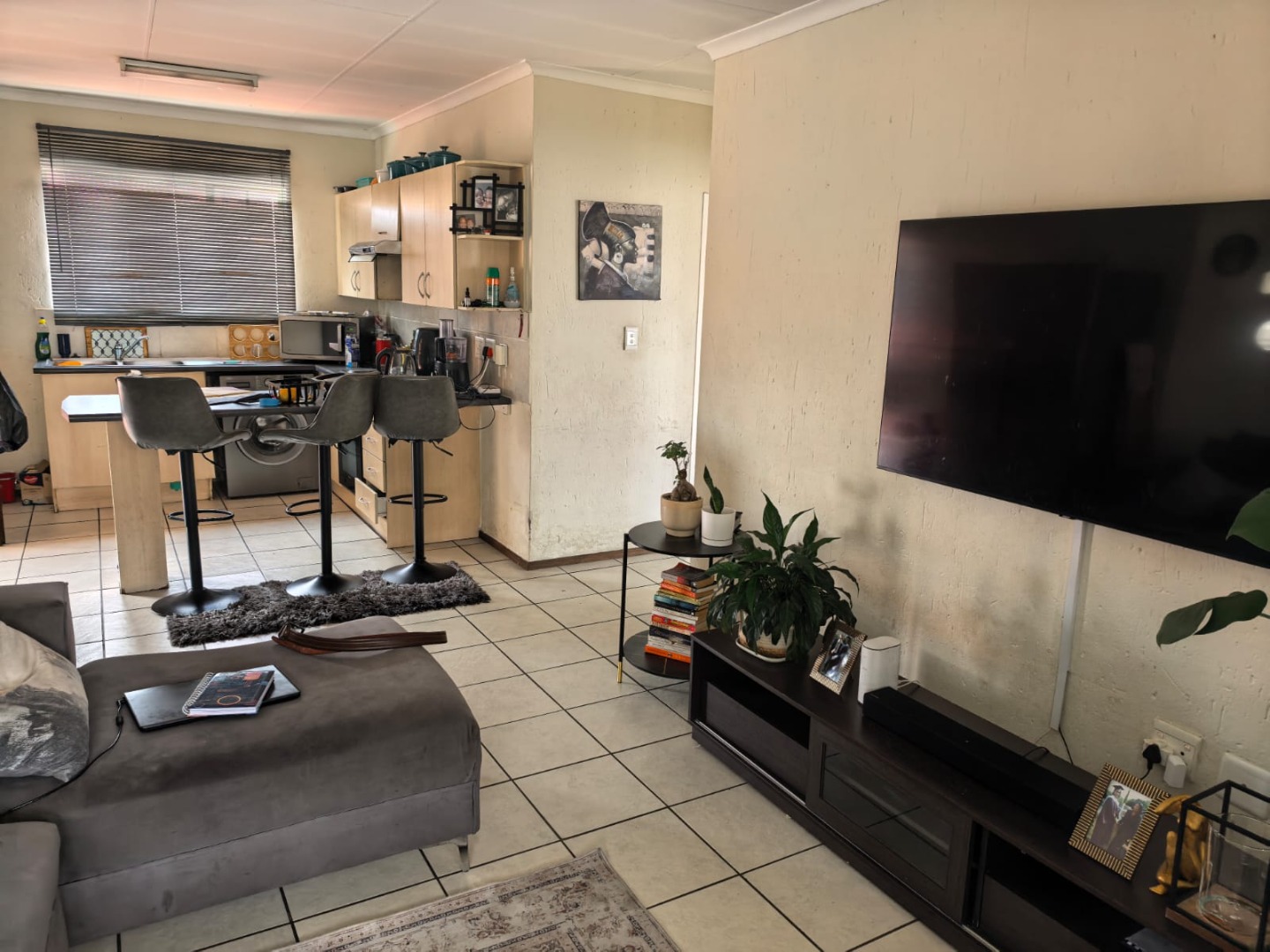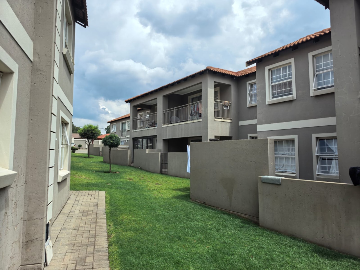 The property presents a modern architectural style with a warm grey exterior and balconies, set within a well-maintained complex. Lush landscaping, including a distinctive mature aloe tree, enhances the welcoming first impression, offering a pleasant suburban environment. Step inside to discover a thoughtfully designed 73 sqm floor plan featuring an open-plan living and dining area, perfect for contemporary lifestyles. Tiled flooring throughout ensures practicality and ease of maintenance. The spacious lounge area benefits from ample natural light, with a sliding glass door providing access to an outdoor space. The kitchen is efficiently laid out with light wood-look cabinets, black countertops, a double sink, and an integrated electric hob/stove. A functional island with bar seating creates a versatile space for casual dining or entertaining. This apartment offers two comfortable bedrooms, each designed to provide a private retreat. The main bedroom boasts a large, stylish upholstered bed with an impressive headboard, complemented by coordinated furniture and excellent natural light from large windows. The single well-appointed bathroom serves both bedrooms. Enjoy the fresh air and residential views from your private tiled balcony, an ideal spot for relaxation. The property includes two dedicated parking spaces, adding convenience for residents. Located within a security complex, this home offers peace of mind and a secure living environment. Situated in the suburban area of Cloverdene, Benoni, this property offers a convenient location within South Africa's Gauteng province. Residents benefit from easy access to local amenities and a community-focused atmosphere. Key Features: * 2 Bedrooms, 1 Bathroom * 73 sqm Floor Size * Open-Plan Living & Dining * Modern Kitchen with Island * Private Balcony * 2 Parking Spaces * Secure Complex Living * Tiled Flooring Throughout