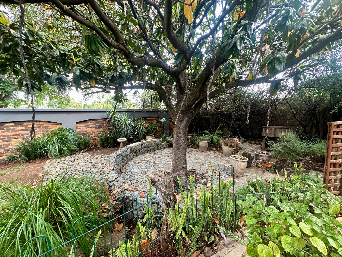The exterior boasts extensive outdoor amenities designed for practicality and leisure. A cobblestone-style paved driveway leads to a large covered carport, accommodating up to six vehicles, including a dedicated garage. The established garden features mature trees, a stone-paved patio with unique gabion-style seating, and diverse plantings, creating a serene environment. Additional features include staff quarters and an outbuilding/shed for extra storage.