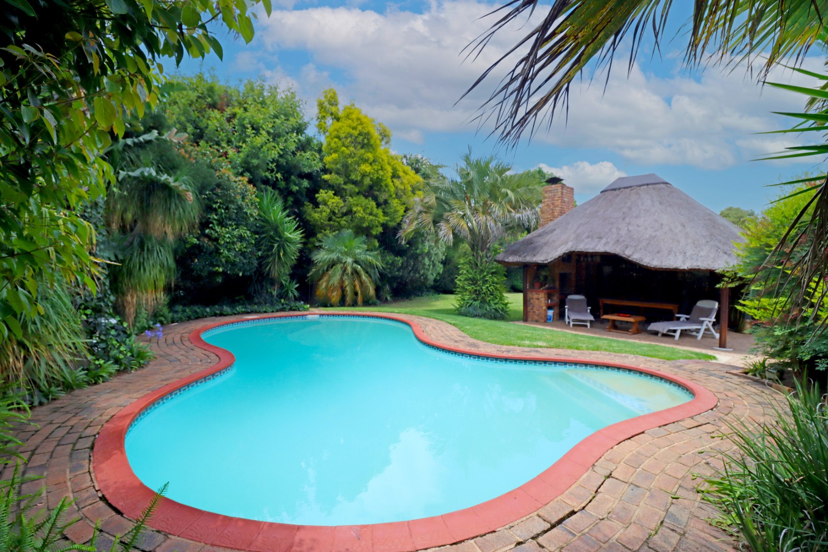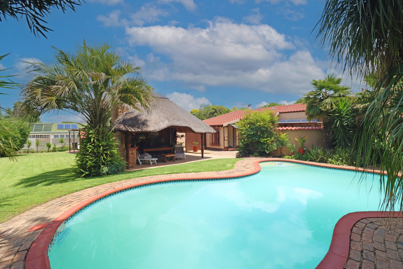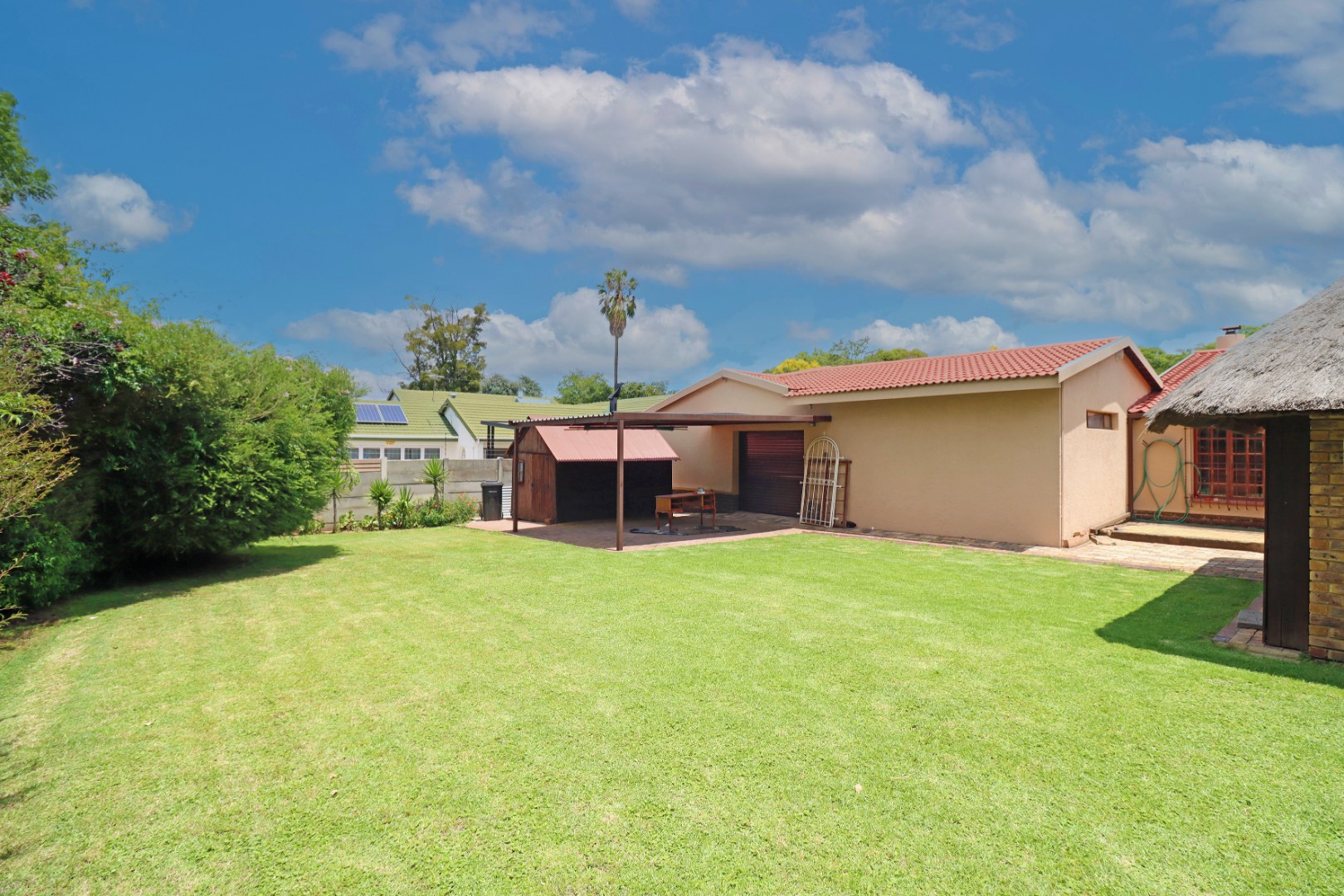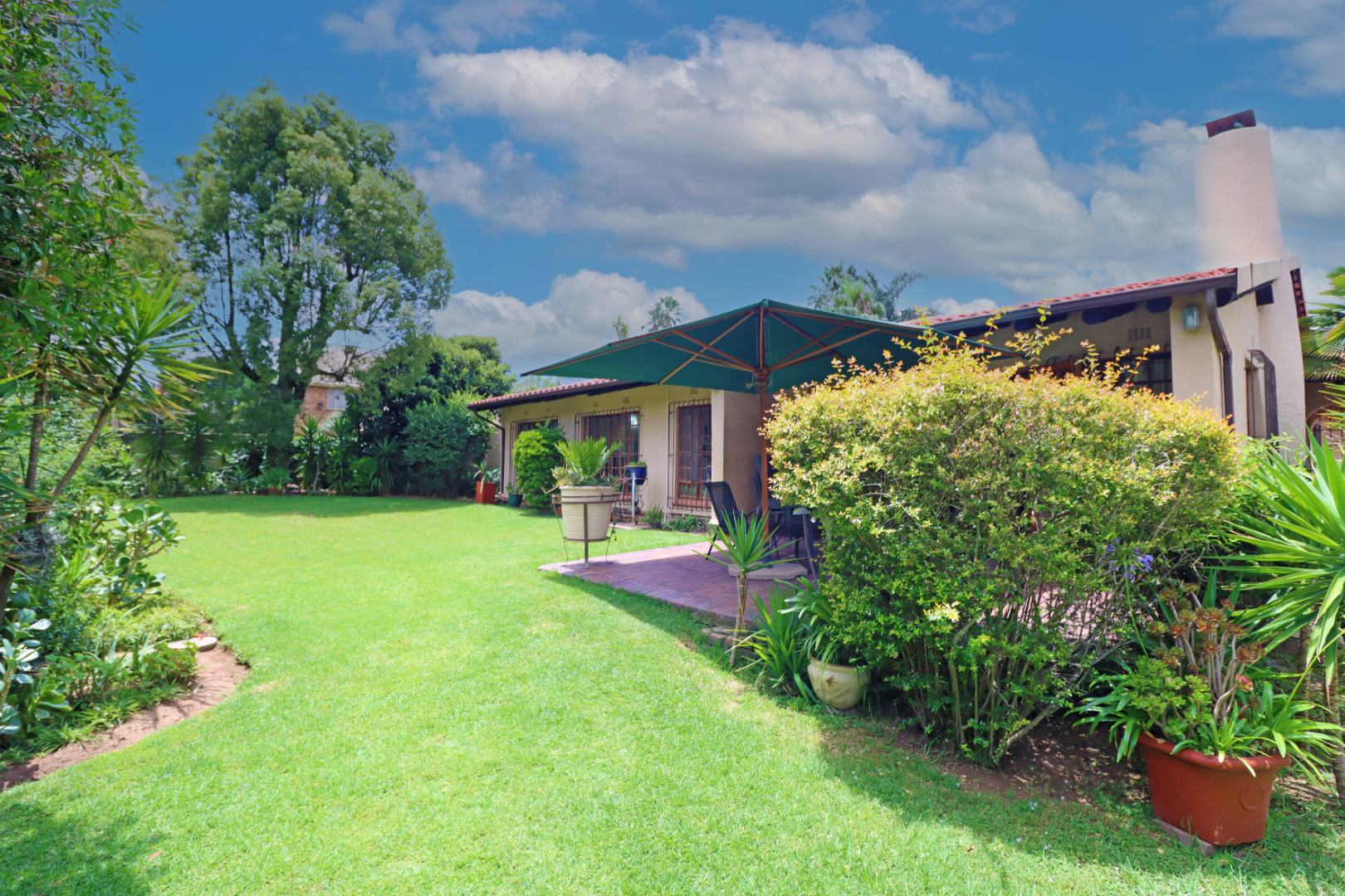 Step outside to a private oasis featuring a sparkling swimming pool, perfect for relaxation and recreation. The property includes a thatched lapa with a built-in braai, creating an ideal setting for outdoor entertaining. The lush garden, complete with a Wendy house and outside toilet, offers a serene environment for pets and children to enjoy. Parking is abundant with three garages and additional secure parking spaces.