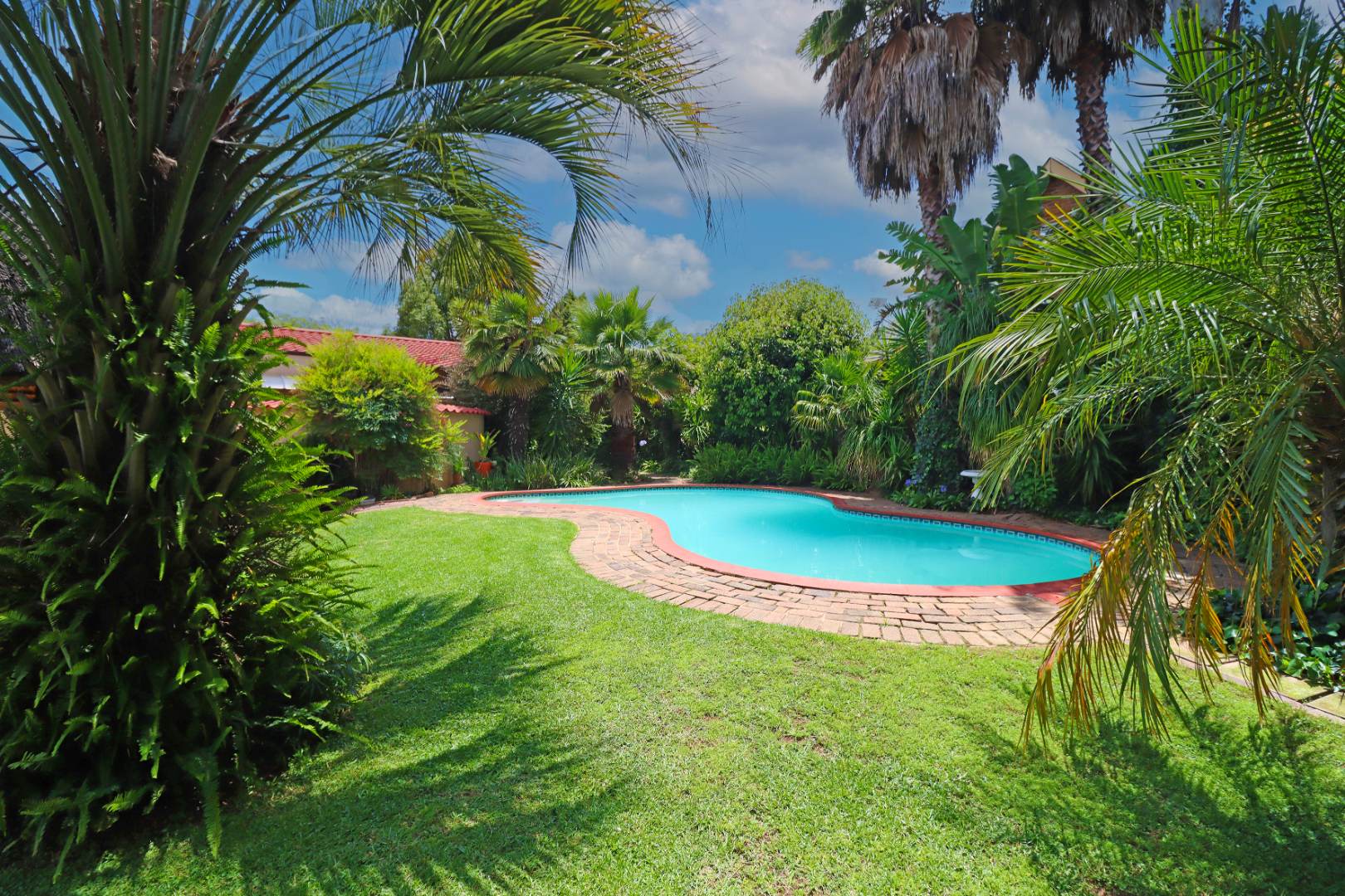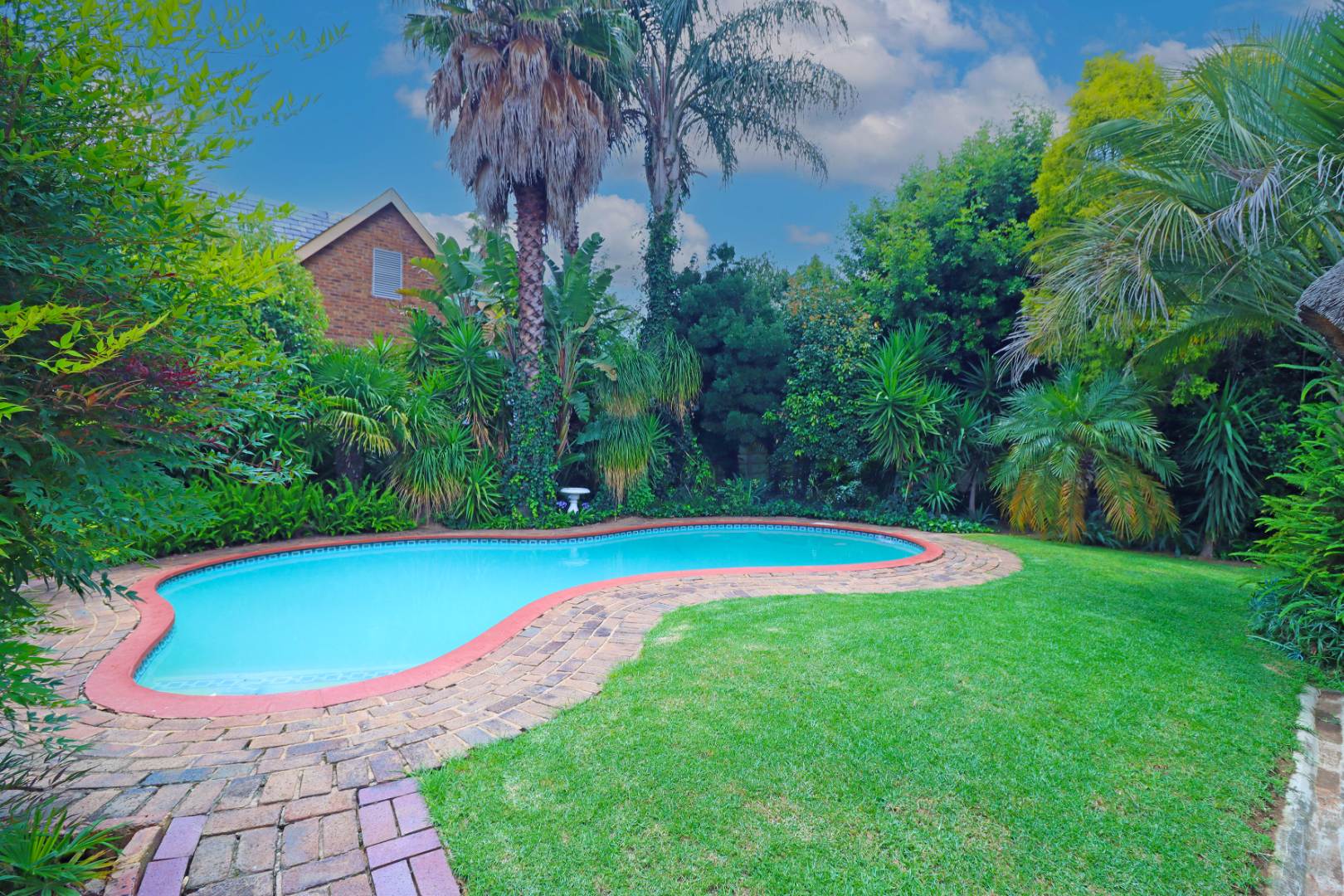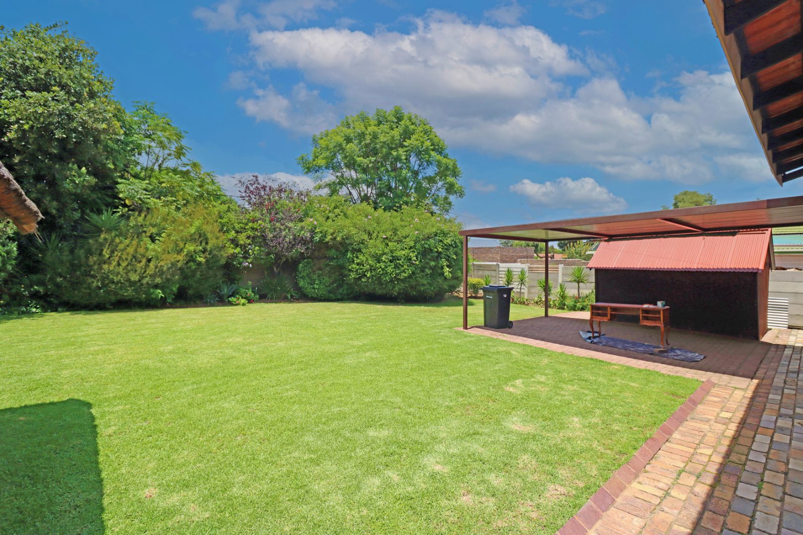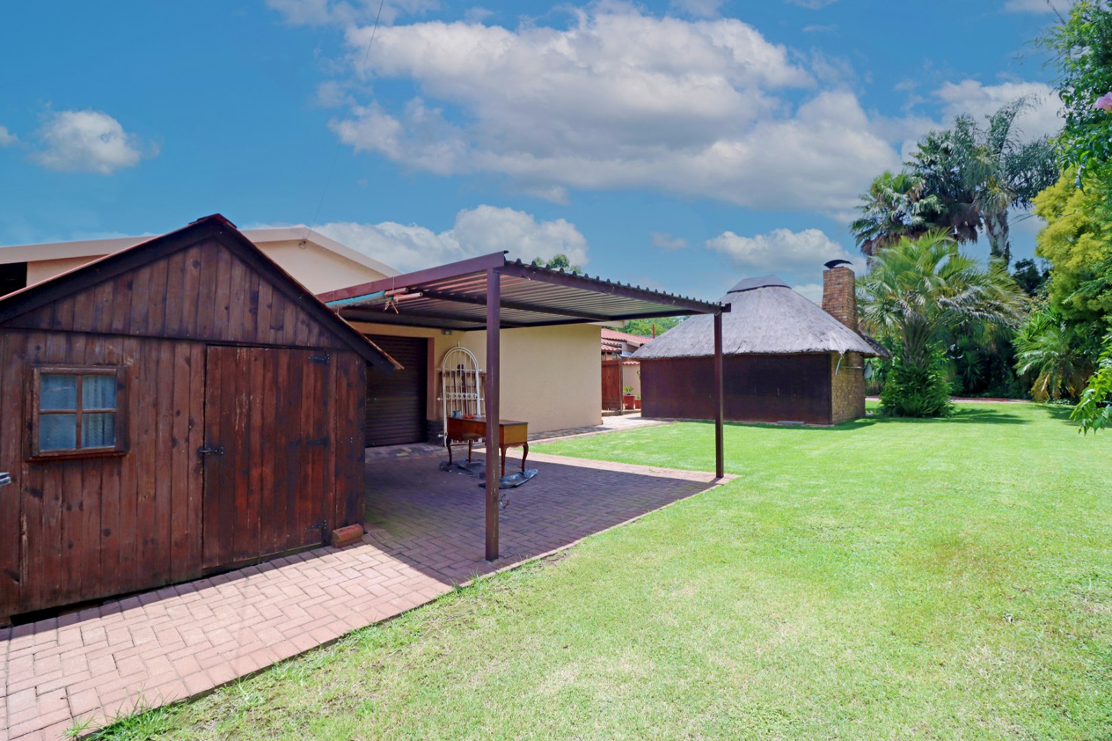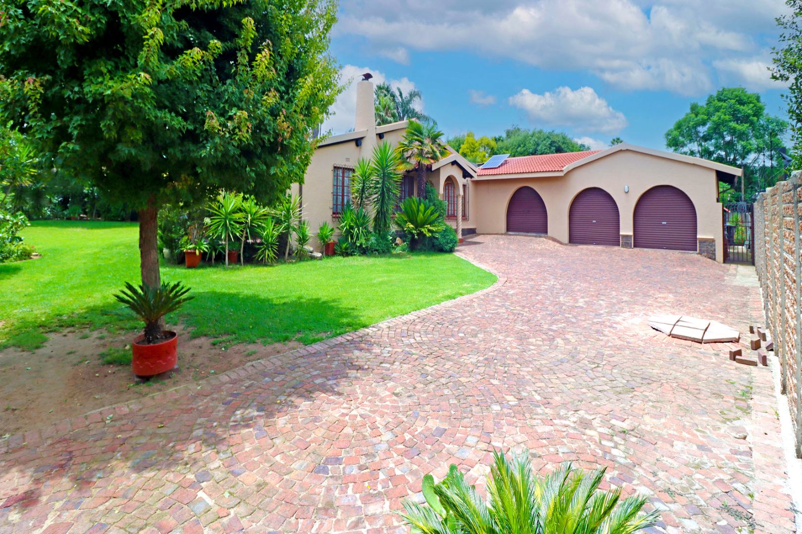 Step outside to a private oasis featuring a sparkling swimming pool, perfect for relaxation and recreation. The property includes a thatched lapa with a built-in braai, creating an ideal setting for outdoor entertaining. The lush garden, complete with a Wendy house and outside toilet, offers a serene environment for pets and children to enjoy. Parking is abundant with three garages and additional secure parking spaces.