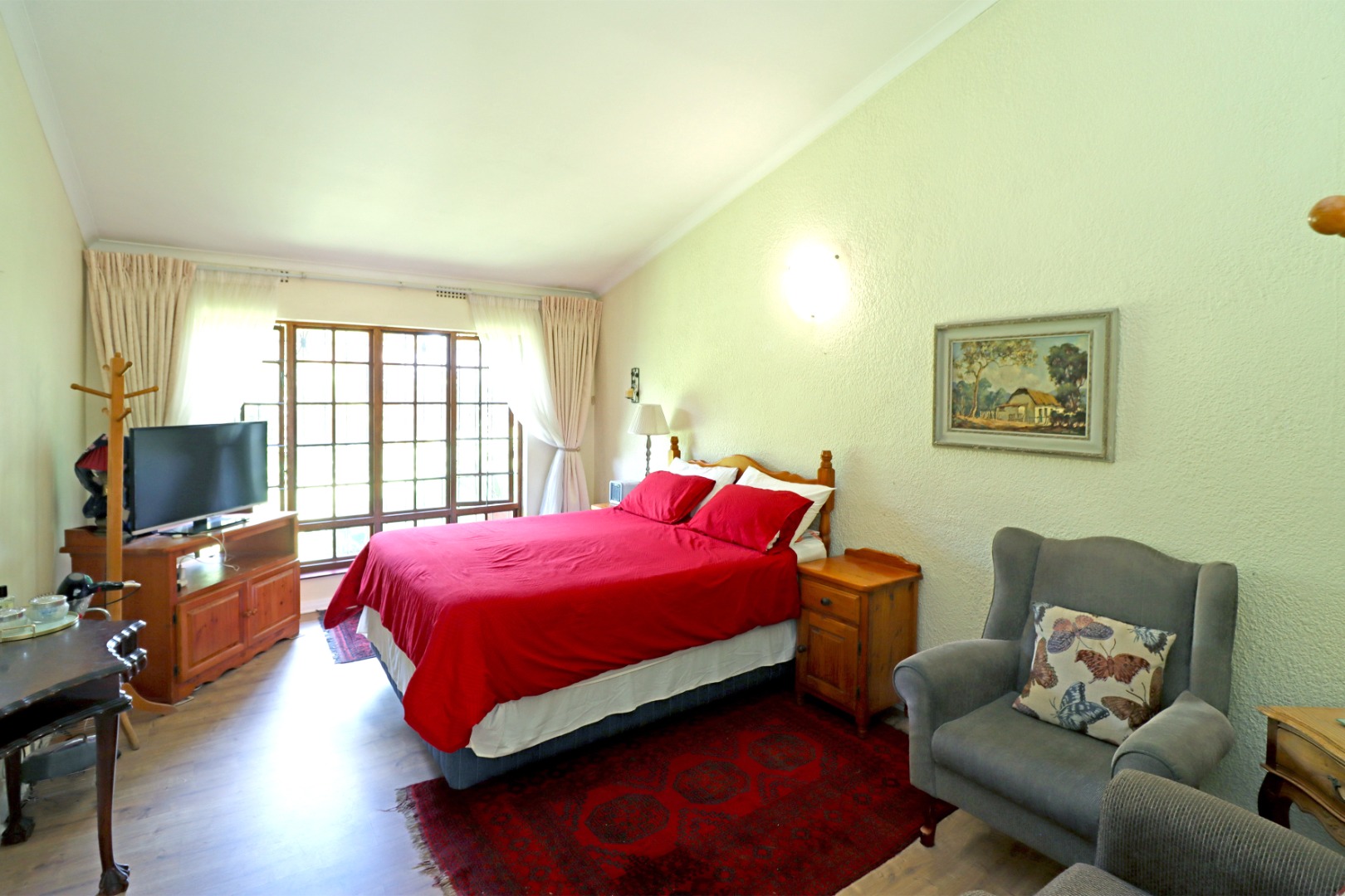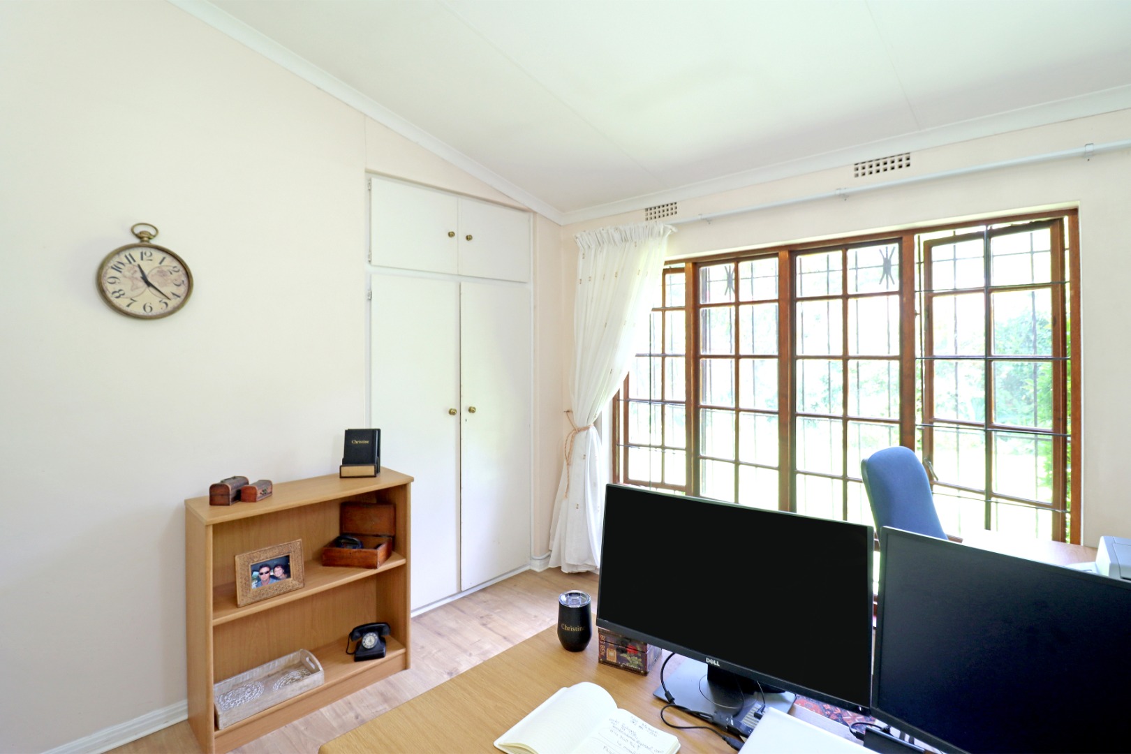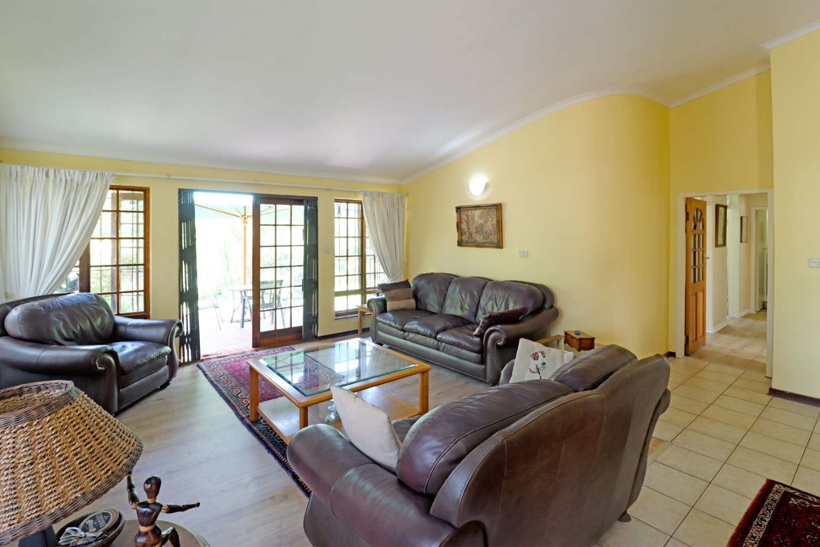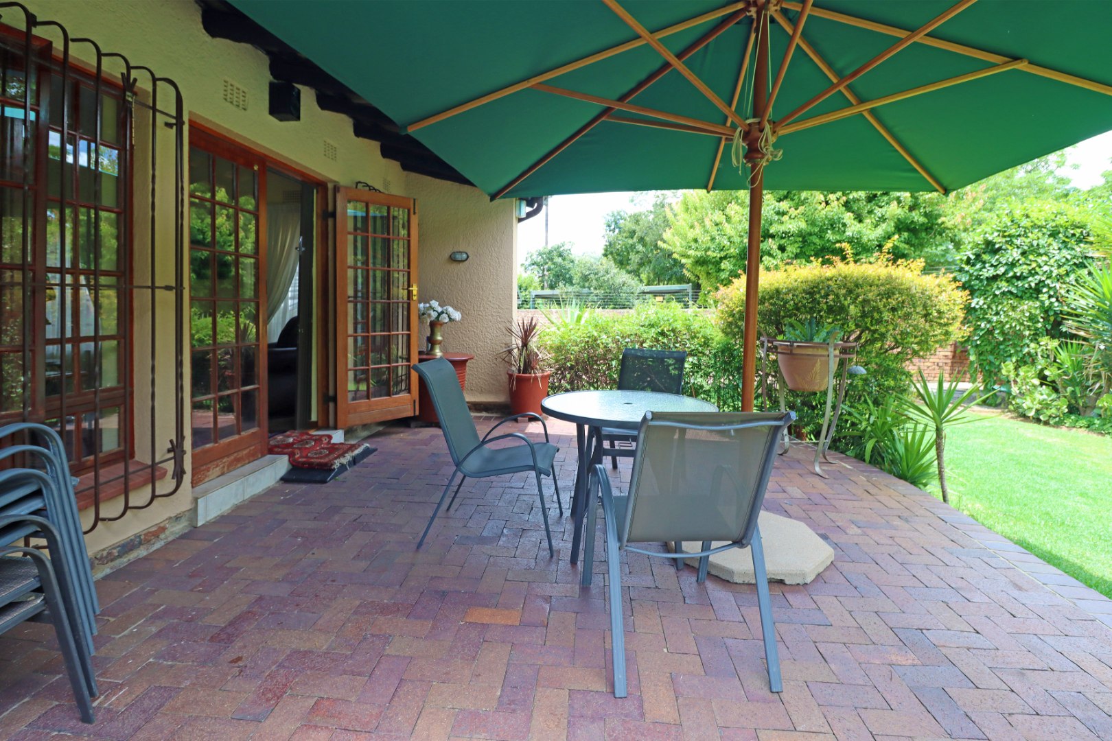 Step outside to a private oasis featuring a sparkling swimming pool, perfect for relaxation and recreation. The property includes a thatched lapa with a built-in braai, creating an ideal setting for outdoor entertaining. The lush garden, complete with a Wendy house and outside toilet, offers a serene environment for pets and children to enjoy. Parking is abundant with three garages and additional secure parking spaces.