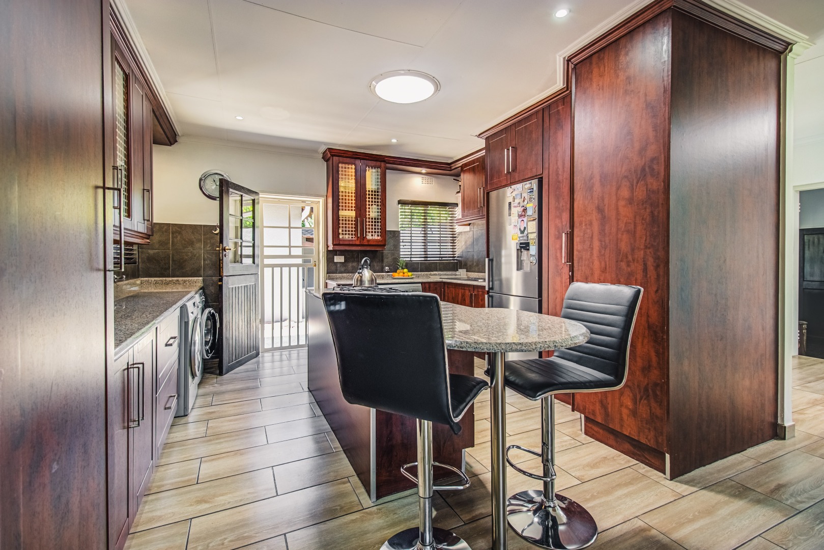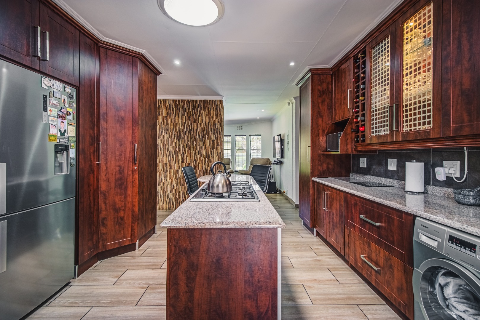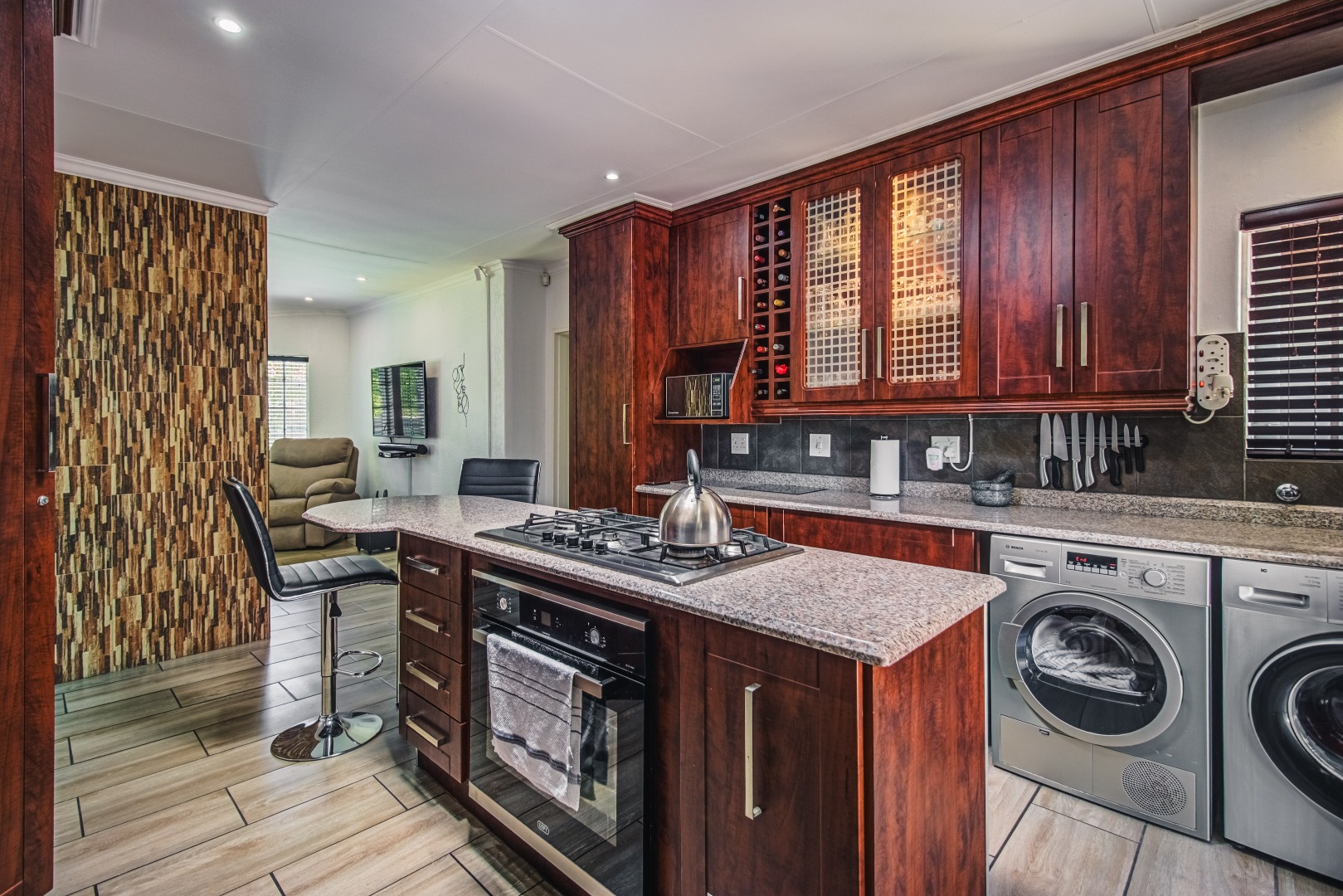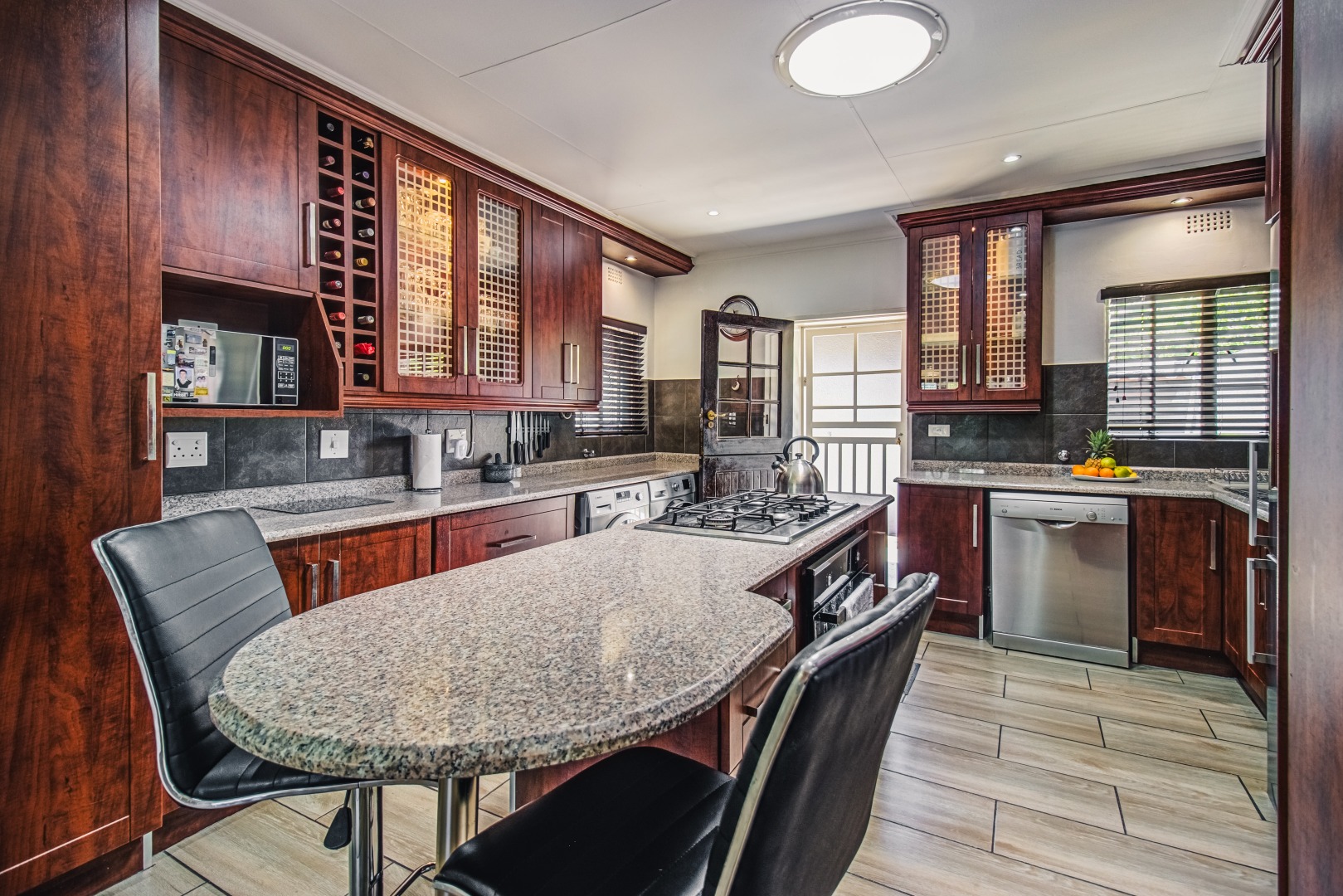 A welcoming entrance hall leads into an expansive open plan living area, seamlessly connecting the lounge with its open fireplace and featured windows and dining room. The kitchen is stunning with its granite tops, solid cabinets, breeakfast counter and gas stove and opens onto a fabulous, sunny courtyard.