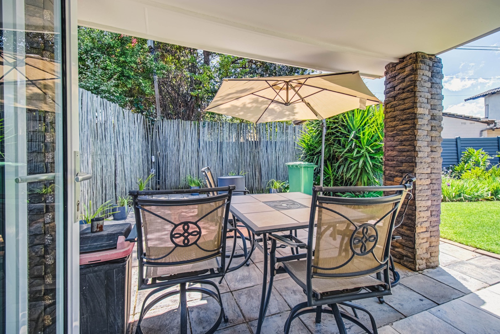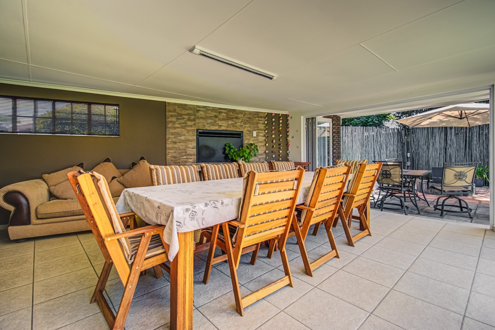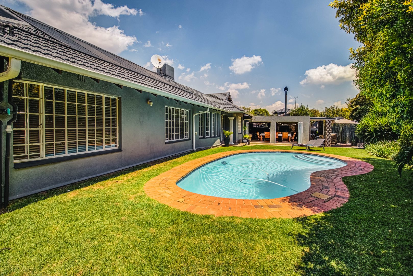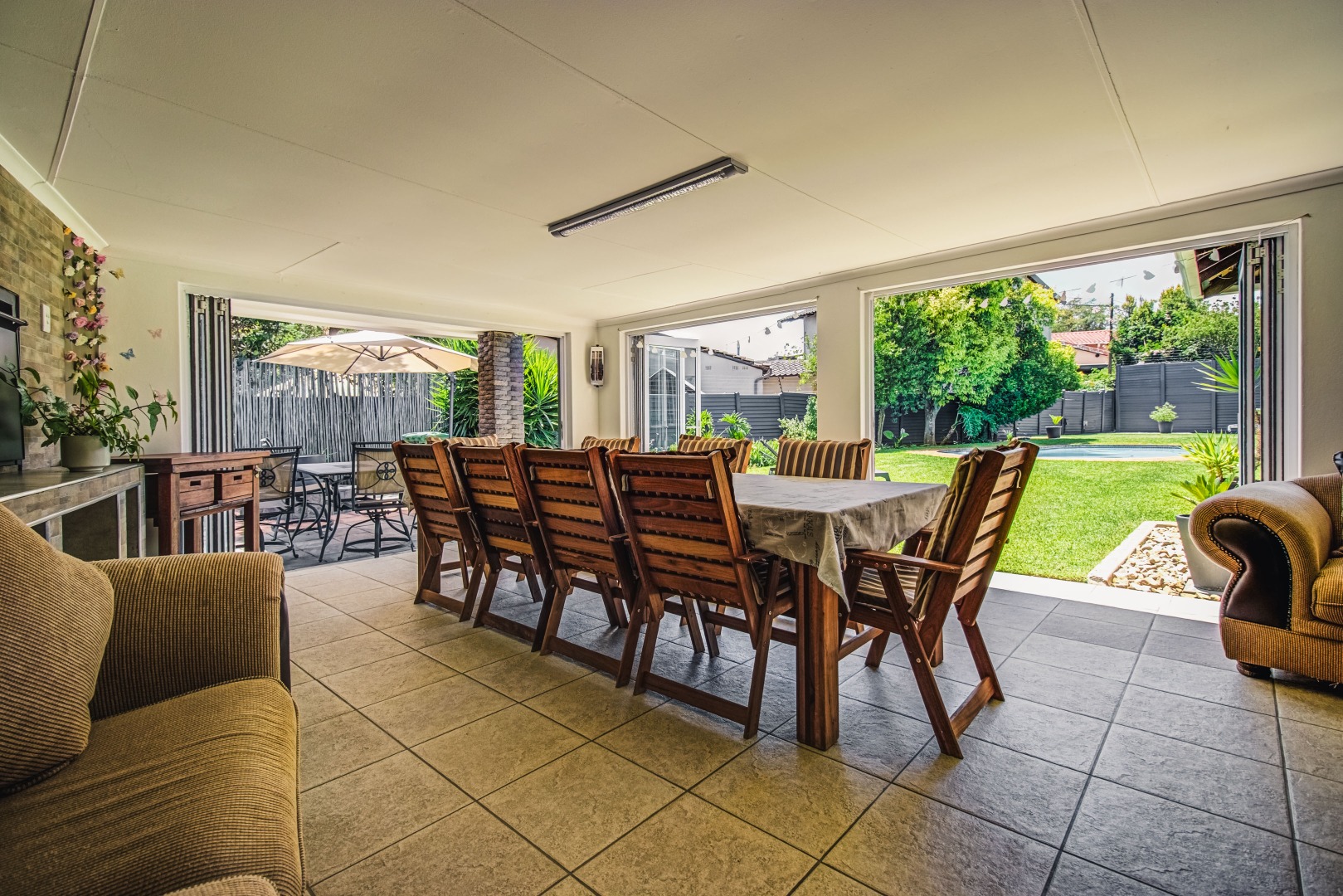 Step outside to a private oasis featuring a sparkling heated swimming pool within a lush, established garden. The covered entertainment with its all round stacker doors area extends living outdoors, perfect for al fresco dining. Its built in bar comes with a built in keg and the built in braai and this area is perfect for year round entertainment.