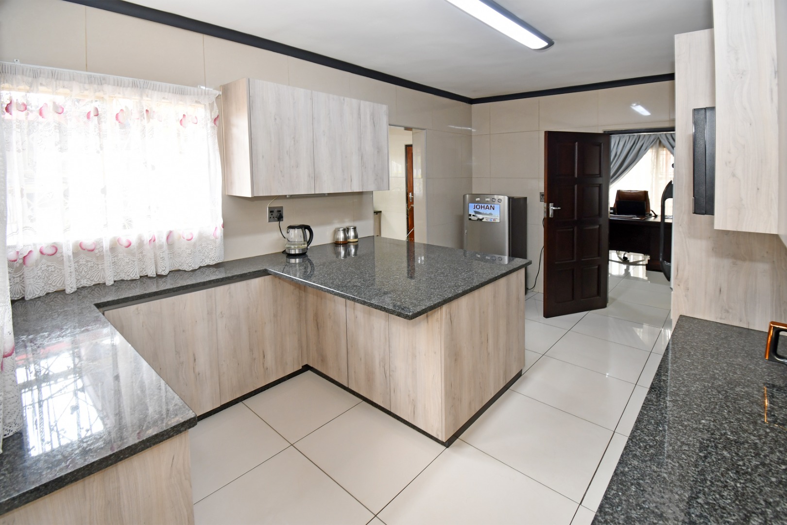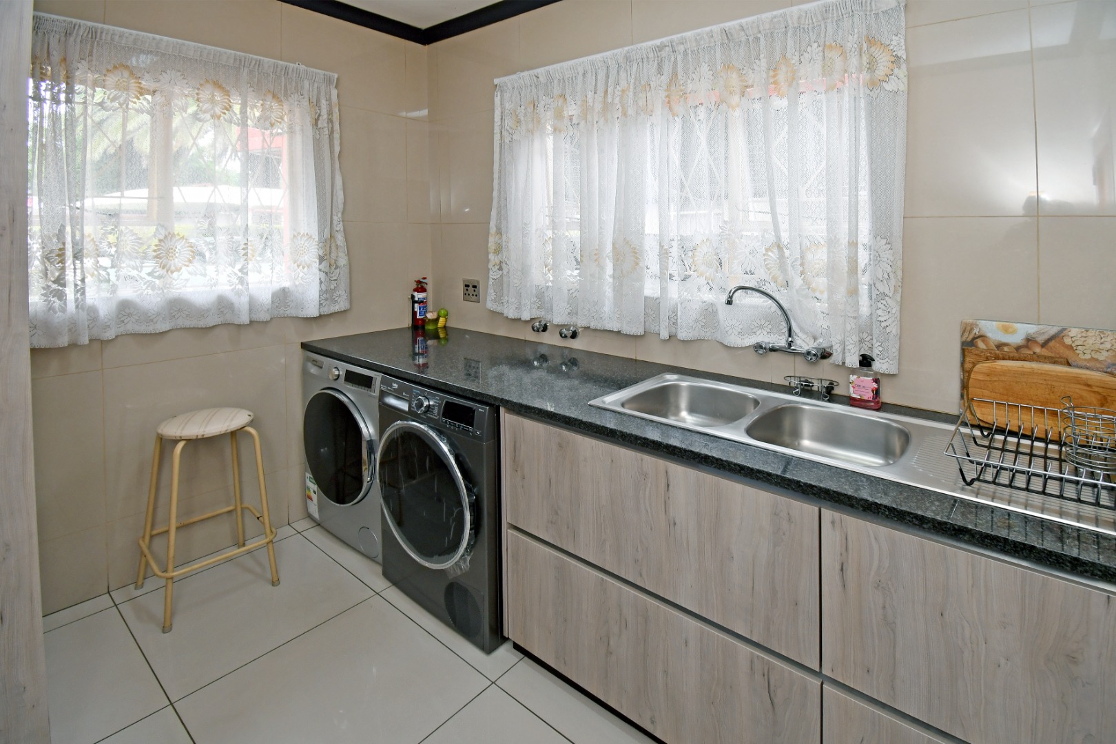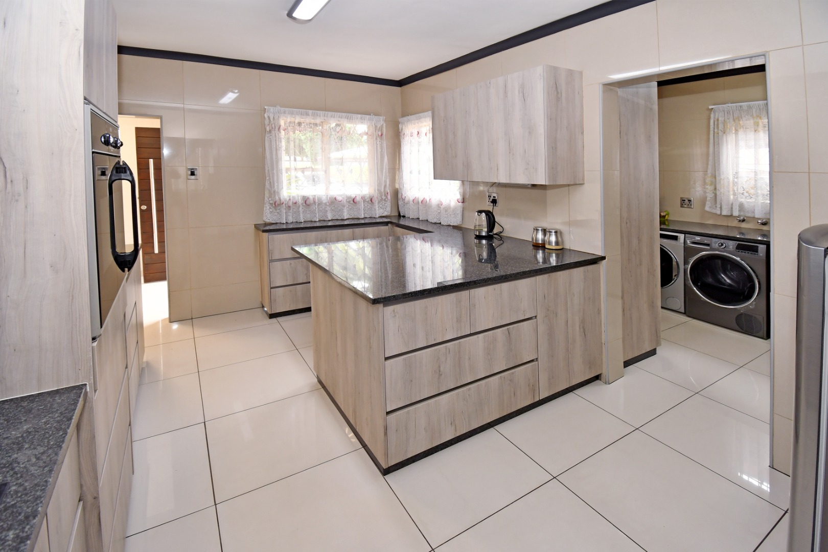 The stunning kitchen boasts ample cupboard space, granite tops, a breakfast counter, under-counter oven with hob, space for a double-door fridge, and room for three under-counter appliances.