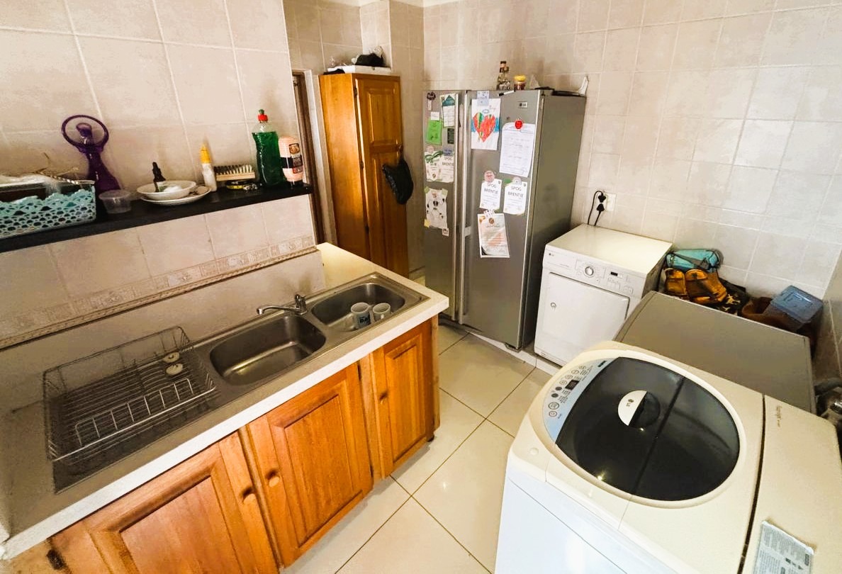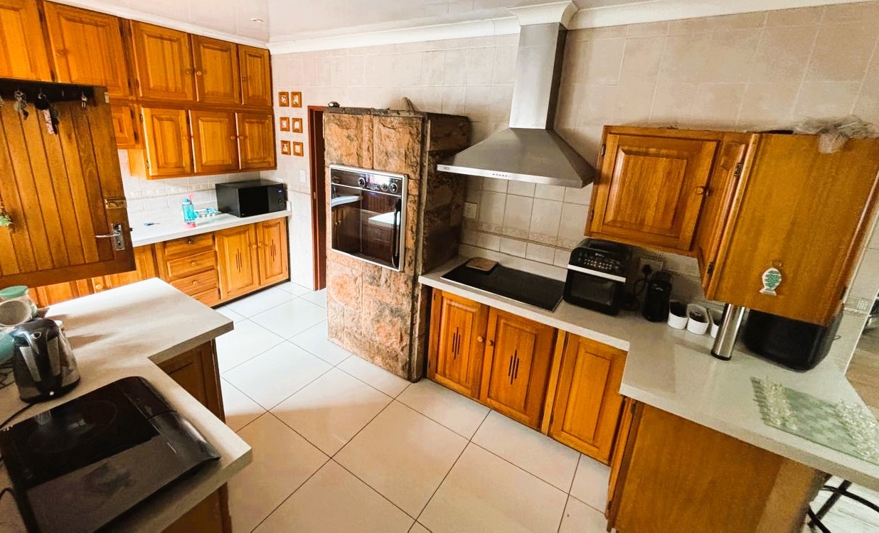The stunning kitchen boasts ample cupboard space, granite tops, a breakfast counter, under-counter oven with hob, space for a double-door fridge, and room for three under-counter appliances in the scullery.