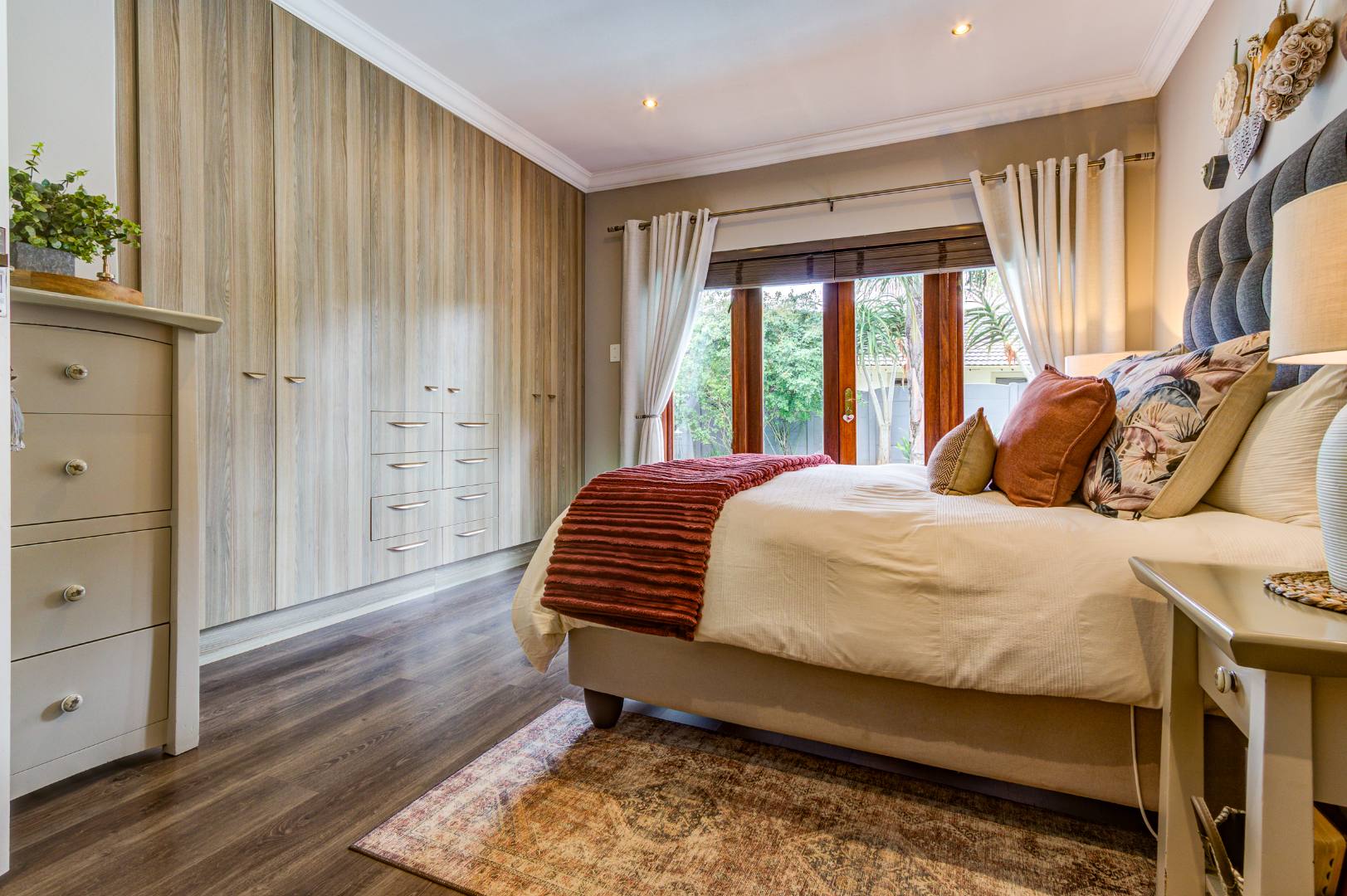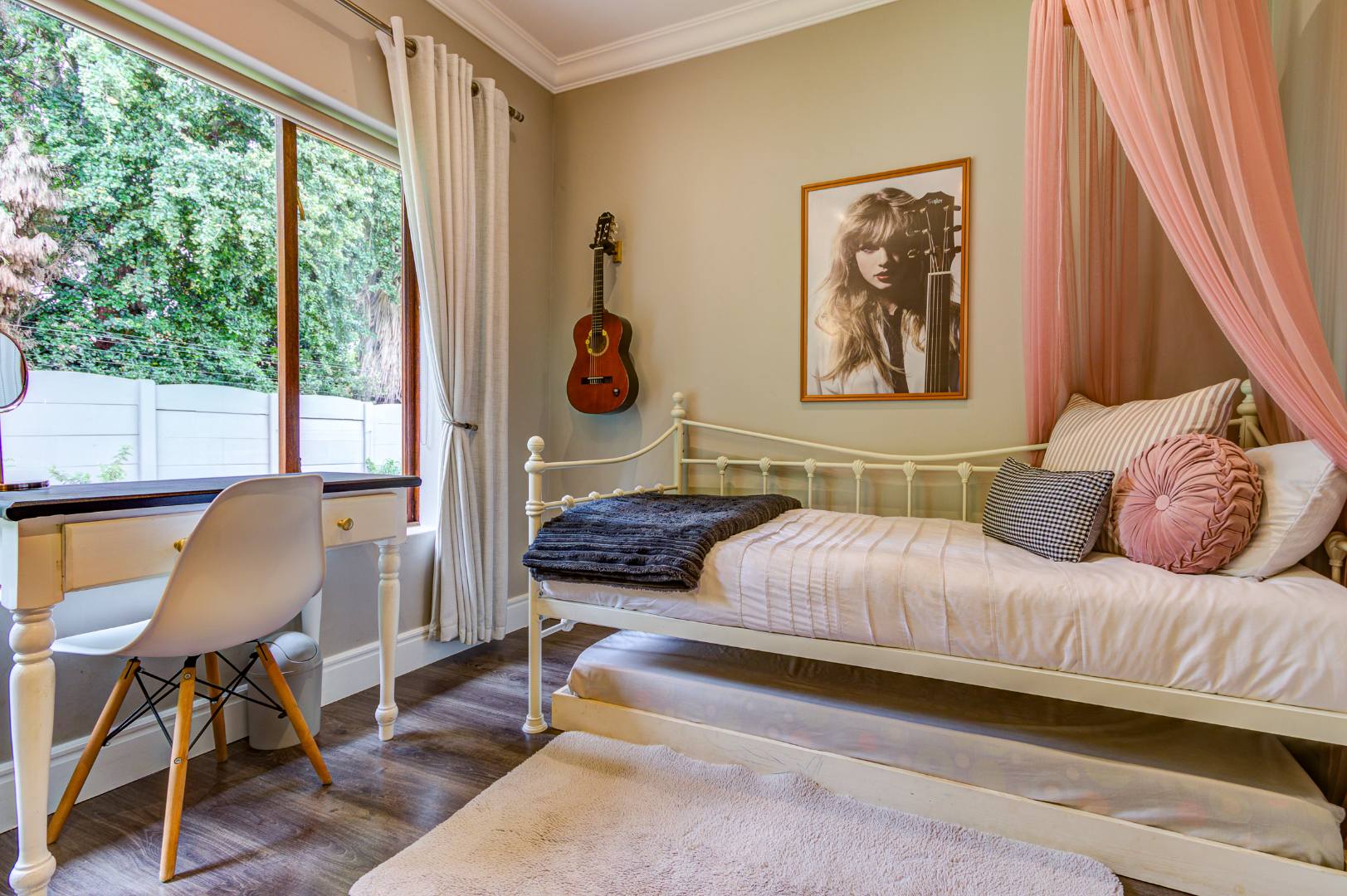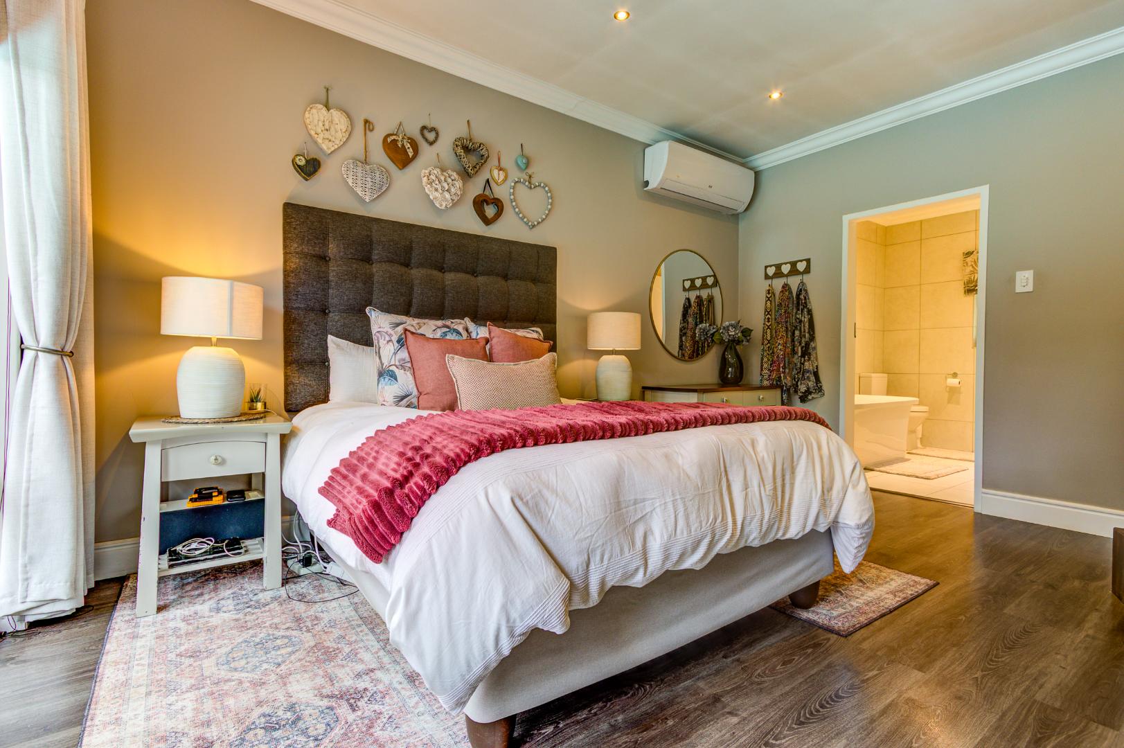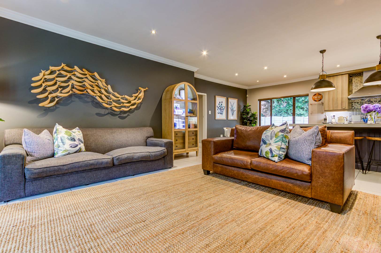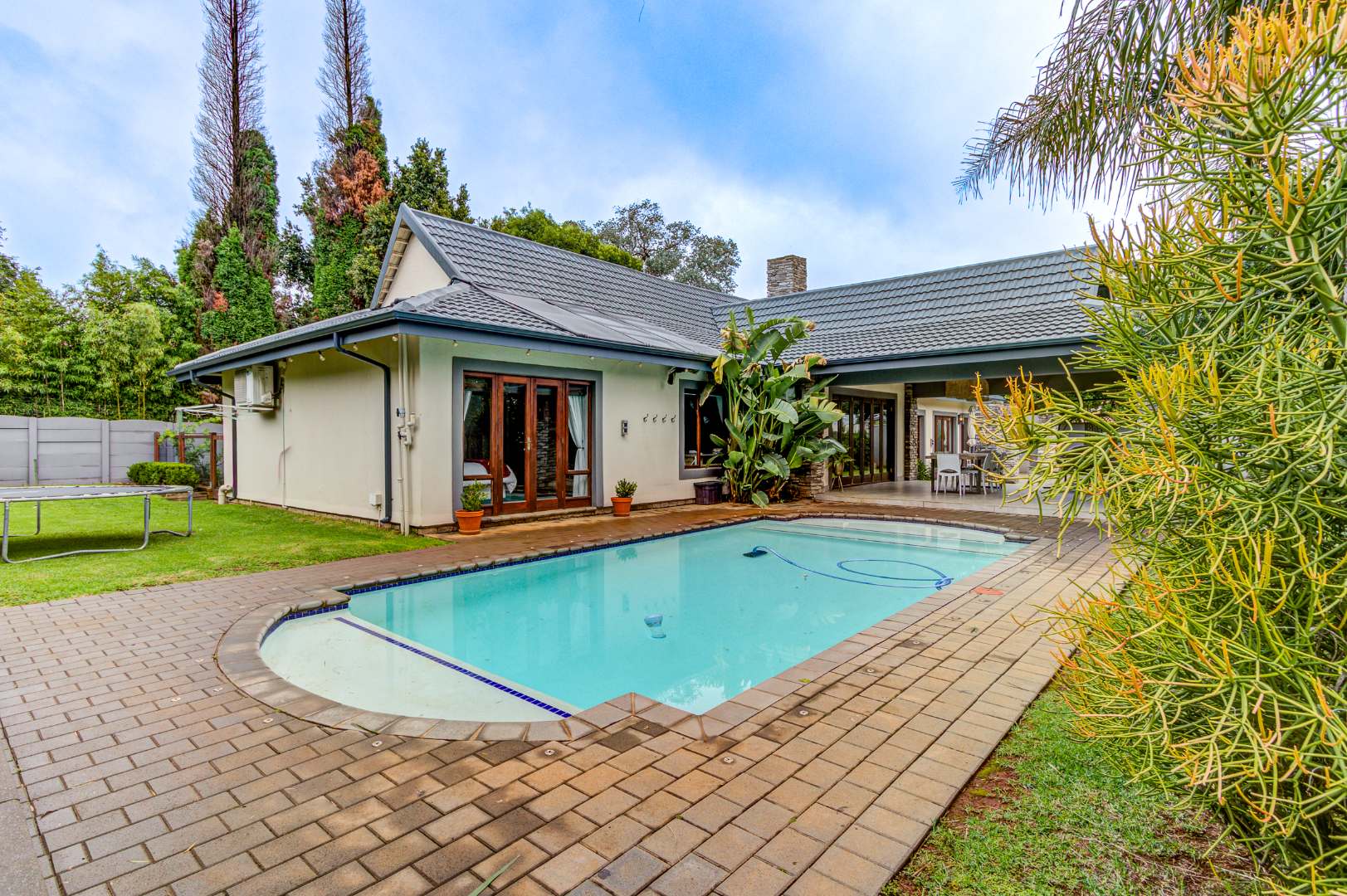 Step inside to an inviting entrance hall that ushers you into a world of refined living. The open-plan design seamlessly connects the spacious lounge, dining room, and a well-appointed kitchen complete with a scullery. Natural light floods the interiors through large wooden French doors, illuminating the neutral palette, elegant crown molding, and pristine tiled flooring. A versatile multi-purpose flat, currently configured with a lounge, 2 bedrooms and full bathroom, offers exceptional flexibility, while a dedicated study provides a quiet retreat. Over and above the two bedrooms in the flat, the home boasts three generously proportioned bedrooms, including a luxurious en-suite bathroom, alongside a second bathroom, ensuring comfort and privacy for all.