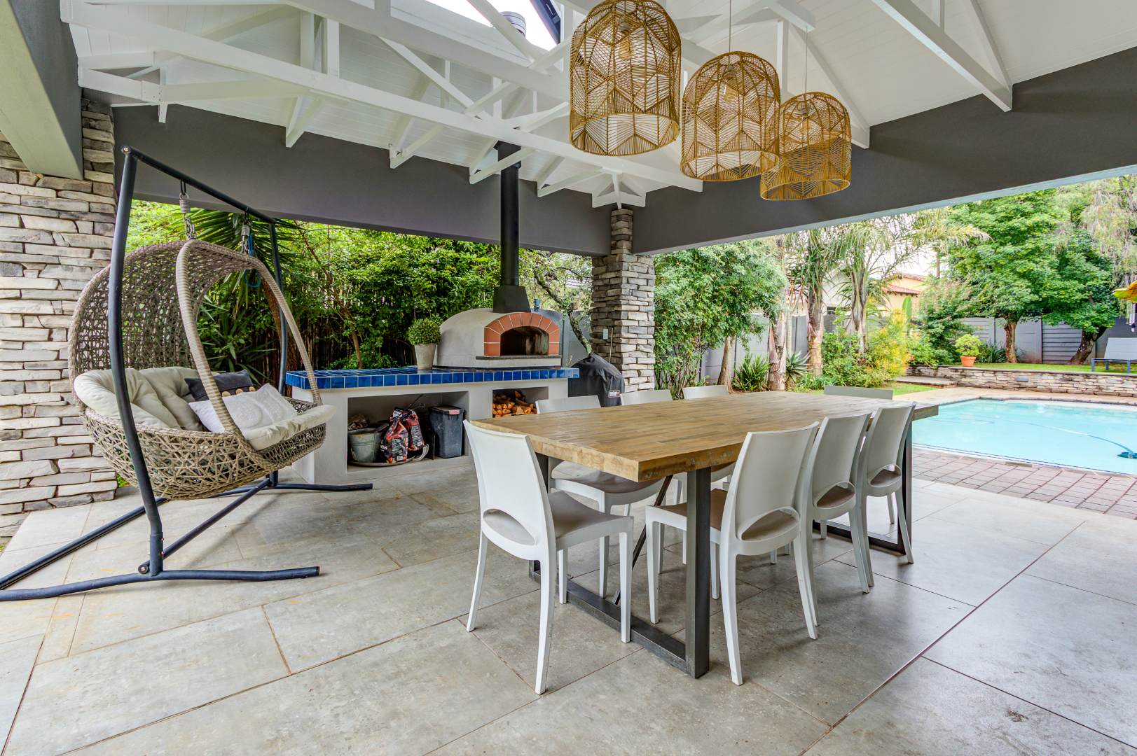 Beyond the interiors, an unparalleled outdoor oasis awaits. The expansive covered patio is an entertainer's dream, featuring a built-in pizza oven and ample space for a large dining table and a serene hanging swing chair. This magnificent area overlooks a private swimming pool, surrounded by lush, mature landscaping and additional paved patios, creating a tranquil haven for relaxation and social gatherings. The seamless indoor-outdoor flow is perfect for the discerning homeowner.