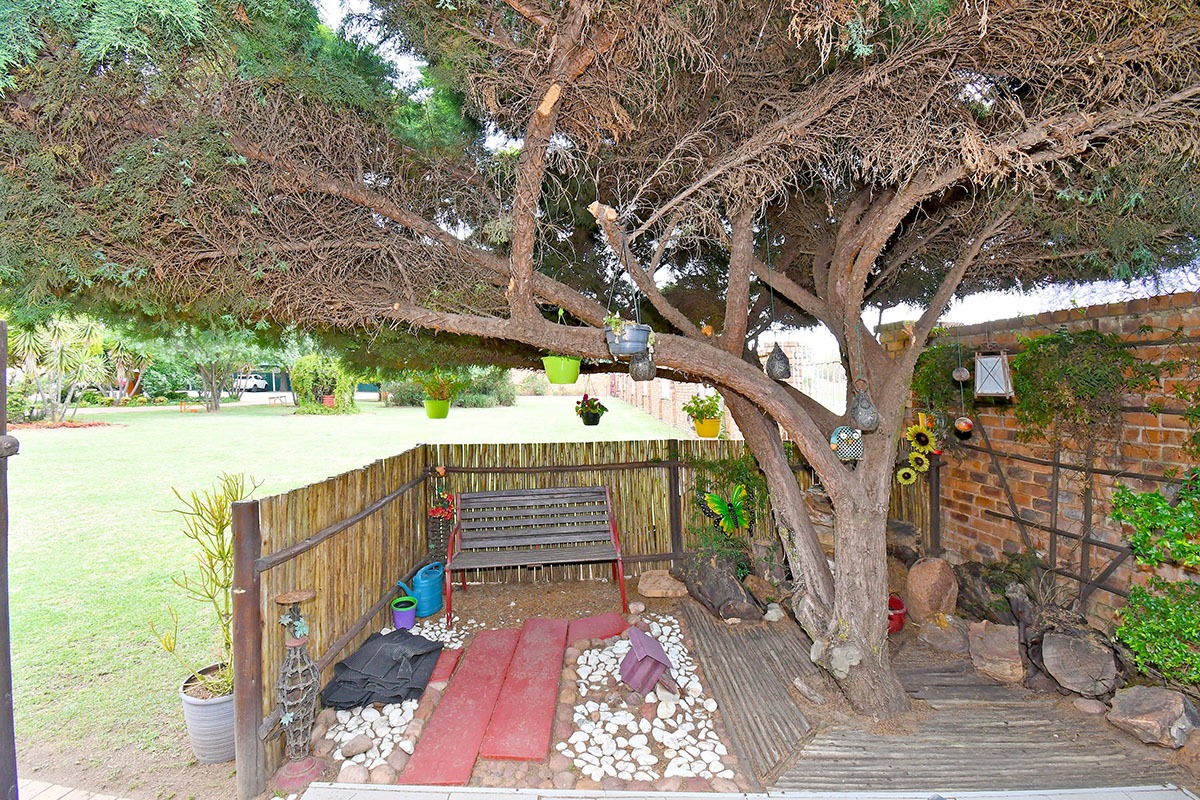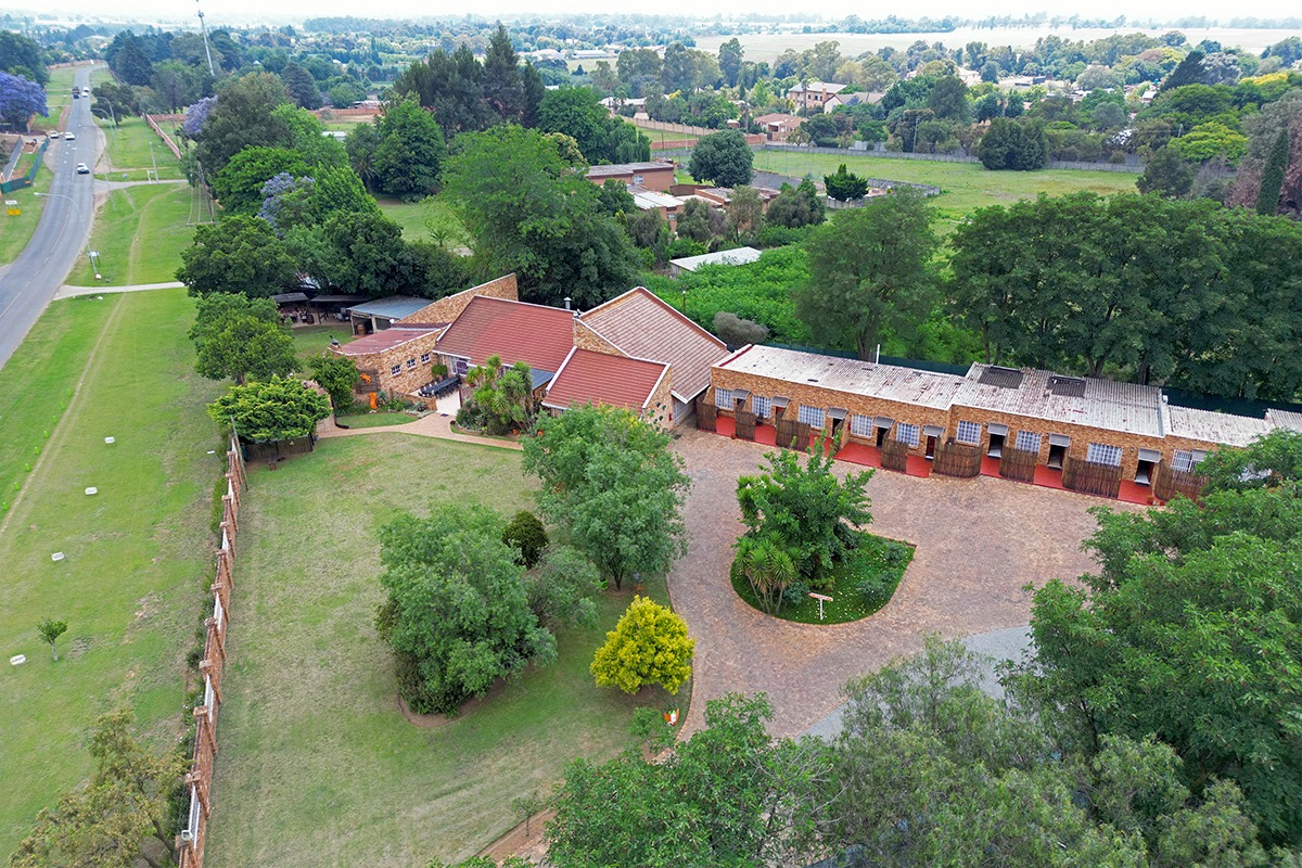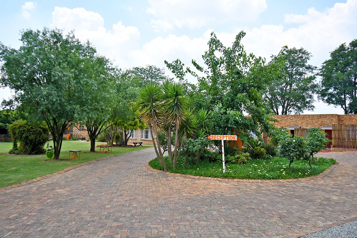 The property boasts meticulously maintained grounds, characterized by lush green lawns, mature trees providing ample shade, and vibrant landscaping that creates an inviting atmosphere. A prominent reception area, visible from the entrance, underscores its potential as a guest house or similar hospitality venture. Access is facilitated by extensive brick-paved driveways, leading to a significant 12 parking bays, ensuring convenience for both staff and visitors.