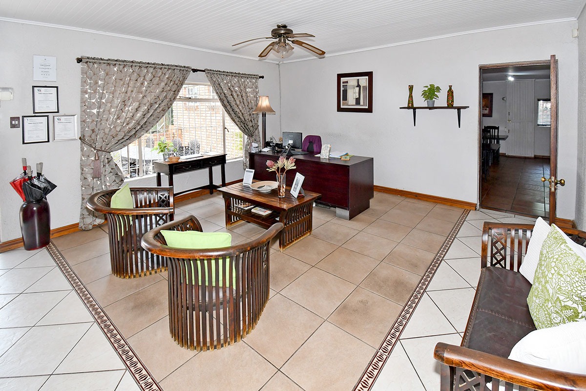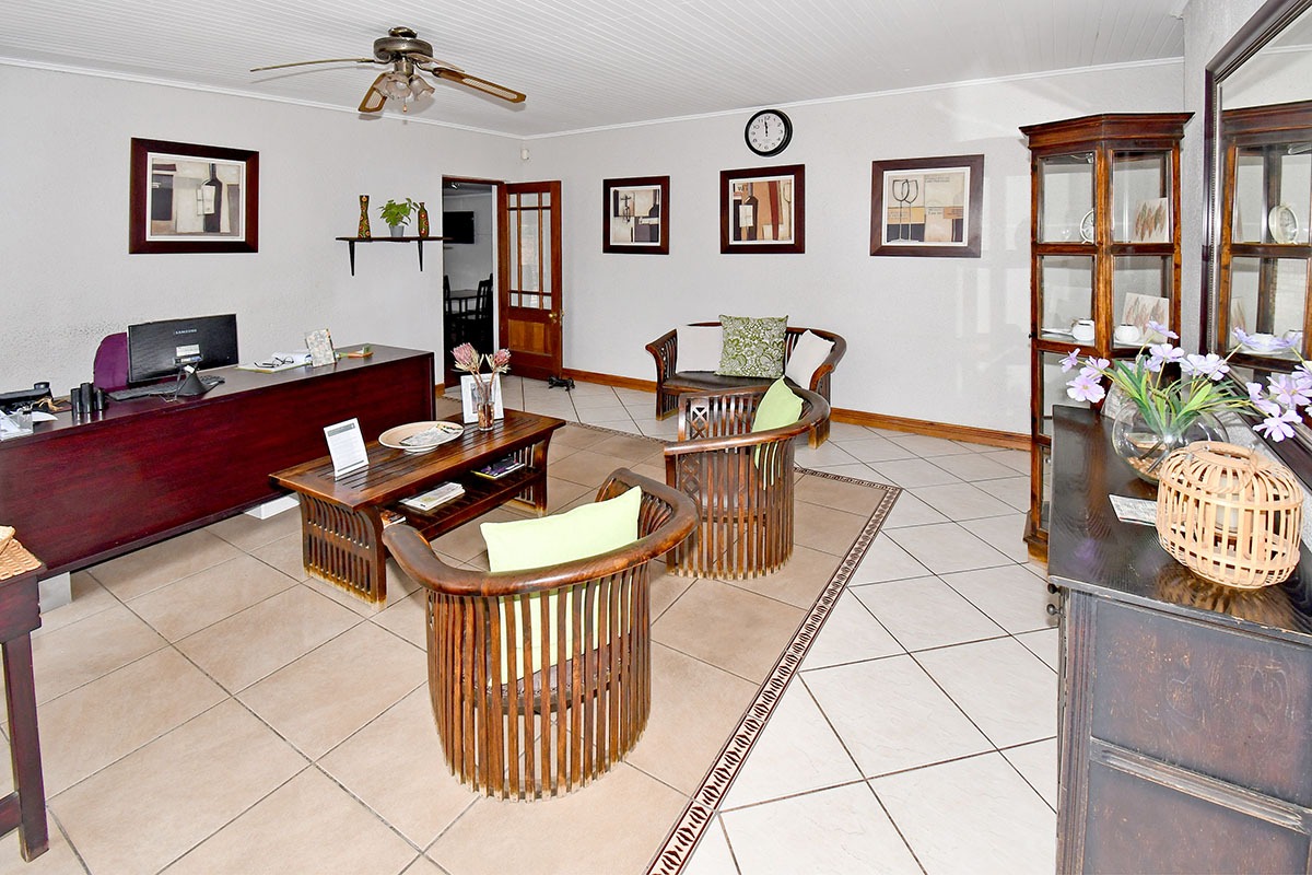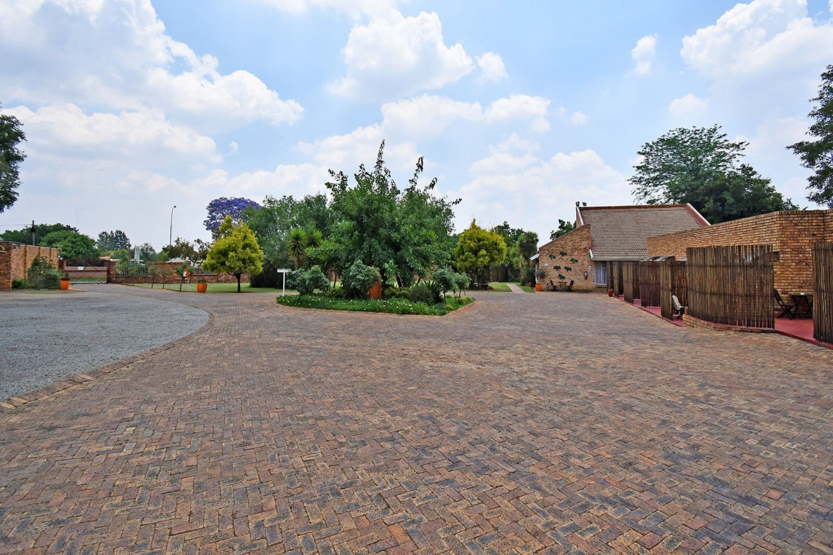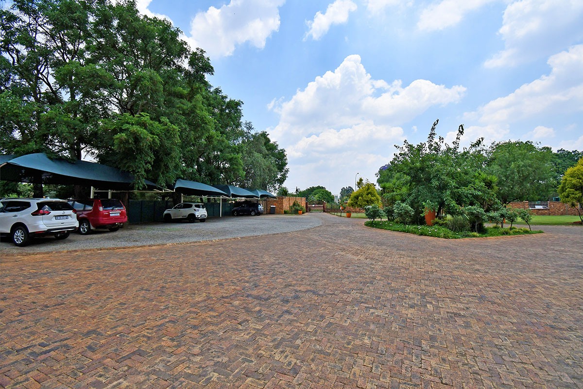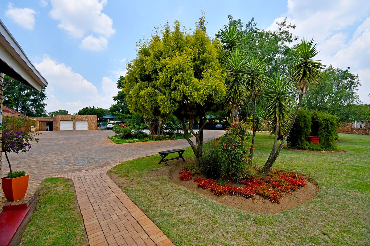 The property boasts meticulously maintained grounds, characterized by lush green lawns, mature trees providing ample shade, and vibrant landscaping that creates an inviting atmosphere. A prominent reception area, visible from the entrance, underscores its potential as a guest house or similar hospitality venture. Access is facilitated by extensive brick-paved driveways, leading to a significant 12 parking bays, ensuring convenience for both staff and visitors.
