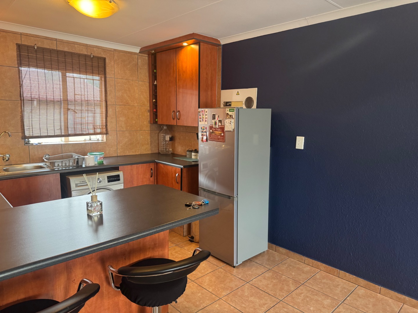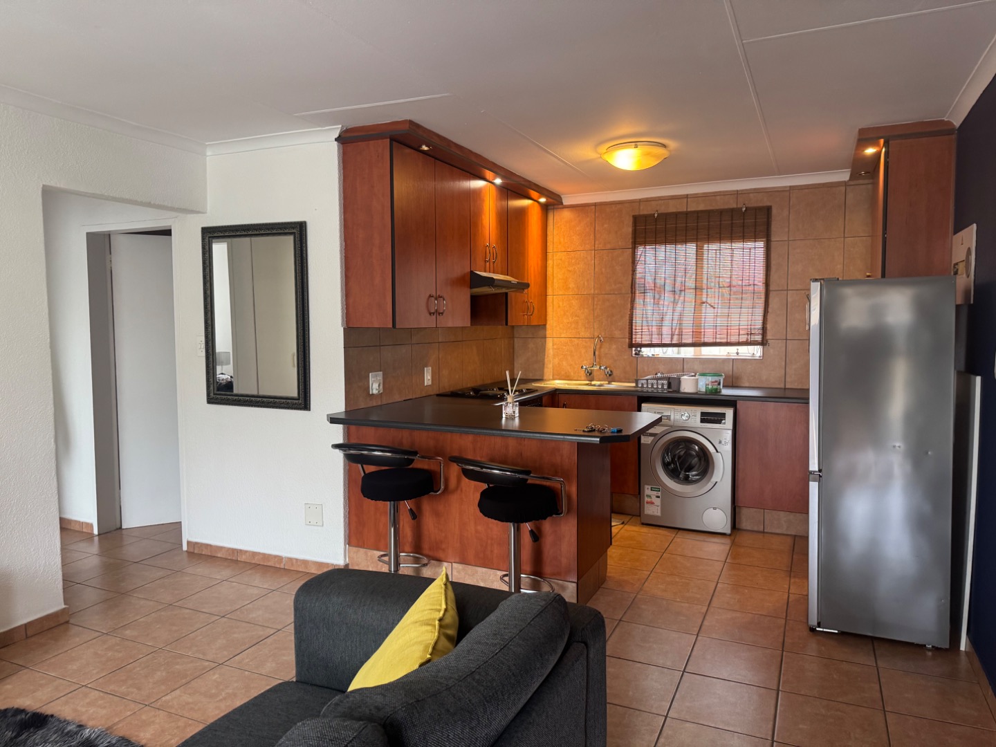 Very neat 2 bedroom and 1 bathroom flat, Open plan Kitchen, lounge, and and dining area. Kitchen was recently upgraded with a breakfast nook and washing machine connection. Bathroom with shower that is over the bath and enclosed with glass sliding door for not spilling water on the floor. This property is ready to move in. Fitted with a security gate at the front door. In complex is a lovely pool area with an enclosed space with a pool to use to entertain your family and friends. This need to be booked before hand. There is a designated washing line for everyone to use. 1 Covered car parking.