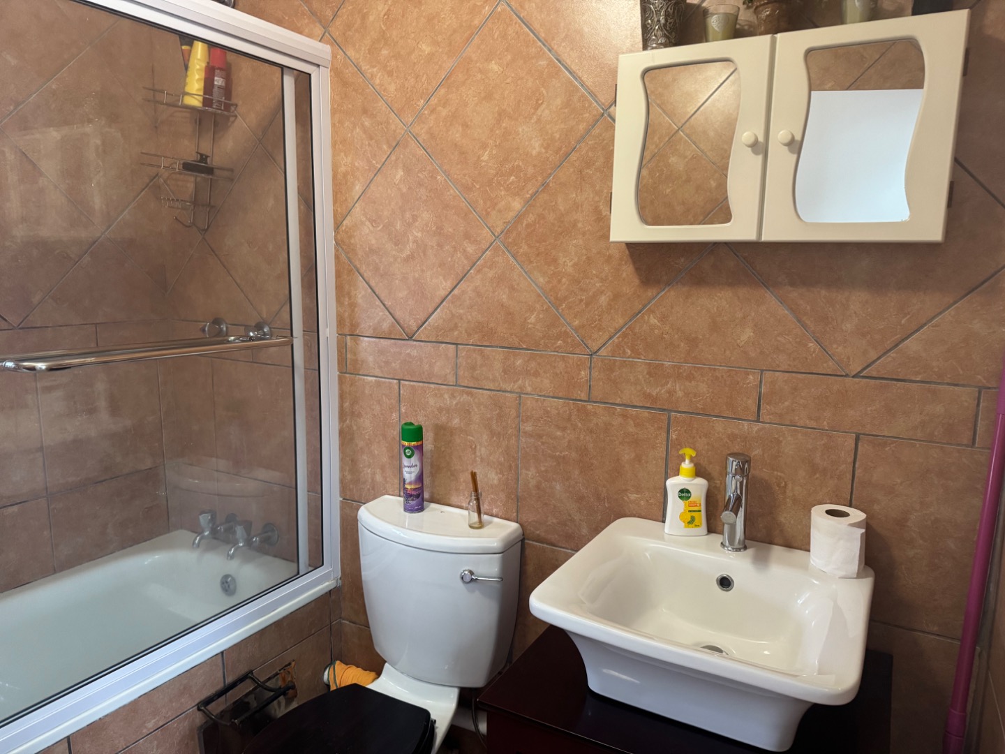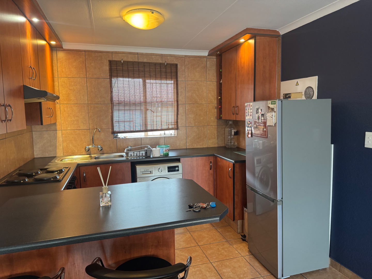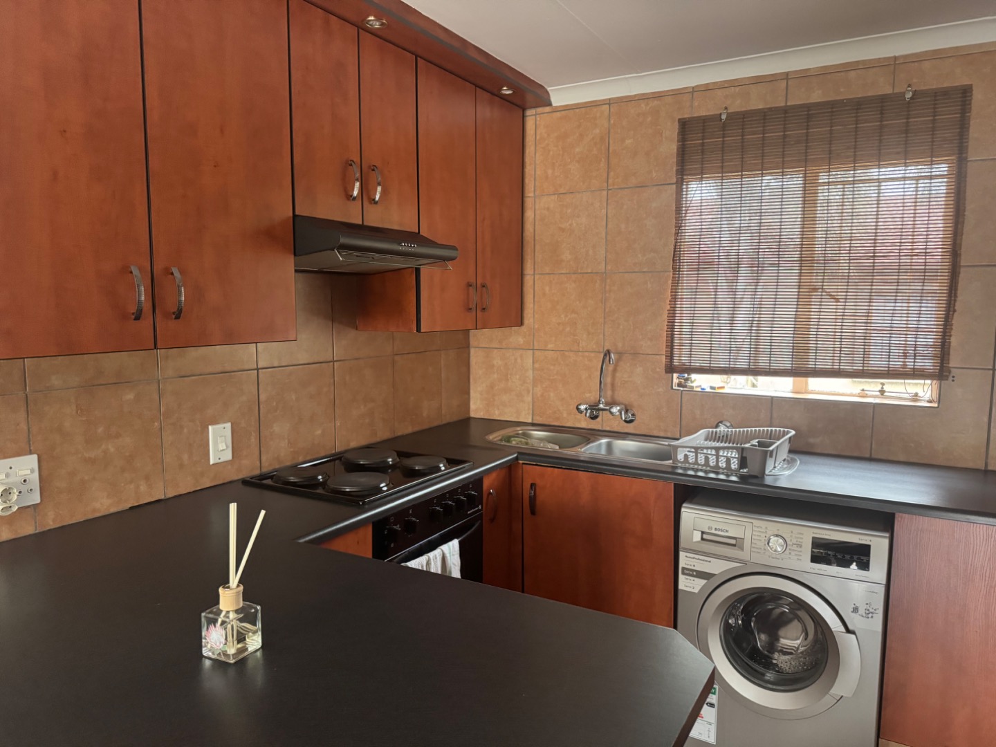 Very neat 2 bedroom and 1 bathroom flat, Open plan Kitchen, lounge, and and dining area. Kitchen was recently upgraded with a breakfast nook and washing machine connection. Bathroom with shower that is over the bath and enclosed with glass sliding door for not spilling water on the floor. This property is ready to move in. Fitted with a security gate at the front door. In complex is a lovely pool area with an enclosed space with a pool to use to entertain your family and friends. This need to be booked before hand. There is a designated washing line for everyone to use. 1 Covered car parking.