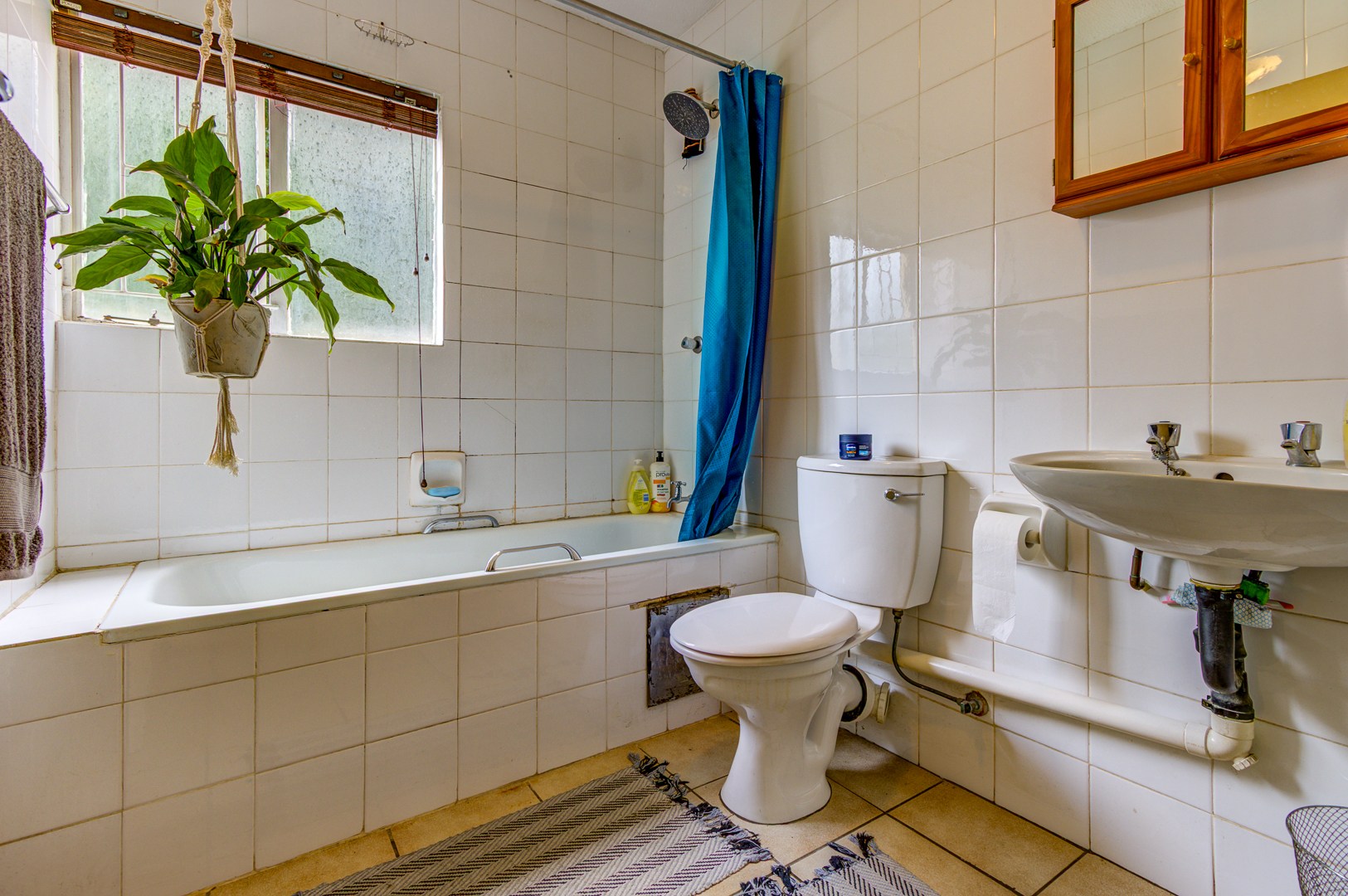 The sparkling bathroom has a bath, overhead shower, basin and toilet.