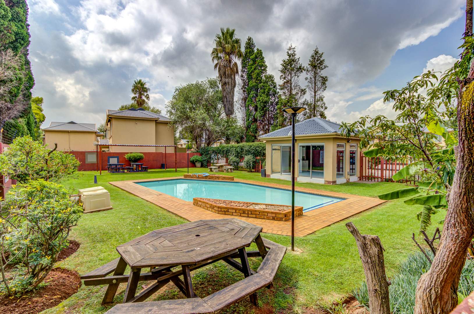 The complex is well maintained with a communal swimming pool and clubhouse for the residents.