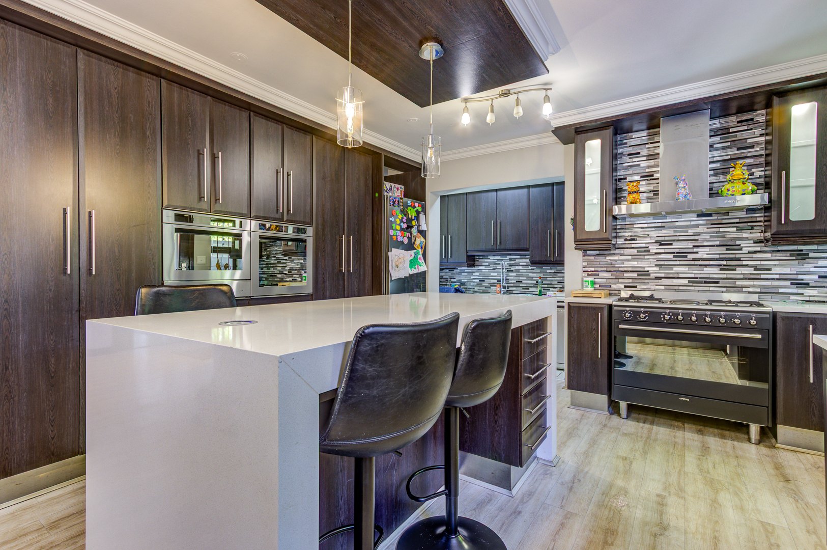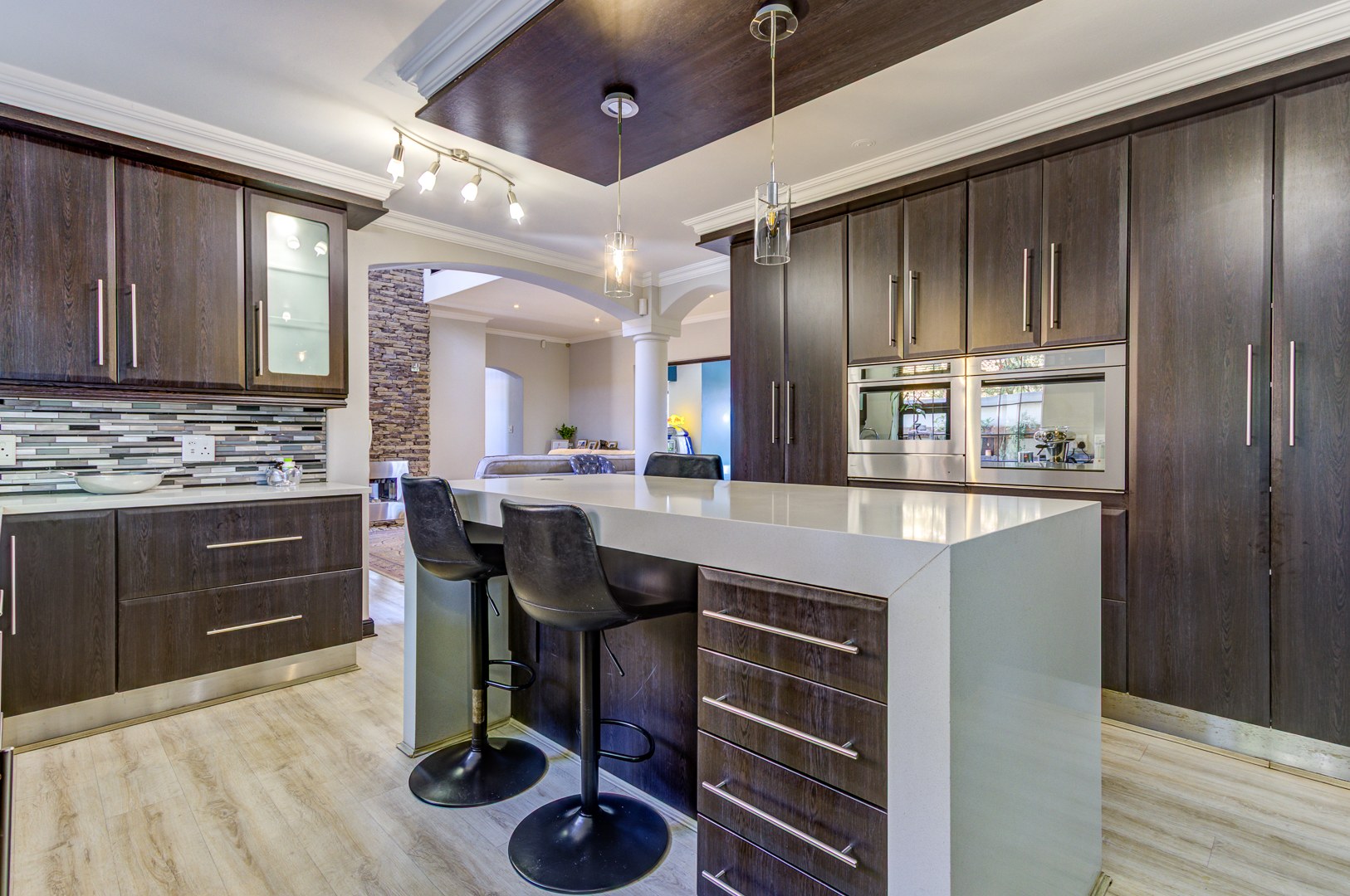Stunning gourmet kitchen with beautiful solid cupboards plus Caesar stone tops and a Centre Island, LED lighting, microwave oven and built in gas and electric stove/hob, piped gas, pop-up plug point, dishwasher connection., large scullery.