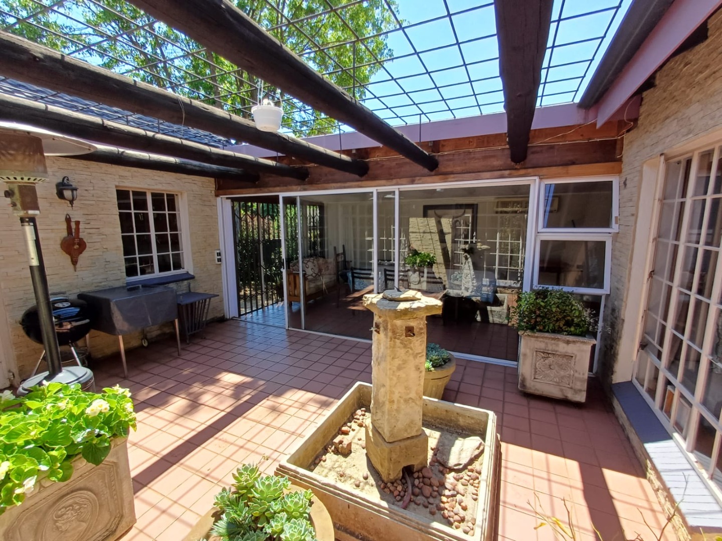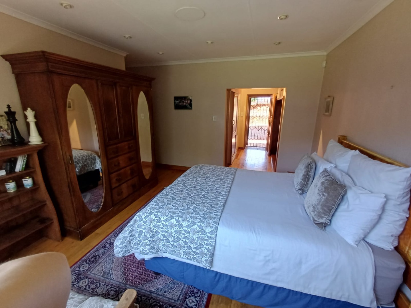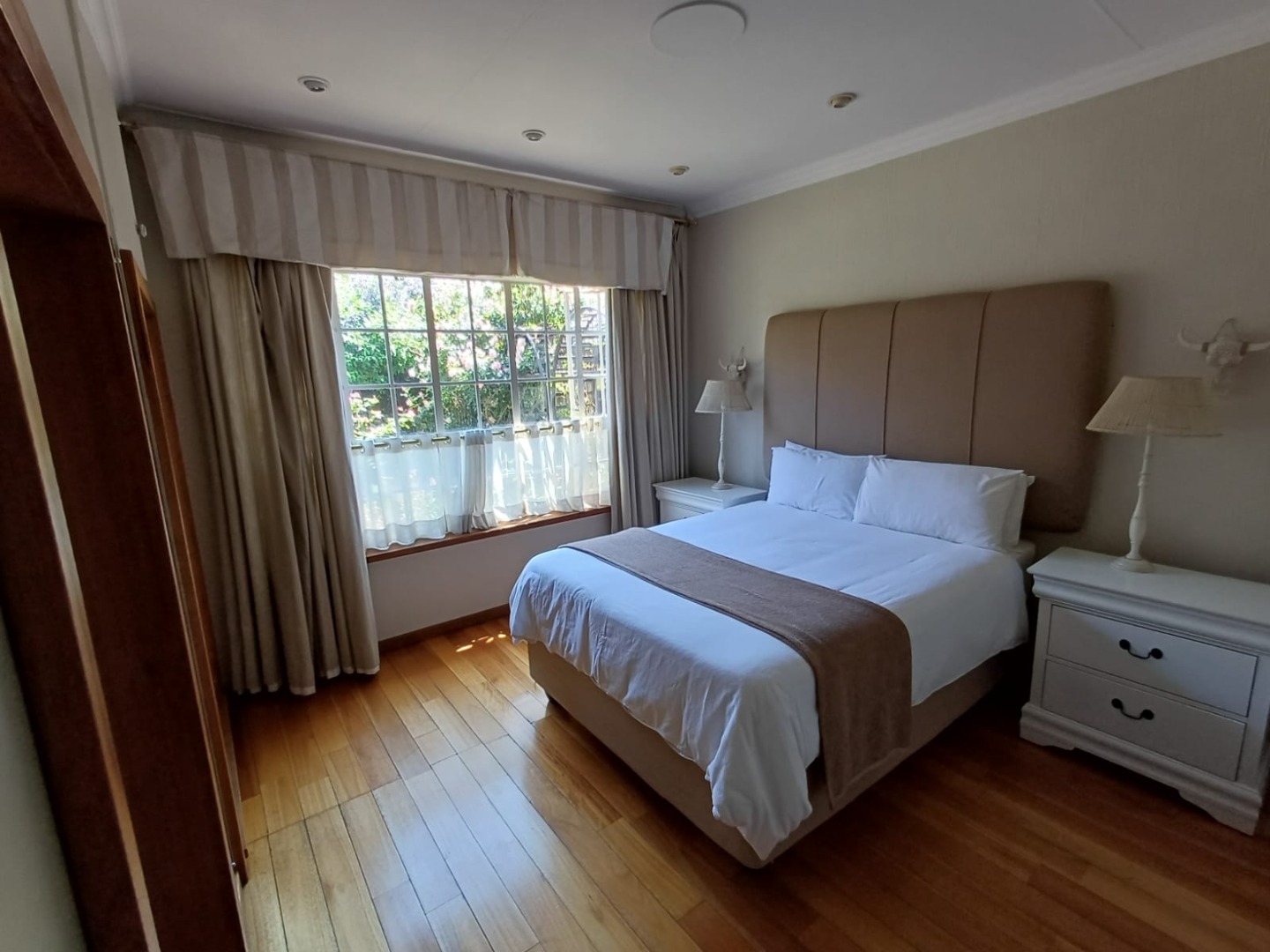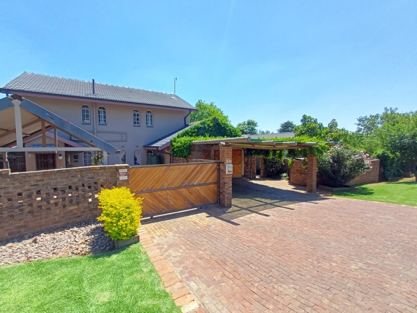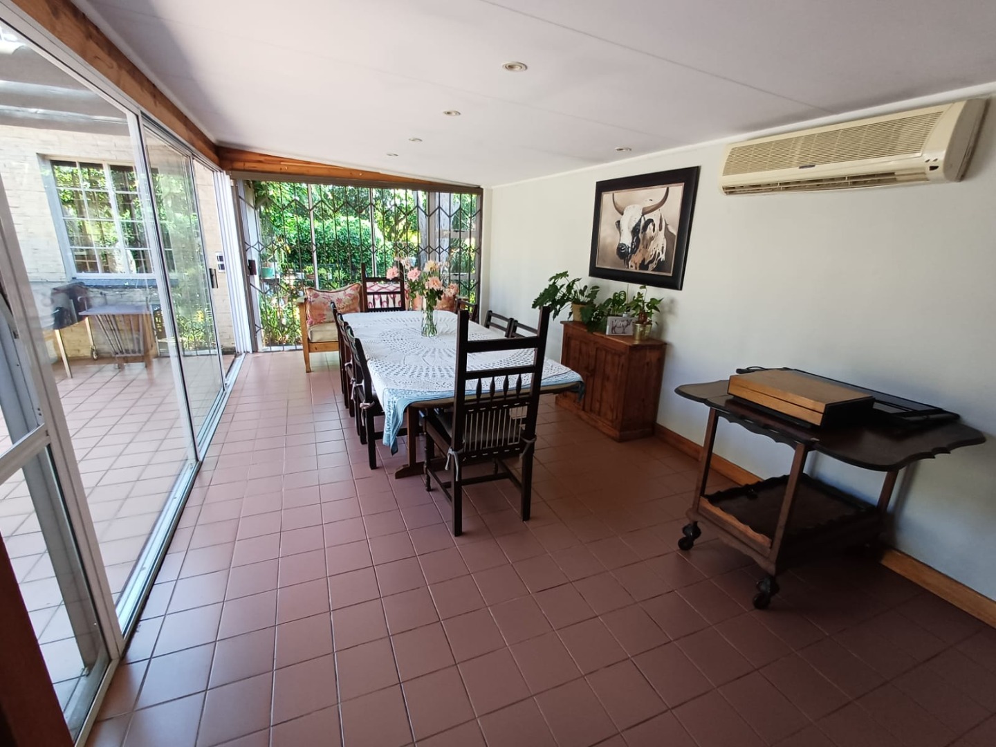 Outdoor living is enhanced by a private patio and a balcony, offering versatile spaces for relaxation. The property includes a well-maintained garden with an irrigation system and borehole, ensuring lush greenery year-round. Paved areas provide ample space, leading to two garages and four additional parking bays. Domestic rooms are available, and pets are welcome, making this a truly family-friendly environment.