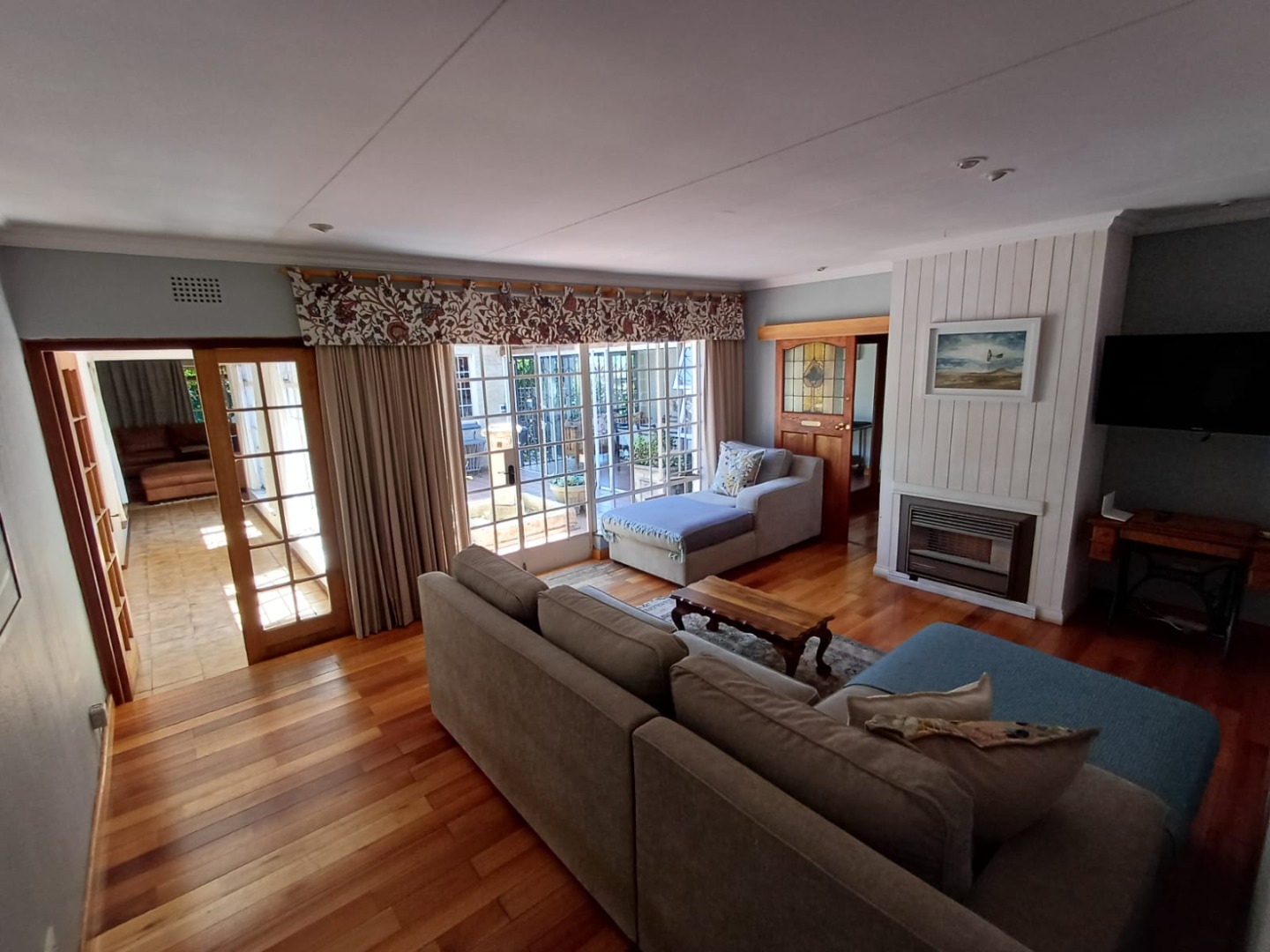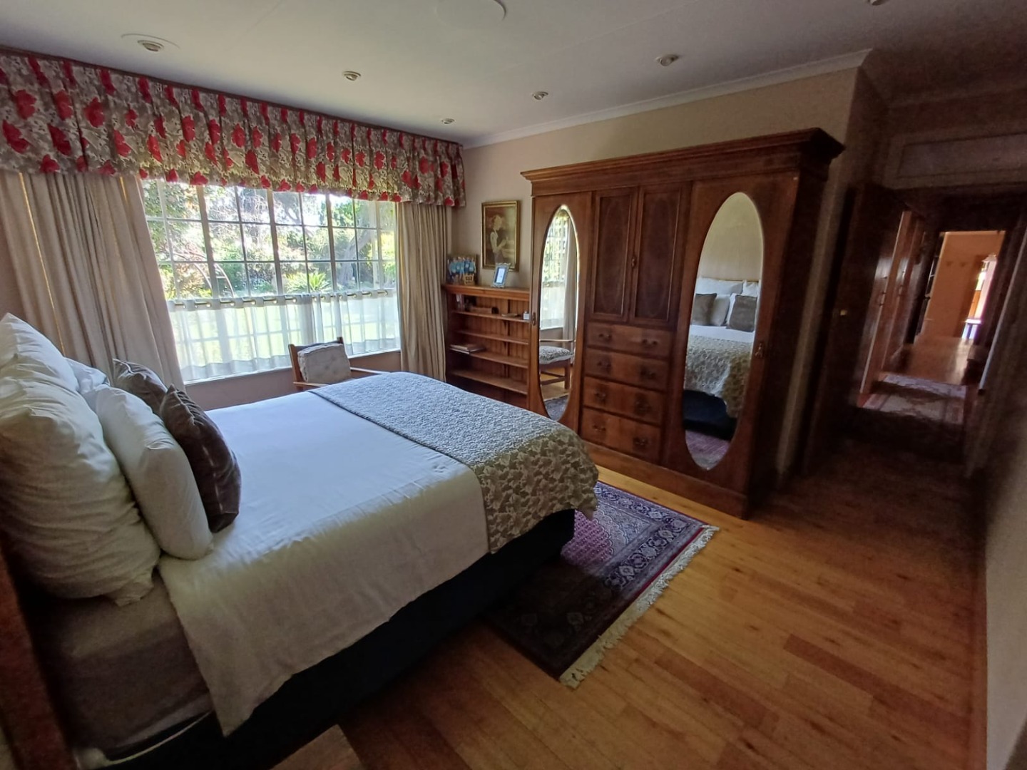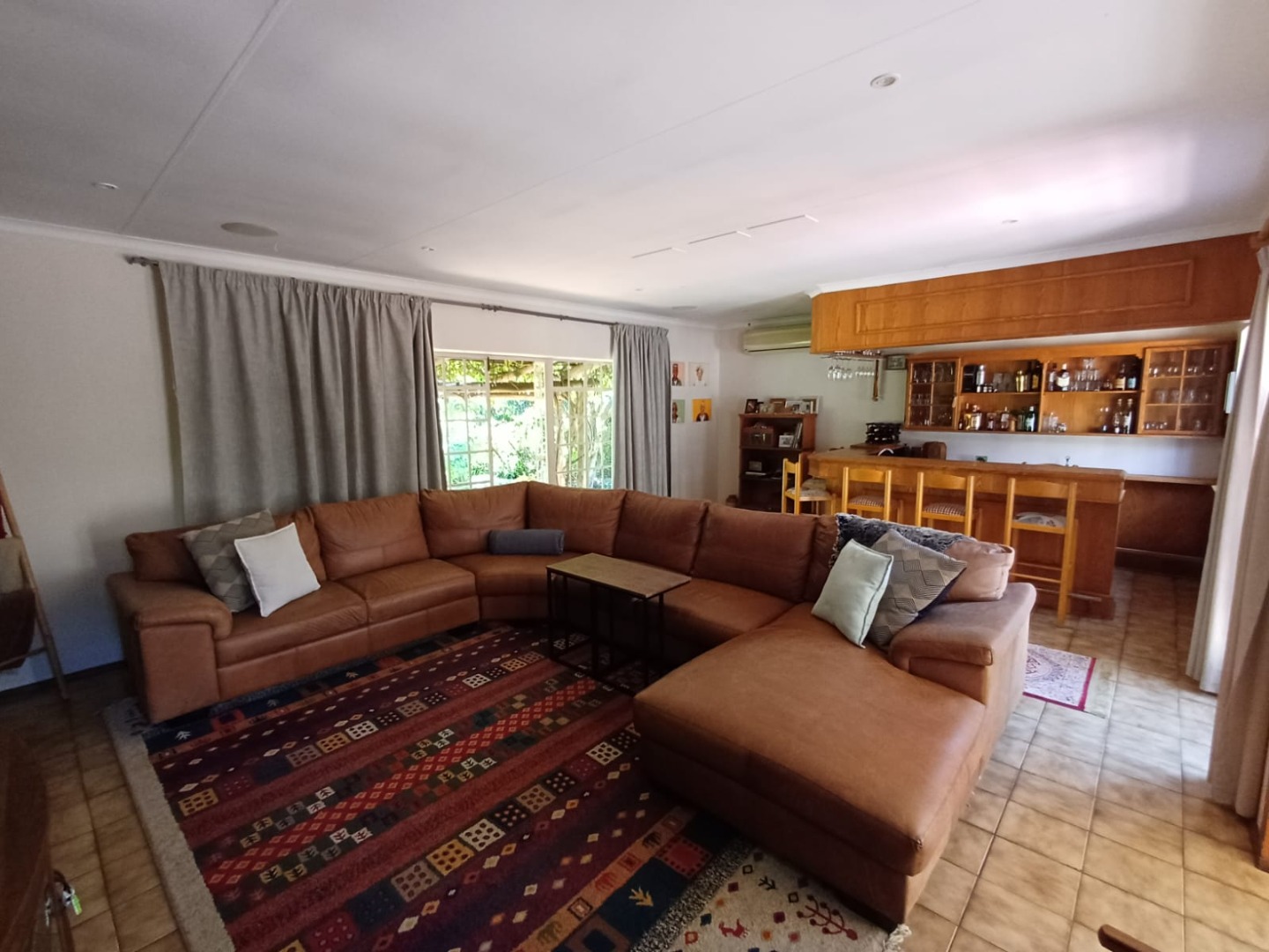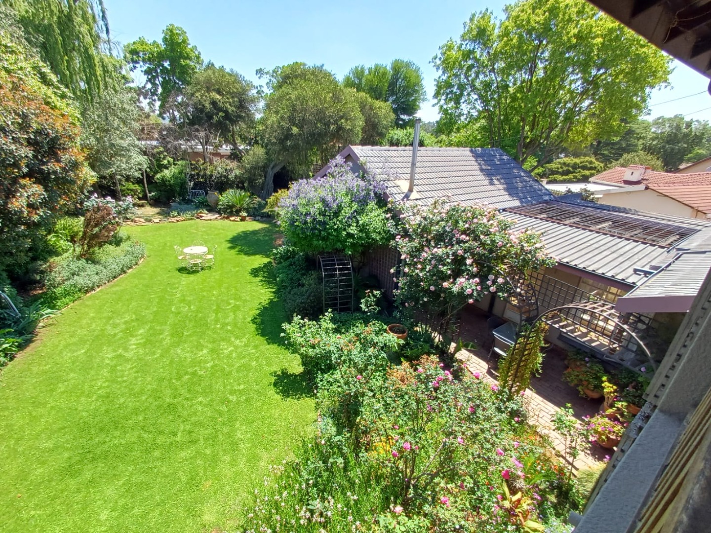 Outdoor living is enhanced by a private patio and a balcony, offering versatile spaces for relaxation. The property includes a well-maintained garden with an irrigation system and borehole, ensuring lush greenery year-round. Paved areas provide ample space, leading to two garages and four additional parking bays. Domestic rooms are available, and pets are welcome, making this a truly family-friendly environment.