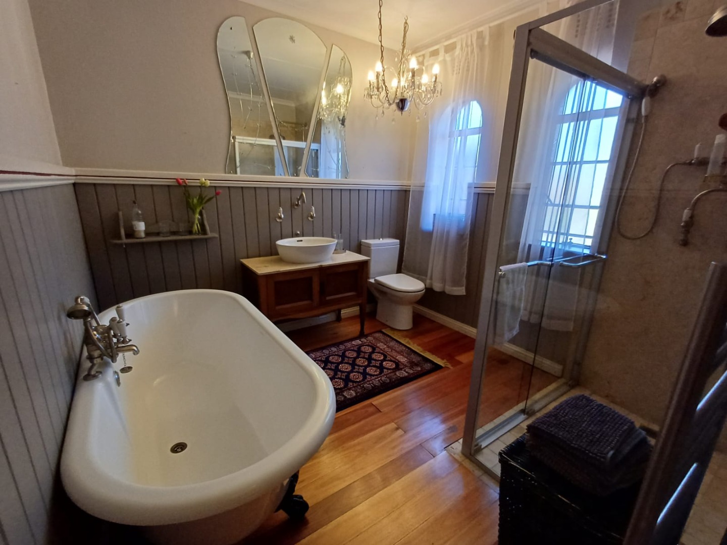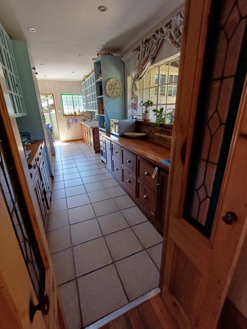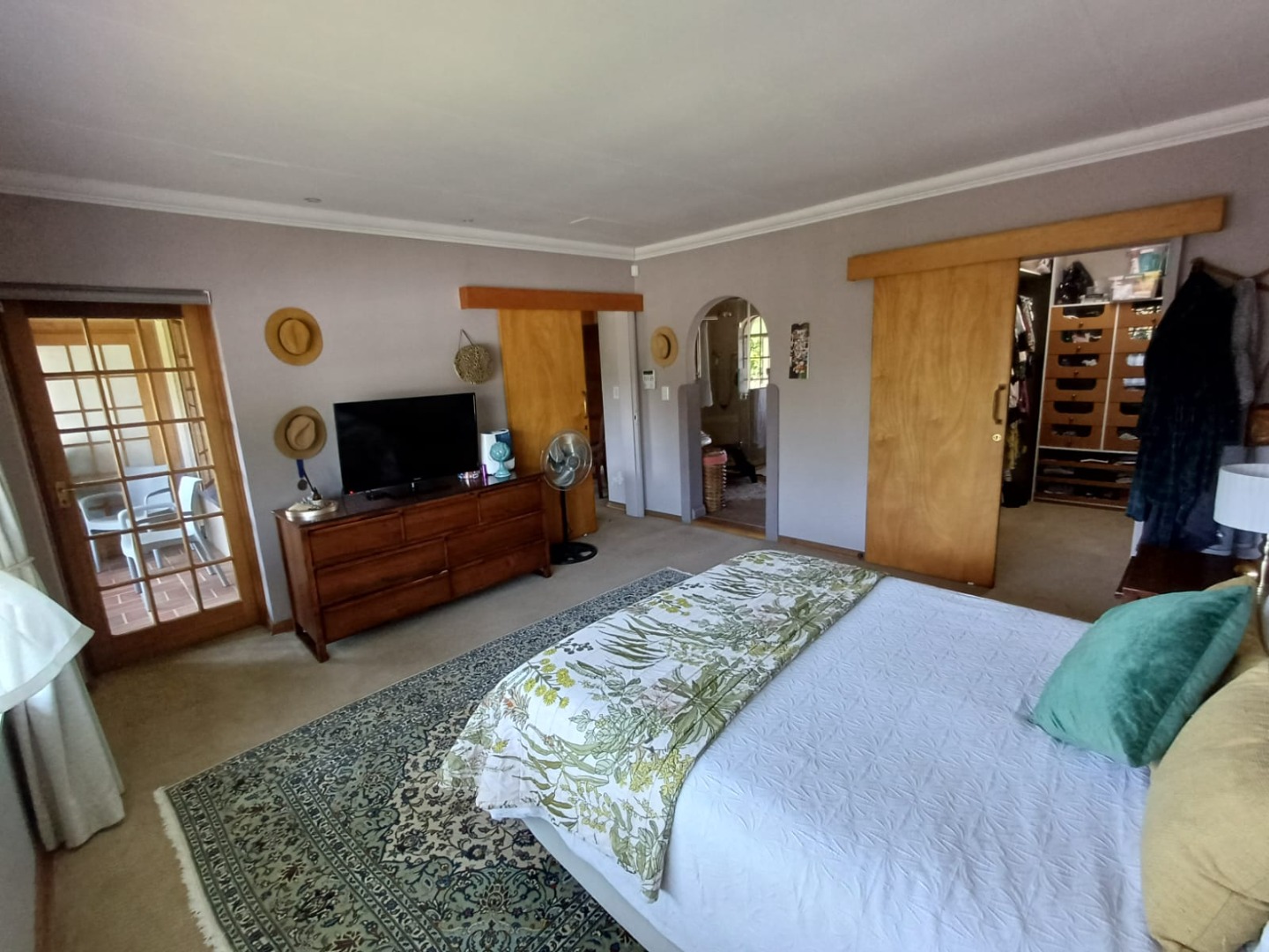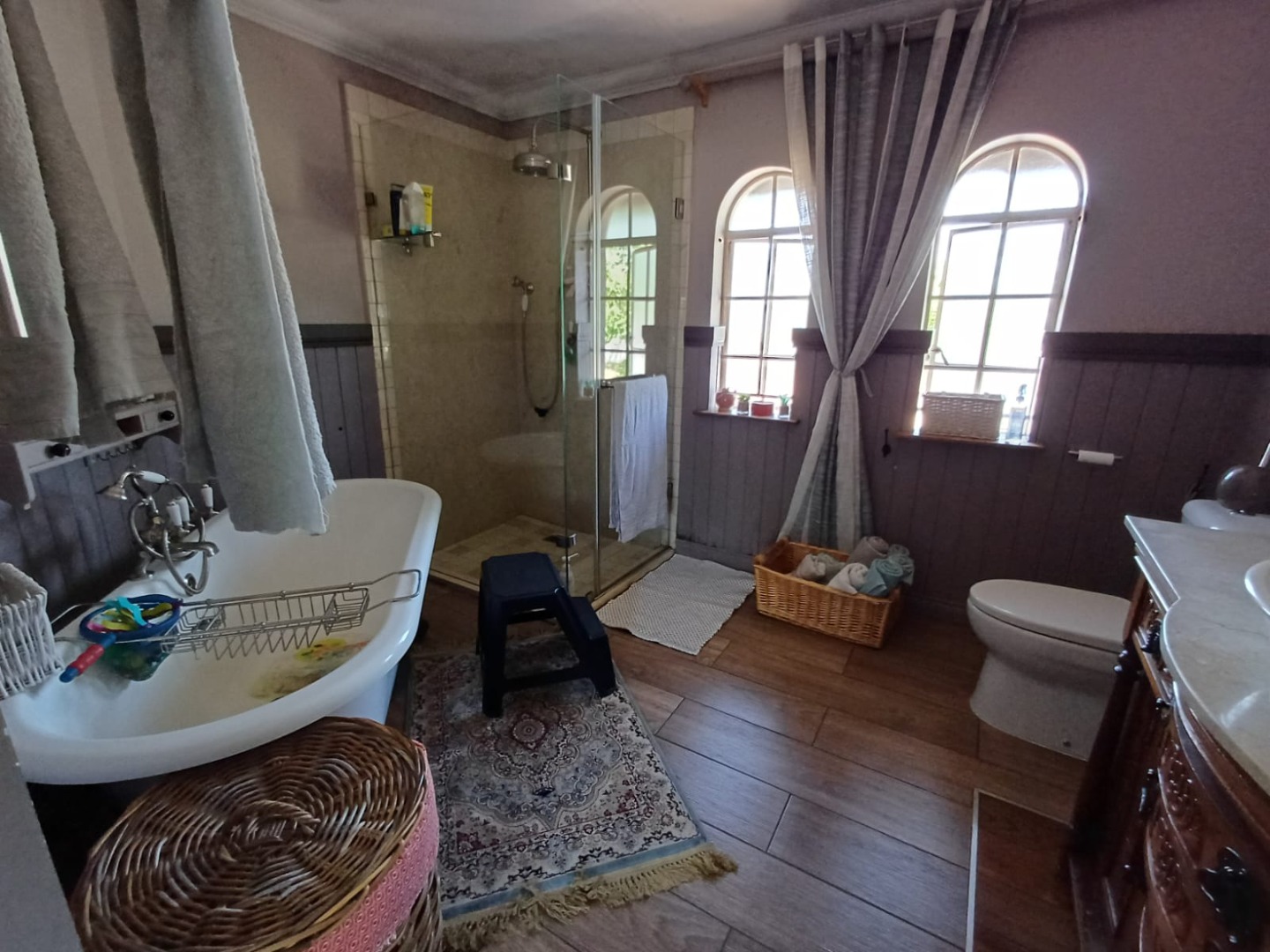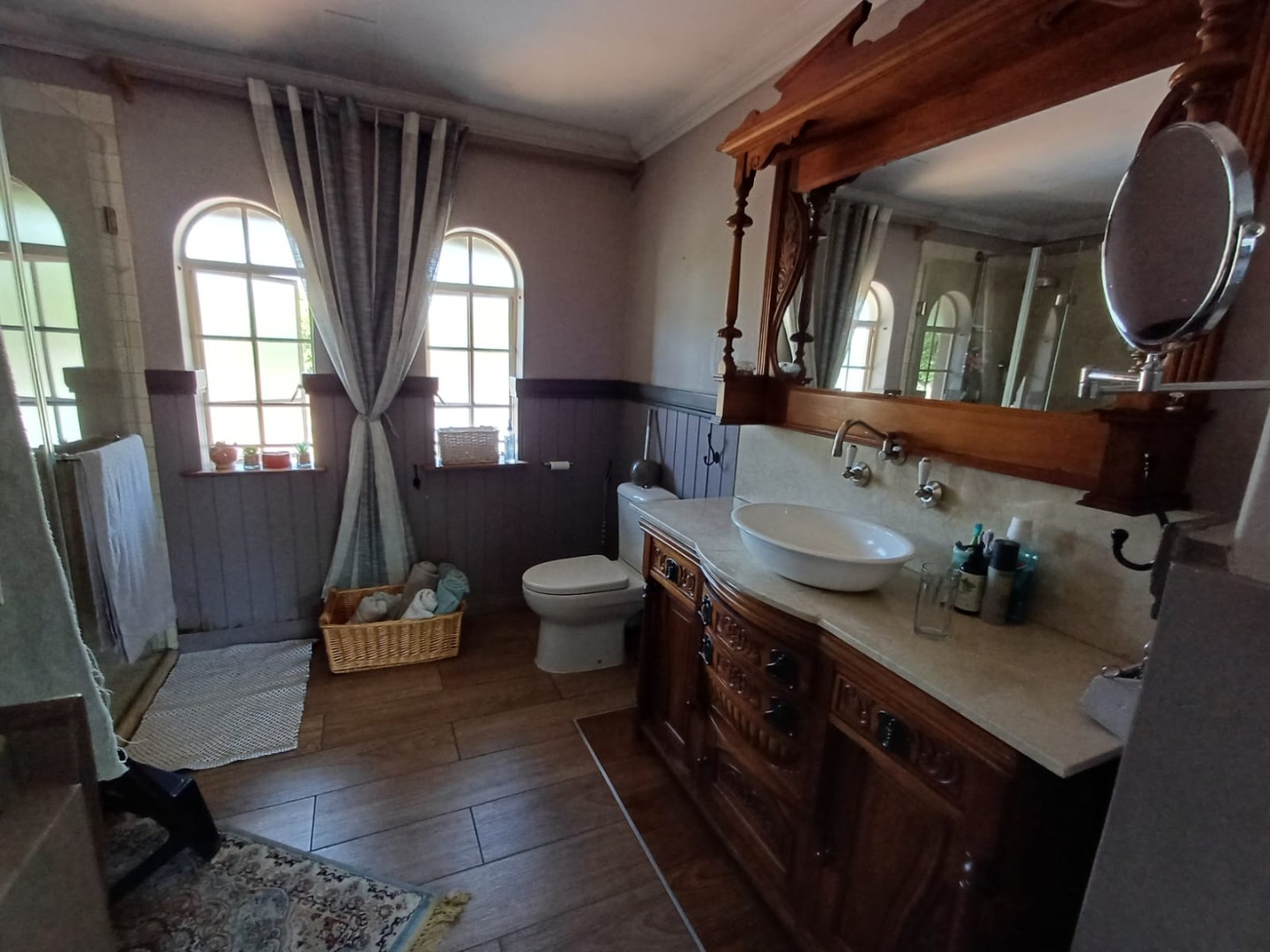 Outdoor living is enhanced by a private patio and a balcony, offering versatile spaces for relaxation. The property includes a well-maintained garden with an irrigation system and borehole, ensuring lush greenery year-round. Paved areas provide ample space, leading to two garages and four additional parking bays. Domestic rooms are available, and pets are welcome, making this a truly family-friendly environment.