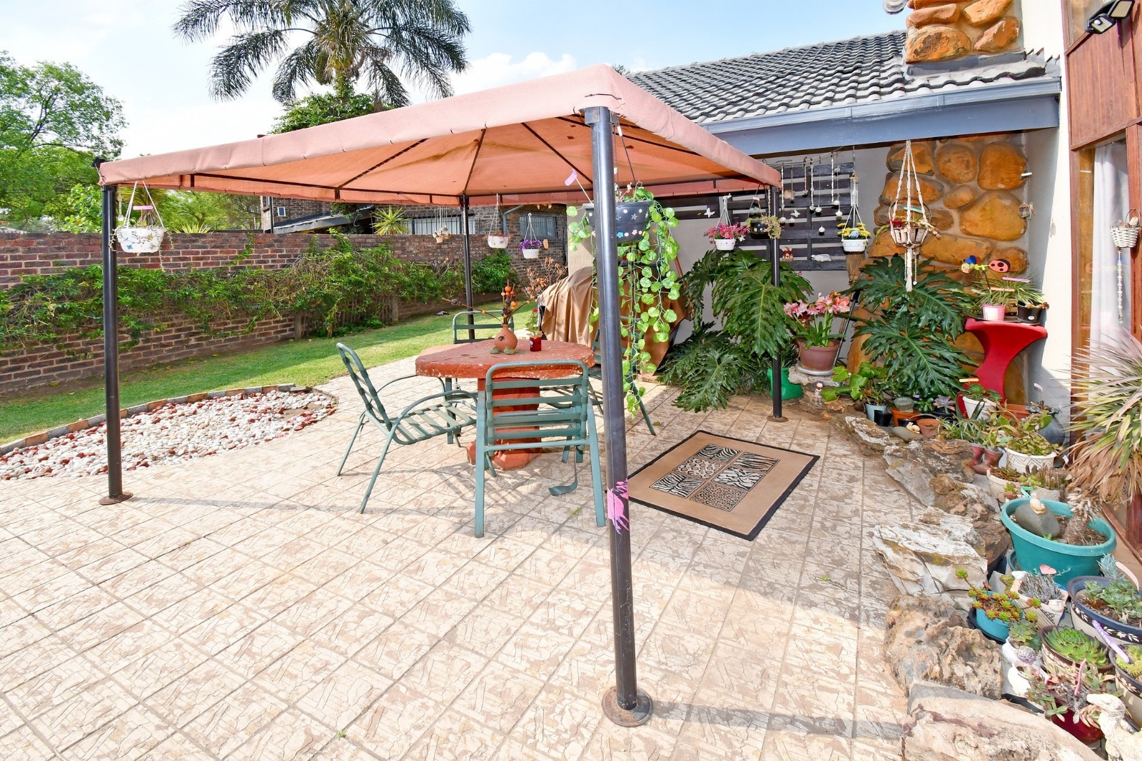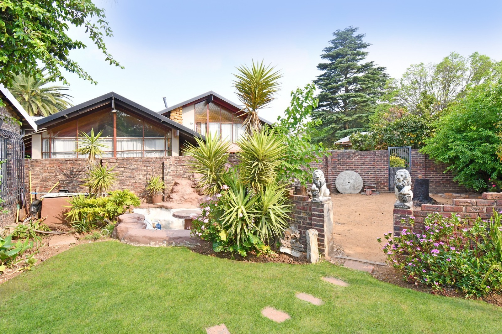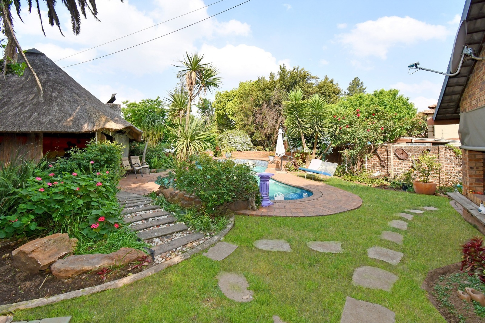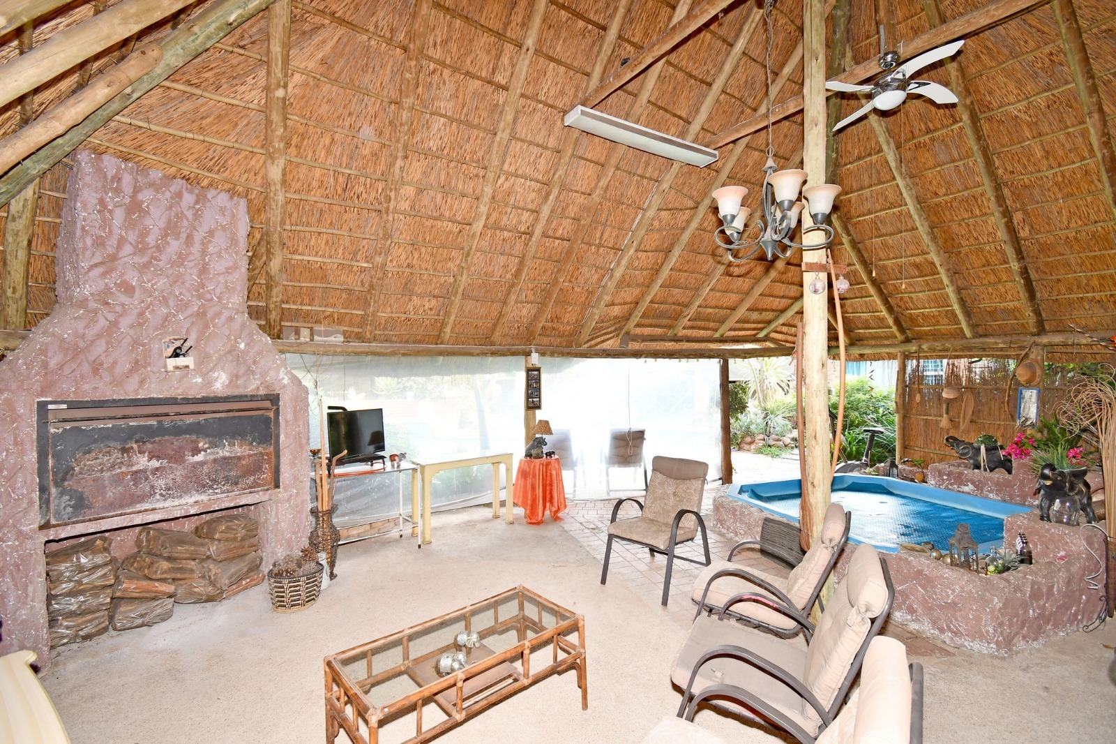 The entertainment area is a standout feature, offering a 72 m² thatched lapa with built-in braai and jacuzzi, overlooking a 60 000L swimming pool. A tranquil waterfall pond, firepit, and outdoor bathroom complete this inviting outdoor setting.