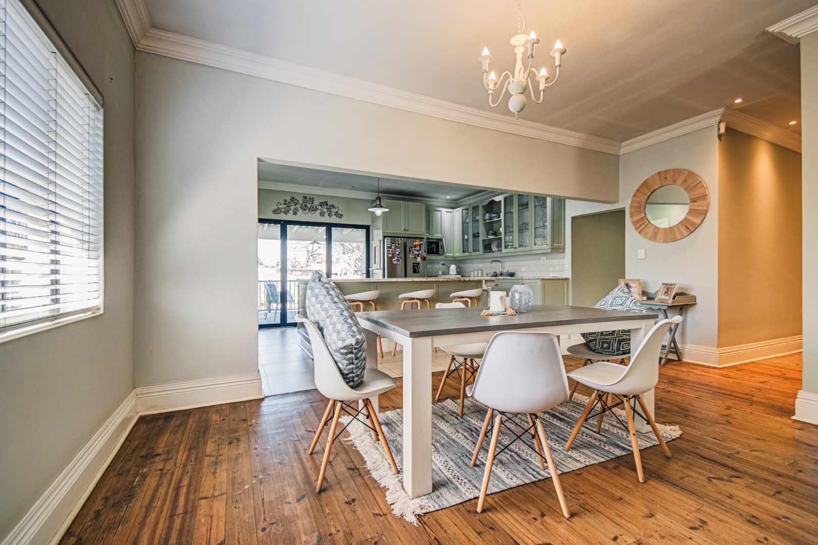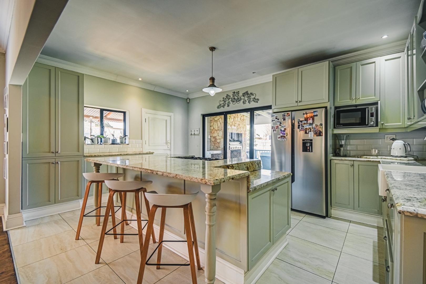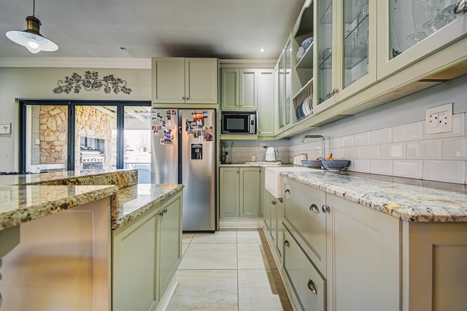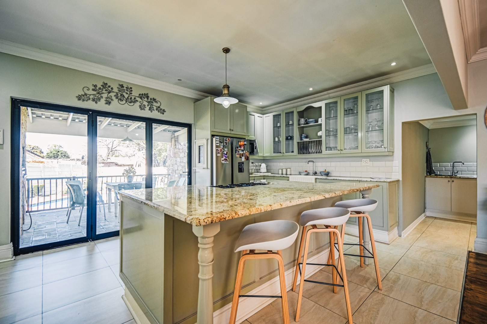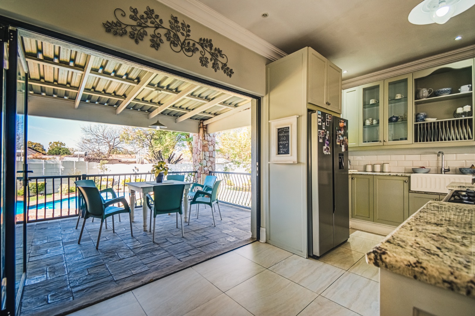 As you meander through this home, there is a beautifully tiled entrance hall that flows onto a rich and warm lounge with wooden floors and a gas fireplace (that services the diningroom and lounge. The open plan kitchen is absolutely stunning with granite tops a gas hob, country sink and space for a double door fridge. There is a separate scullery. The kitchen opens with gorgeous aluminium stacker doors onto an under cover patio with beautiful stonework as well as a gas braai. It overlooks a manicured back garden and blue, blue pool. Outside there is also a built in boma for those evening conversations with friends and family,